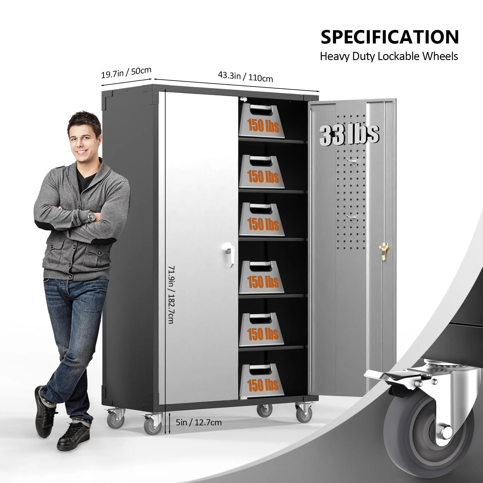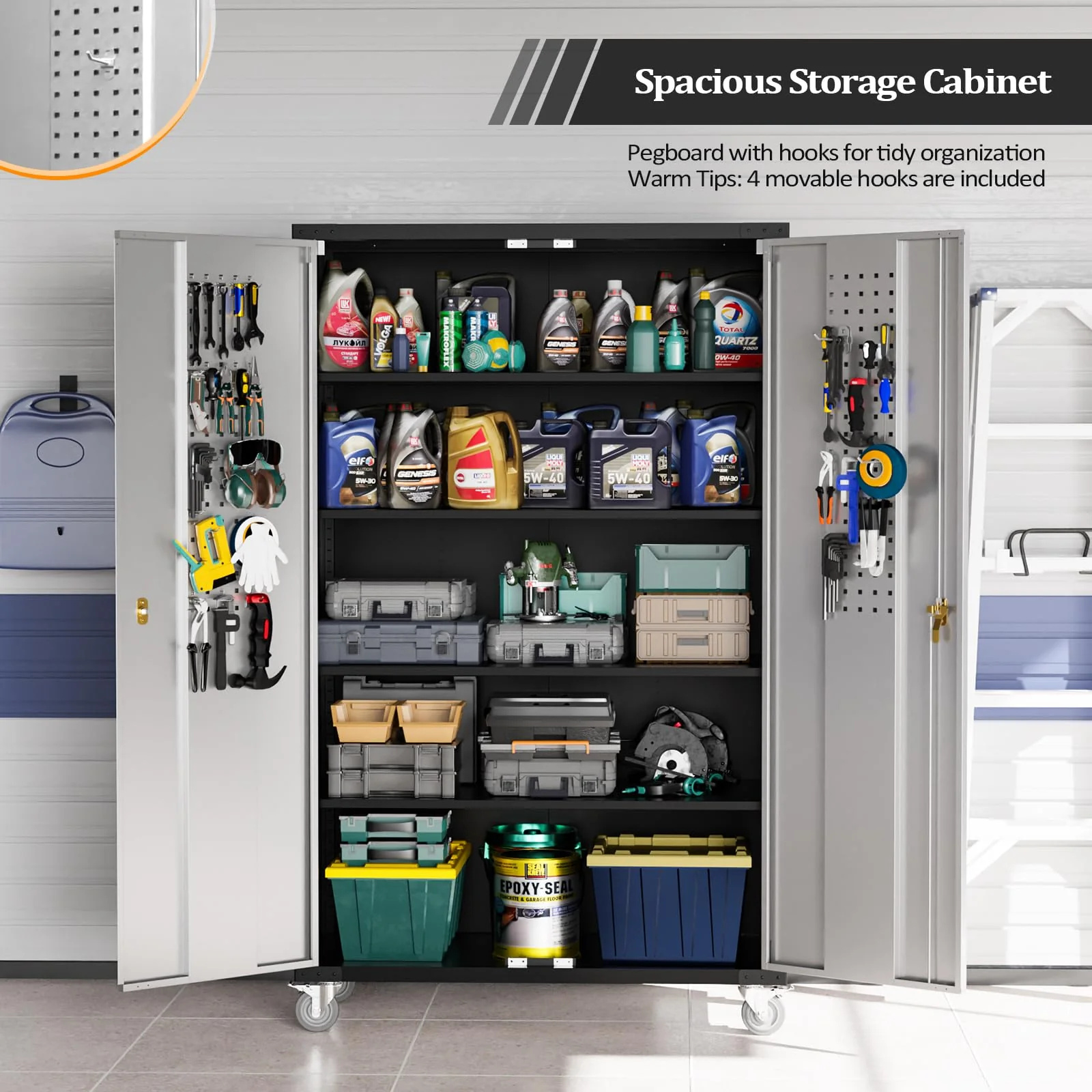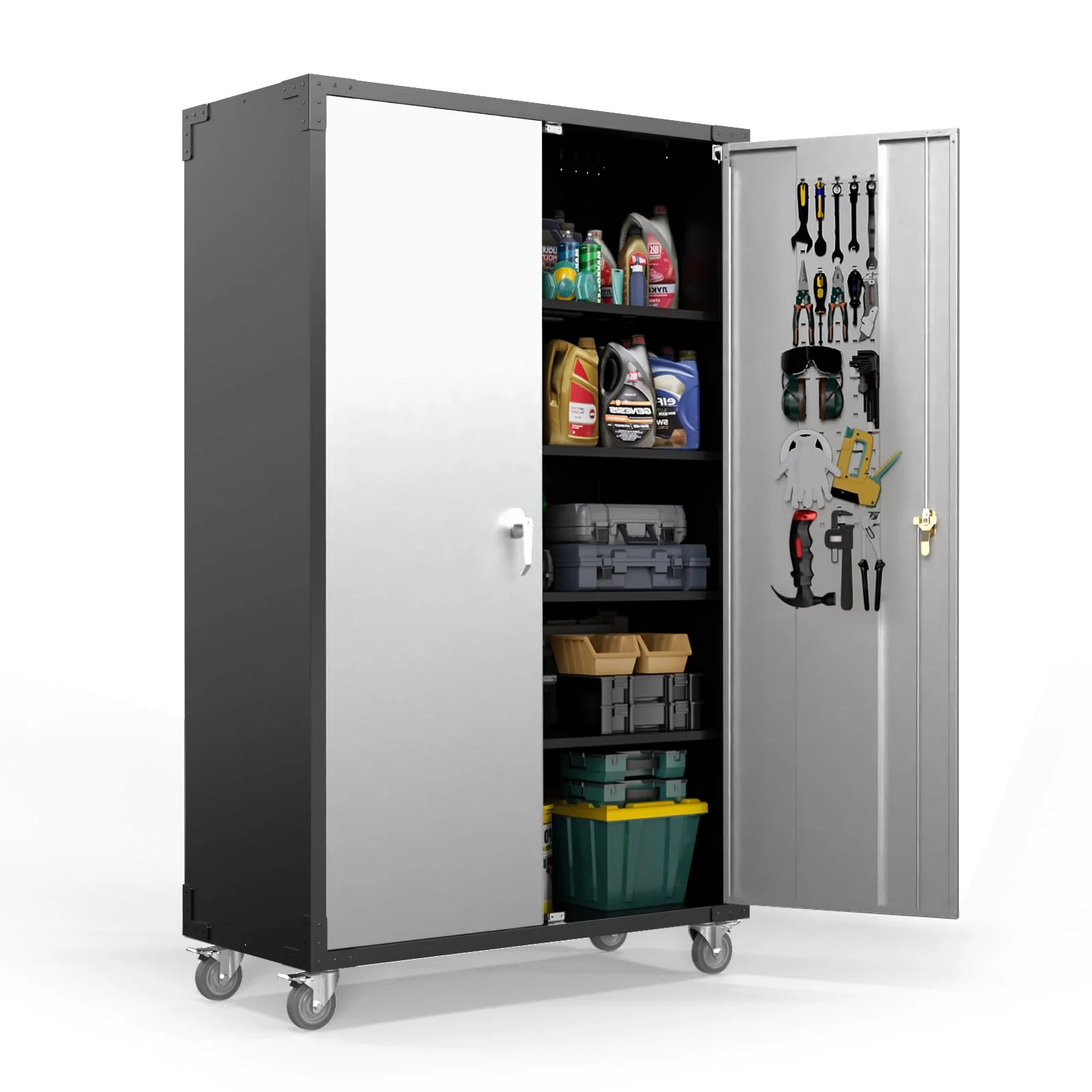 featuring 4 adjustable shelves and 2 built-in pegboards on both locking