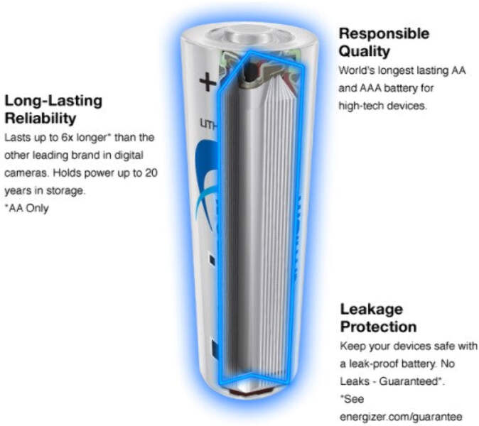 Nothing outlasts Energizer® Ultimate Lithium™ AA batteries. The Energizer® Ultimate Lithium™ batteries are the #1 longest-lasting AA batteries – complete with leak resistance and performance in extreme temperatures (-40ºF to 140ºF or -40ºC to 60ºC). To ensure your favourite devices operate at their peak performance, depend on Energizer® Ultimate Lithium™ batteries for work, play and home.