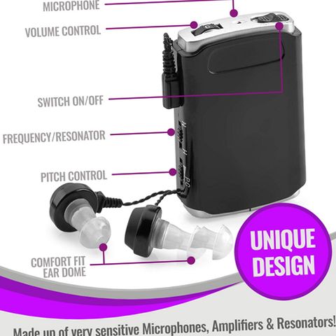 The MEDca Pocket Sound Black Amplifier is engineered to enhance your hearing experience with high-quality sound amplification suitable for a wide range of activities and environments. This personal sound amplifier features advanced solid-state microelectronic circuitry that delivers clear and crisp audio with minimal distortion. It includes two sets of premium mono and stereo earbuds with built-in microphones, allowing users to choose between single-ear or dual-ear listening modes for personalized comfort and effectiveness. The device's compact design fits easily into the smallest pockets and comes with a belt clip for convenient portability. With a frequency range of 450 to 3500 Hz and an input noise level below 30 dB, it captures ambient sounds accurately while amplifying important audio signals. The amplifier operates on a single AAA battery, providing up to 30 hours of continuous use, ensuring long-lasting performance without frequent battery changes. Ideal for seniors, birdwatchers, sports enthusiasts, theatergoers, and anyone needing enhanced hearing support in various settings, this device combines functionality with ease of use. Its durable construction and sensitive microphones make it reliable in diverse environments such as hospitals, courtrooms, churches, and outdoor activities. Experience improved sound clarity and engagement with the MEDca Pocket Sound Black Amplifier's innovative design and superior audio quality.