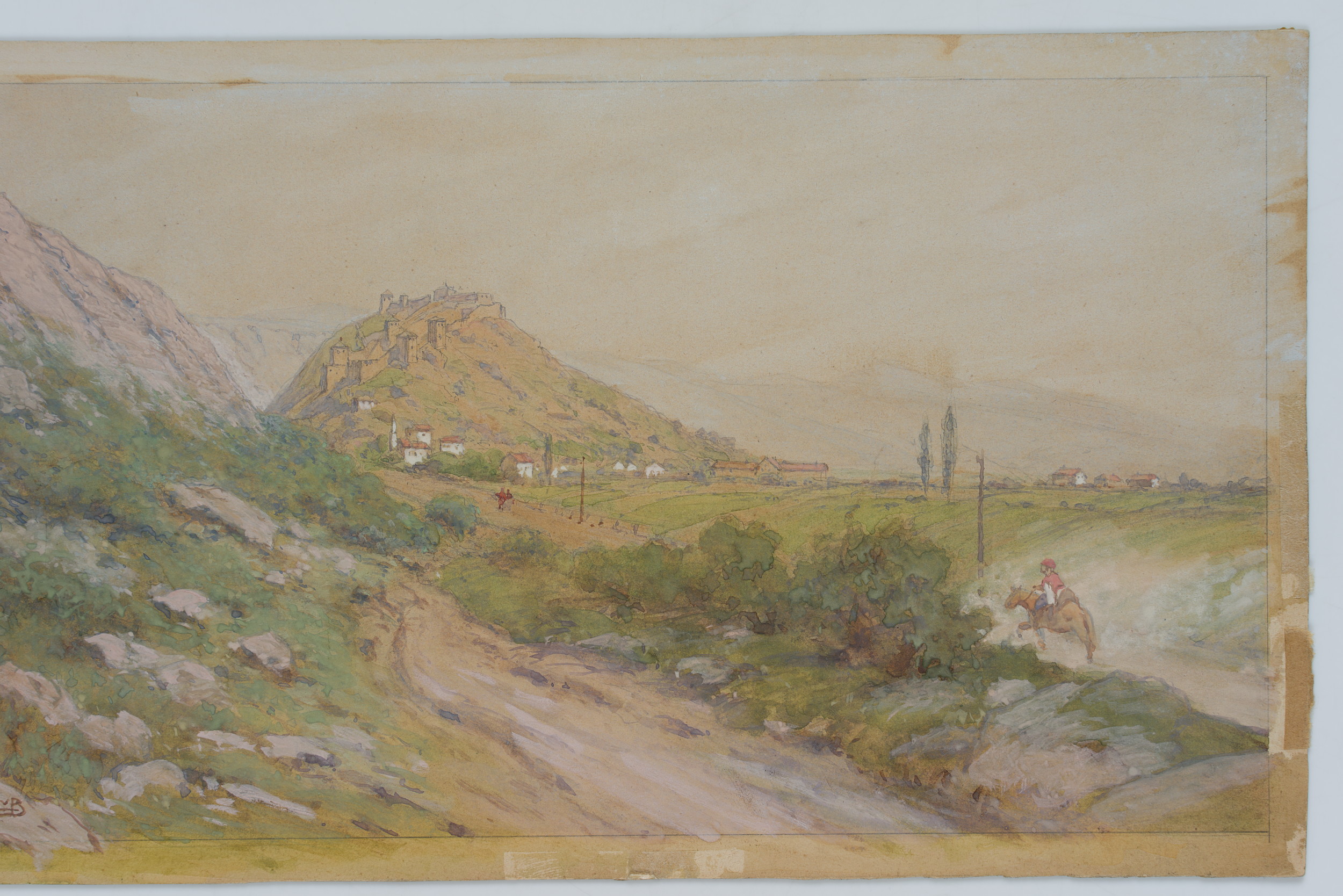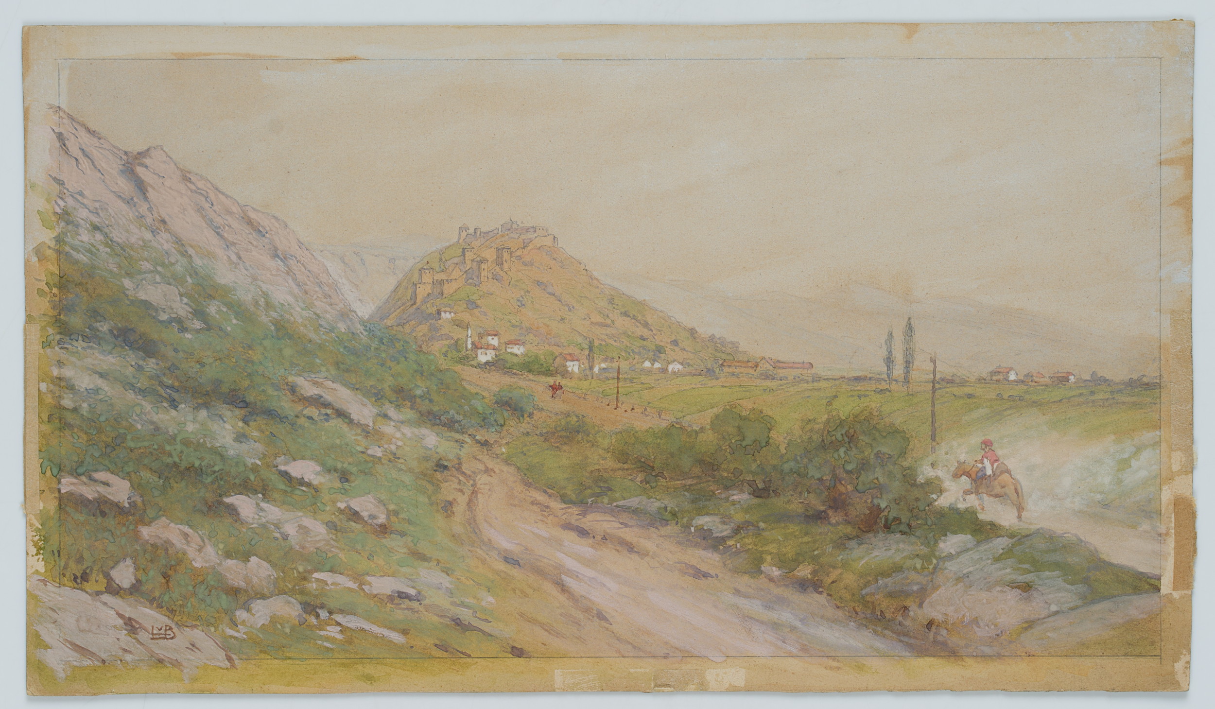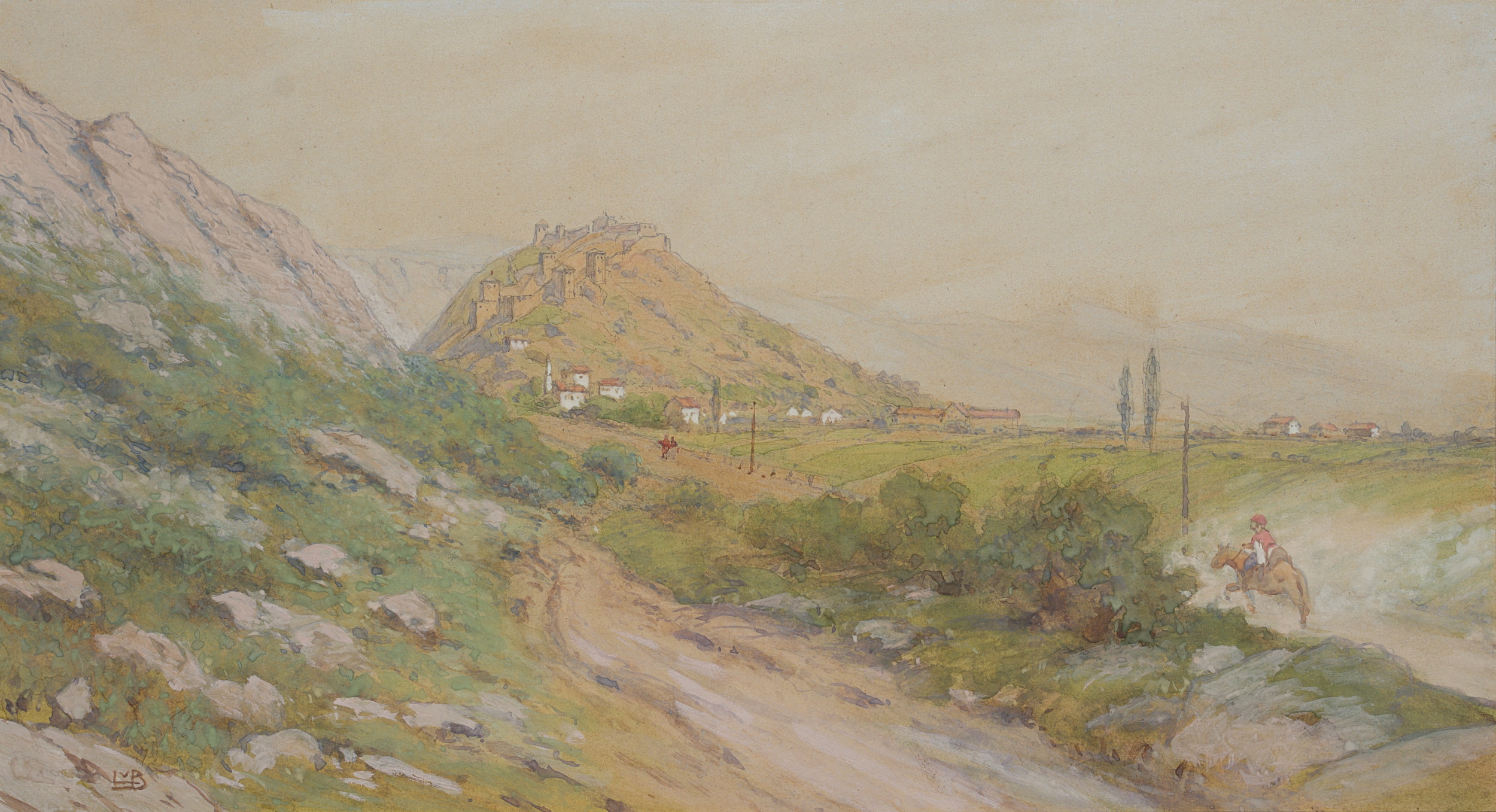 Ladislaus von Benesch (1845 Austerlitz - 1922 Wien), Landschaft in Jugoslawien mit Reiter auf einer Landstraße zu einem Ort in der Ferne auf einen Hügel führend, um 1880, Gouache