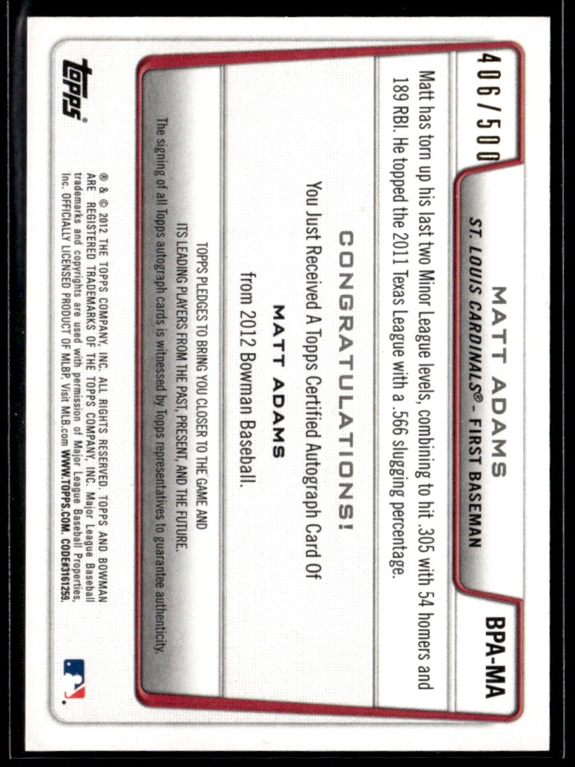 | Matt Adams 2012 Bowman Blue Auto /500 #BPA-MA St. Louis Cardinals |
