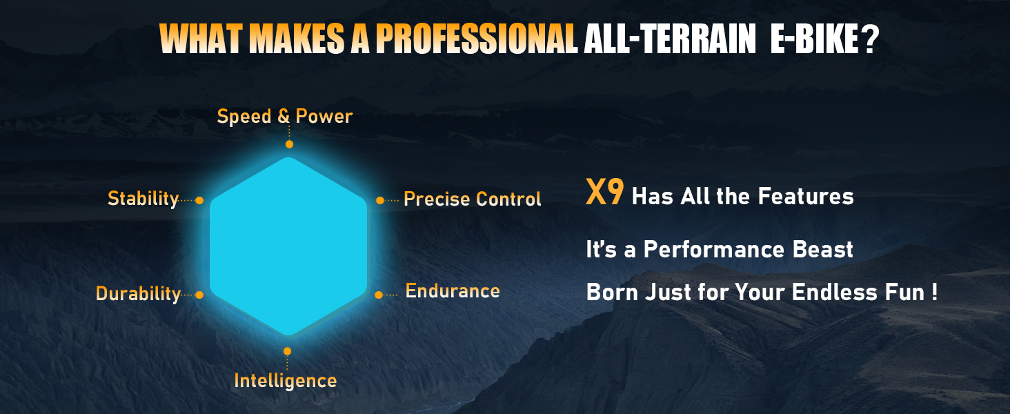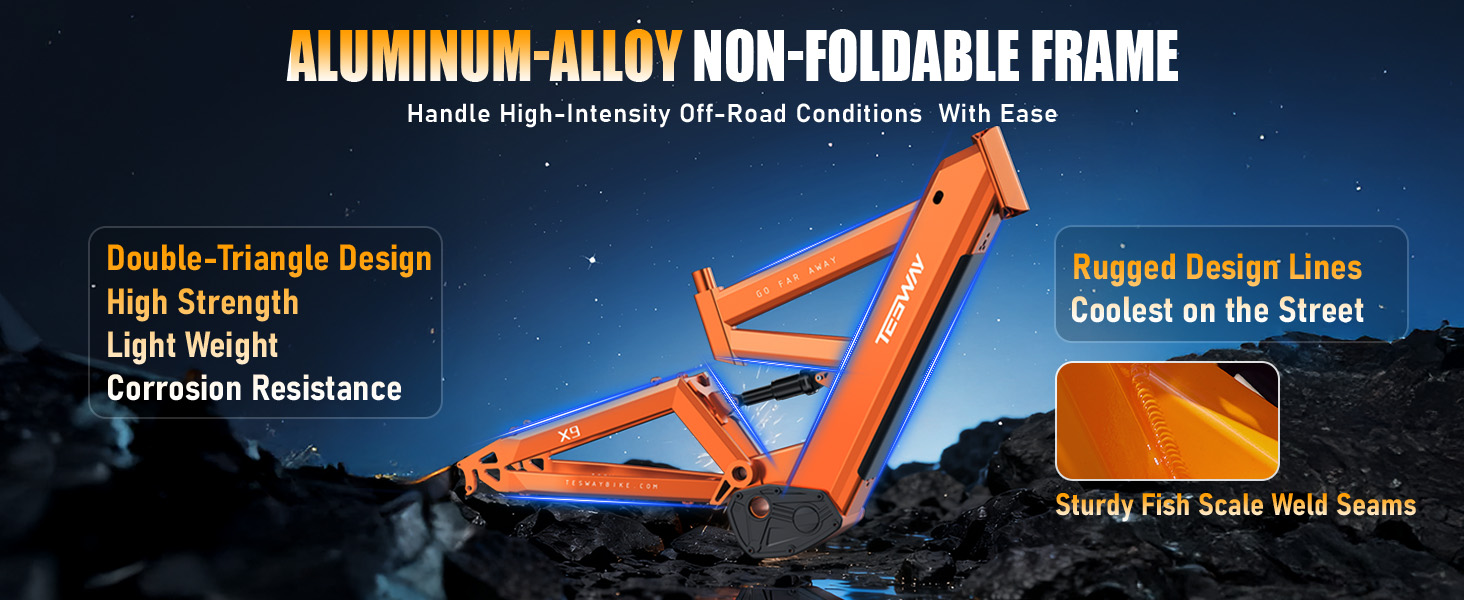【Aluminum Alloy Non-Folding Frame, Sturdy & Durable】 The frame features a double-triangle design, boasting high strength, light weight and corrosion resistance. Its solid fish-scale welds handle high-intensity off-road conditions like mountain roads with ease. X9 electric bike's tough, angular design aesthetic makes you stand out from the crowd.