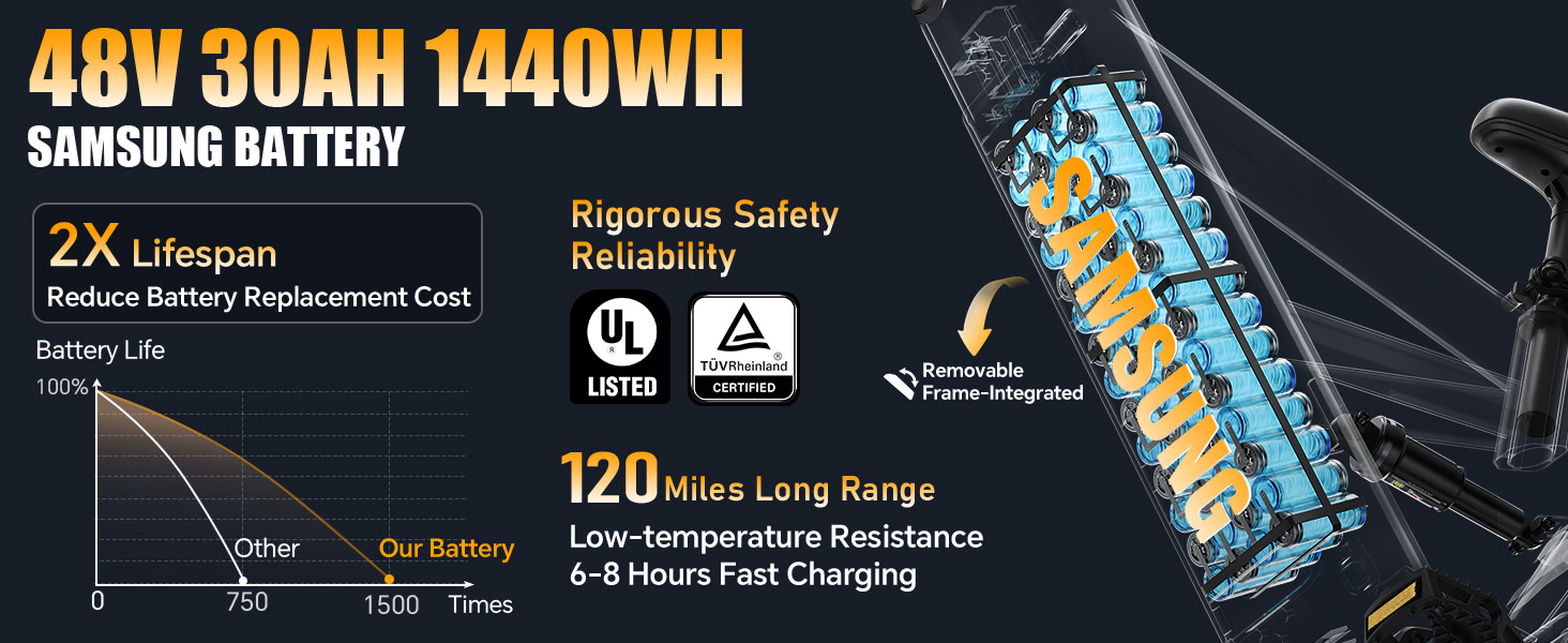 【UL & TUV Dual Certifications, 48V 30A Battery】 X9 ebike has passed strict safety and performance certifications. It adopts high-performance batteries from world-class battery manufacturers, with 3X longer service life, reduces the long-term usage cost caused by frequent battery replacements. High-current output ensures strong power, has 120 miles long range, cold-resistant, 6-8 hours fast charging. Removable frame-integrated battery for enhanced protection & optimal balance.