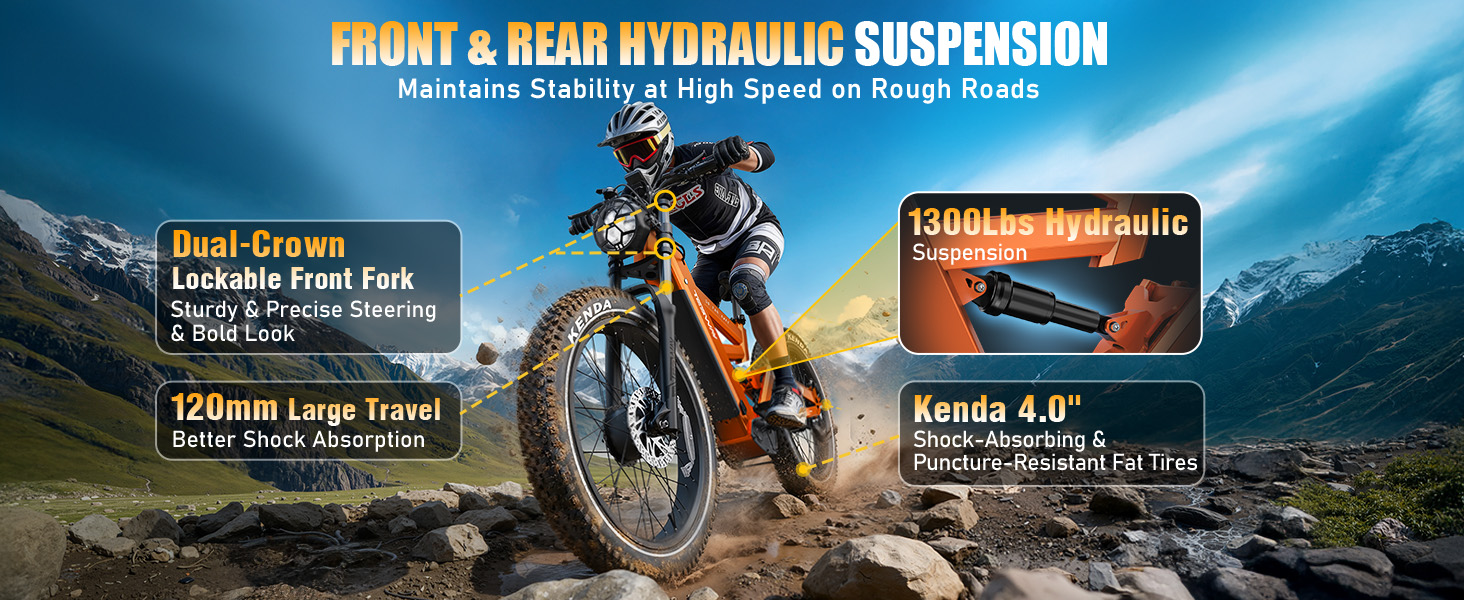 【Front & Rear Hydraulic Suspension, All-Terrain Stability】 X9 equipped with a dual shoulder lockable front fork, can make the e-bike sturdier, tough in appearance, and enabling precise steering, 120mm long travel for better shock absorption. The fully enclosed front fork hook ensures safer off-roading, paired with 13G spoke shock-absorbing rims and 26"×4.0" shock-absorbing anti-explosion fat tires. Can stays stable even at high speeds on rough roads.