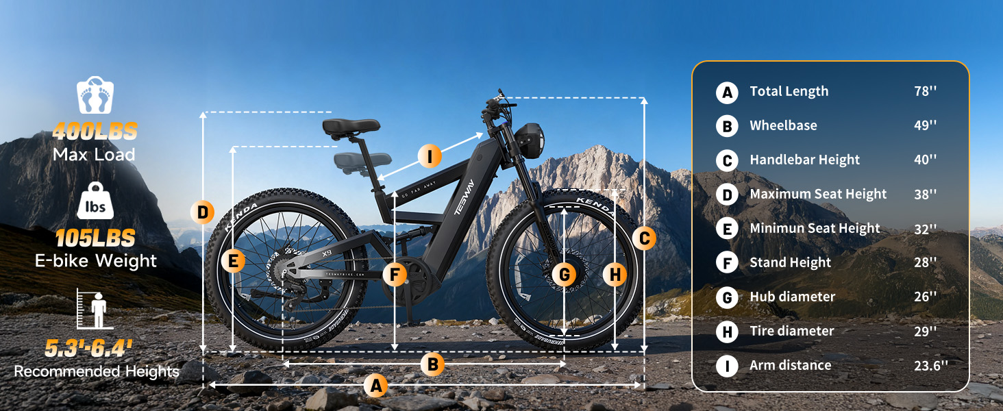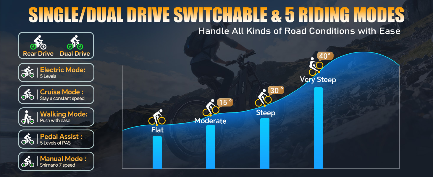 【Dual Motor, Faster & Powerful】 TESWAY X9 electric bike for adults use dual brushless geared motor, geared motors can provide higher torque for the ebike. Speed can reach up to 25km/h in pedal assist mode, 0-25km/h about 10S. Delivers 240NM torque, climbs 40° slopes, 400LBS max load. Easily handle all terrains like mountain roads, sand and snow, letting you enjoy the ride to the fullest.