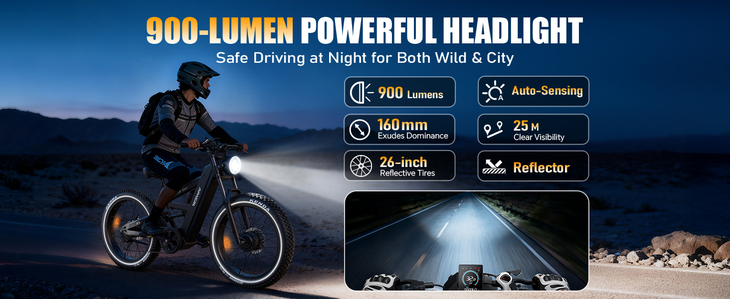 【900-Lumen Headlight, LCD Colorful Display】 Our electric bicycle use 160mm large-diameter auto-sensing headlights with a majestic appearance, clearly visible at 25 meters, paired with reflective tires, ensures safe driving at night both in the wild and city. The colorful LCD screen remains clearly visible even in sunlight. Adopt faster and more secure electronic unlocking methods. Also features a Type-C port with reverse power delivery.
