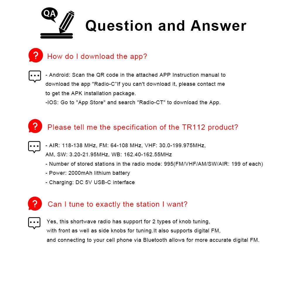 Each band can store 199 radio stations; TR112 can memorize 995 channels at all; in the process of your pursuit of music and information; never need to worry about repeated listening.