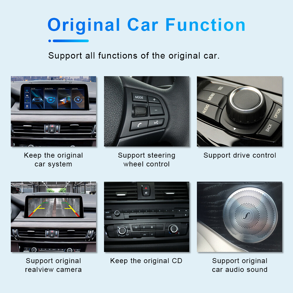 Features: • Support wireless Carplay connection • Support USB Carplay connection • USB Android auto is available to connect with your Android phone • Support USB audio and video playback function • Keep all original car features, reverse/front view, PDC function, etc • Support WIFI 2.4G and 5G dual-band, support 802.11b /g/n/ac protocol • Support custom startup animation • Supports the input function of an external reverse camera • Free switch between original car system and Carplay system • Installation without coding orslicing OEM wires • Control by OEM joystick and steering wheel buttons Technical details: • System: Linux • CPU: Embedded with 128 MB DDR4, clock frequency up to 1.2G • GPU: Supports Graphic 2D hardware accelerator includeing rotate,mixer,LBC decompression functions • System storage: 128M SPI nor • Operating system: RTOS (Real-Time Operating System) • WIFI: Dual-band WiFi, IEEE 802.11 2.4G b/g/n ; 5G a/g/n/ac CAR PLAY delivers 60 frames per second • BT: BT5.0+ BR/EDR+BLE, Bluetooth music decoding support SBC • USB: USB2.0, the internal 1 USB is expanded into 2 USB hosts through the HUB, one of which supports CarPlay • Audio output: Analog stereo audio output