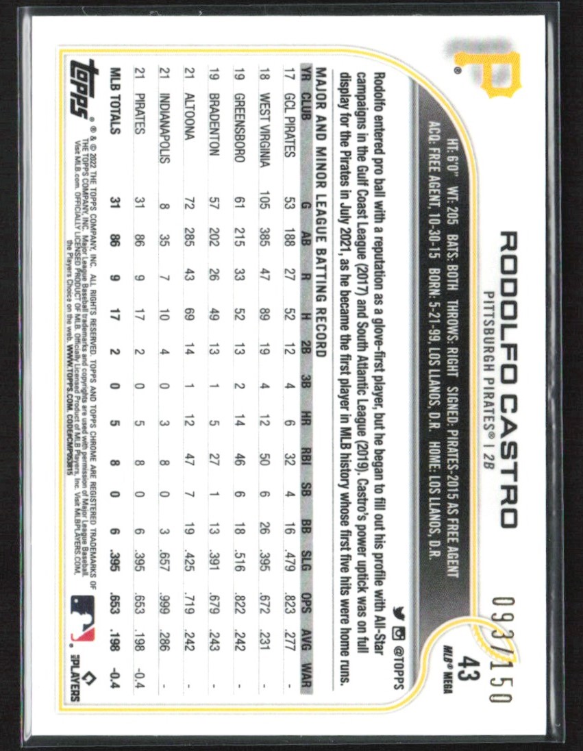 | Rodolfo Castro 2022 Topps Chrome Logofractor Blue Refractor RC /150 #43 |