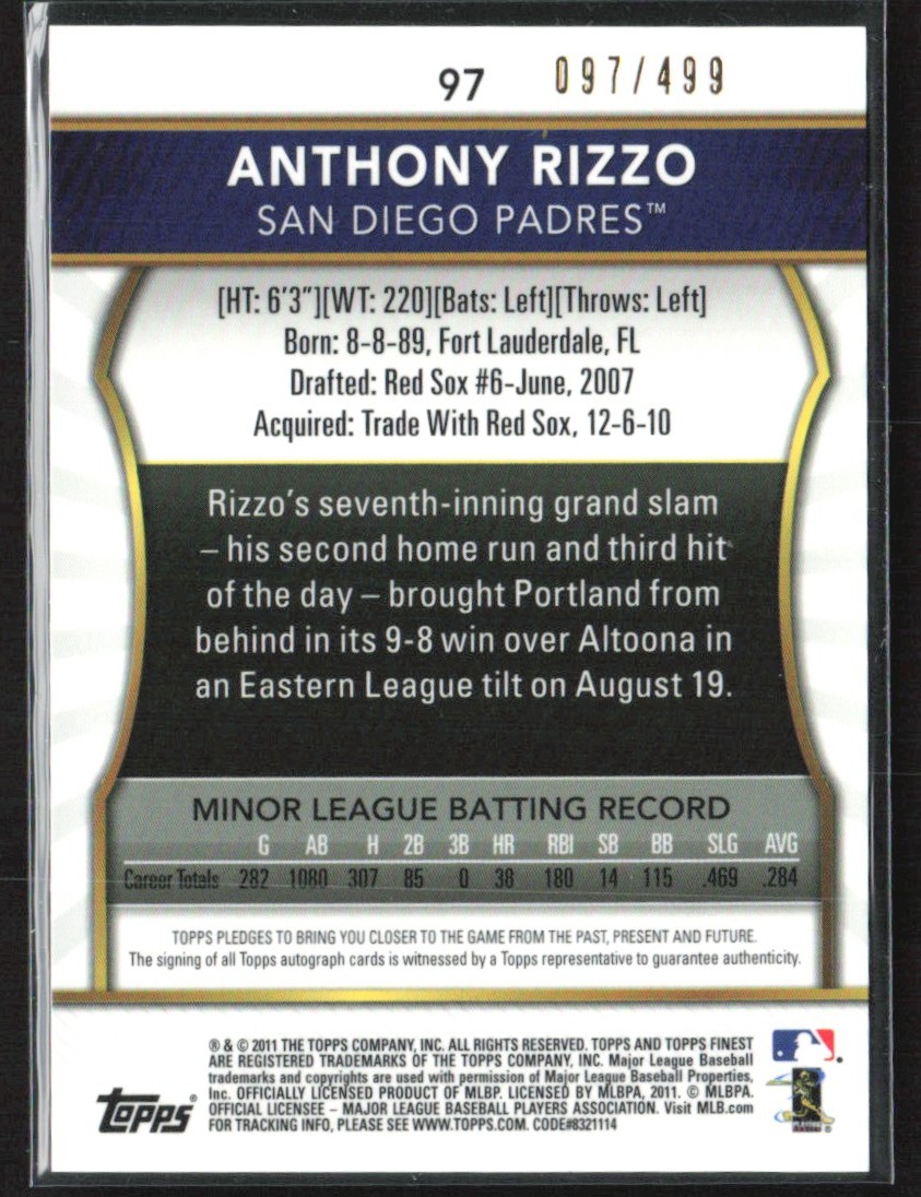 | Anthony Rizzo 2011 Topps Finest Refractor RC Auto /499 A #97 San Diego Padres |