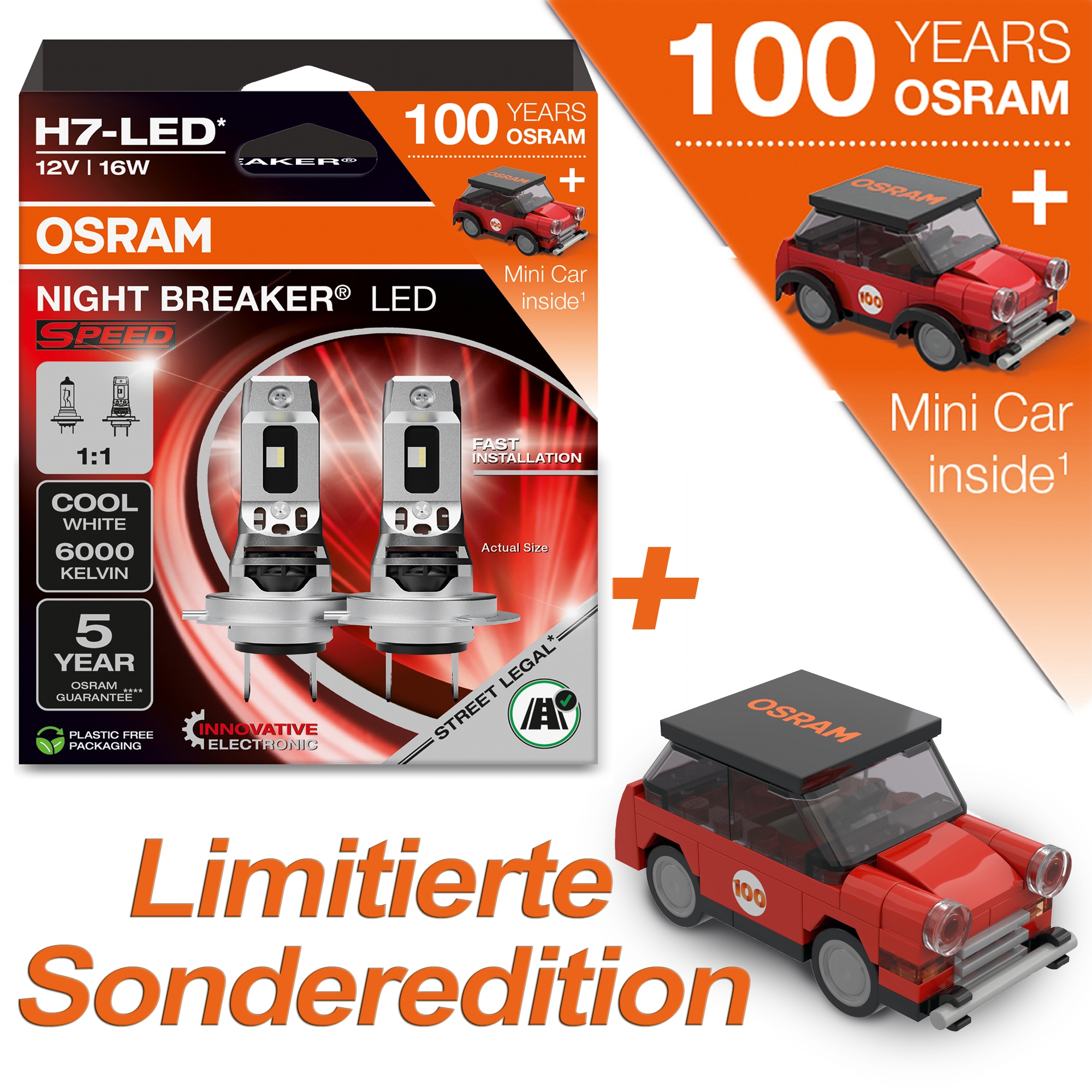 - Ausführung: OSRAM NIGHT BREAKER LED SPEED H7 + 100 Jahre Jubiläums Mini Car
