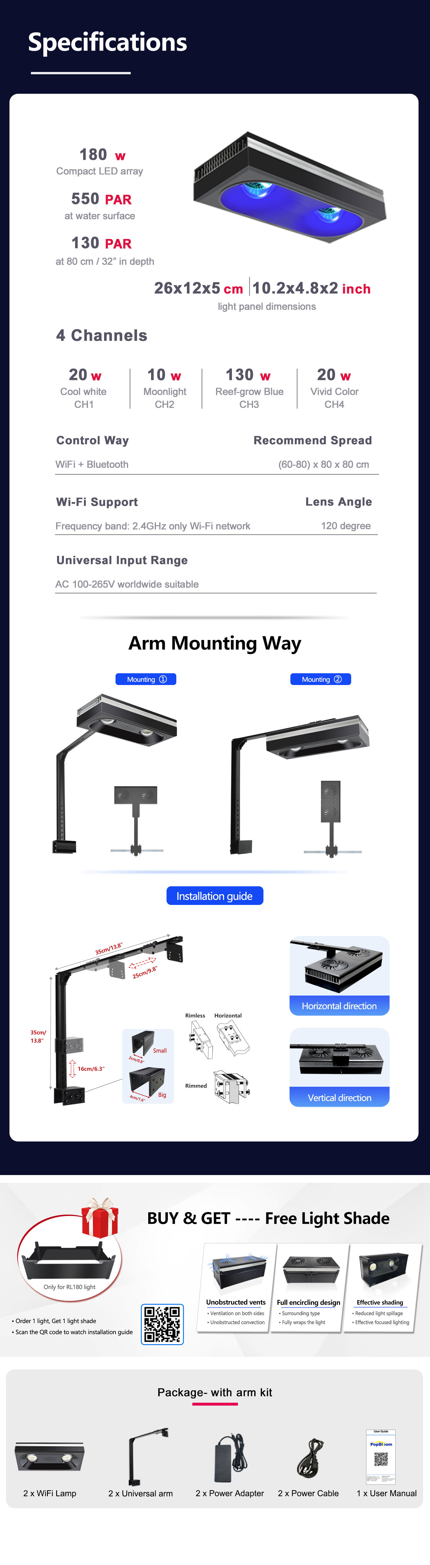 PopBloom RL180 WiFi Control LED Aquarium Light for Coral Reef Fish Tank SPS LPS