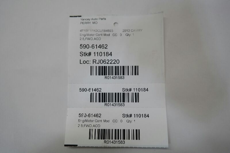 MAY REQUIRE REPROGRAMMING This listing is for a USED 12-14 TOYOTA CAMRY Engine ECM Electronic Module Engine Control . This part was removed from a 2012 CAMRY stock number 110184 and the mileage was 135000 miles. Part Condition Notes: 2.5,FWD,AOD This part will fit these makes and models with these options: CAMRY 12-13 Electronic Control Module; (engine control), VIN F (5th digit), (2.5L, 4 cylinder, 2ARFE engine), L model