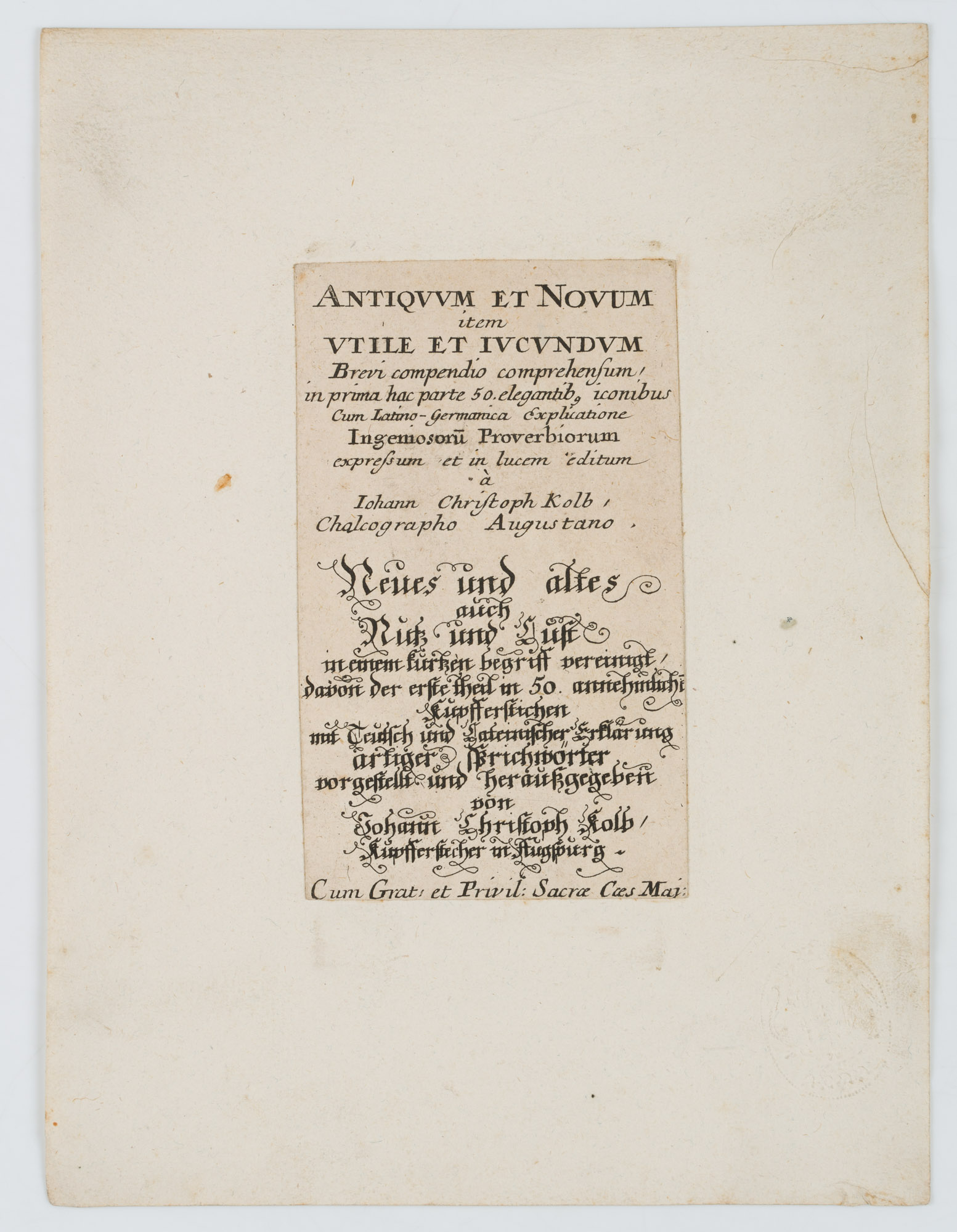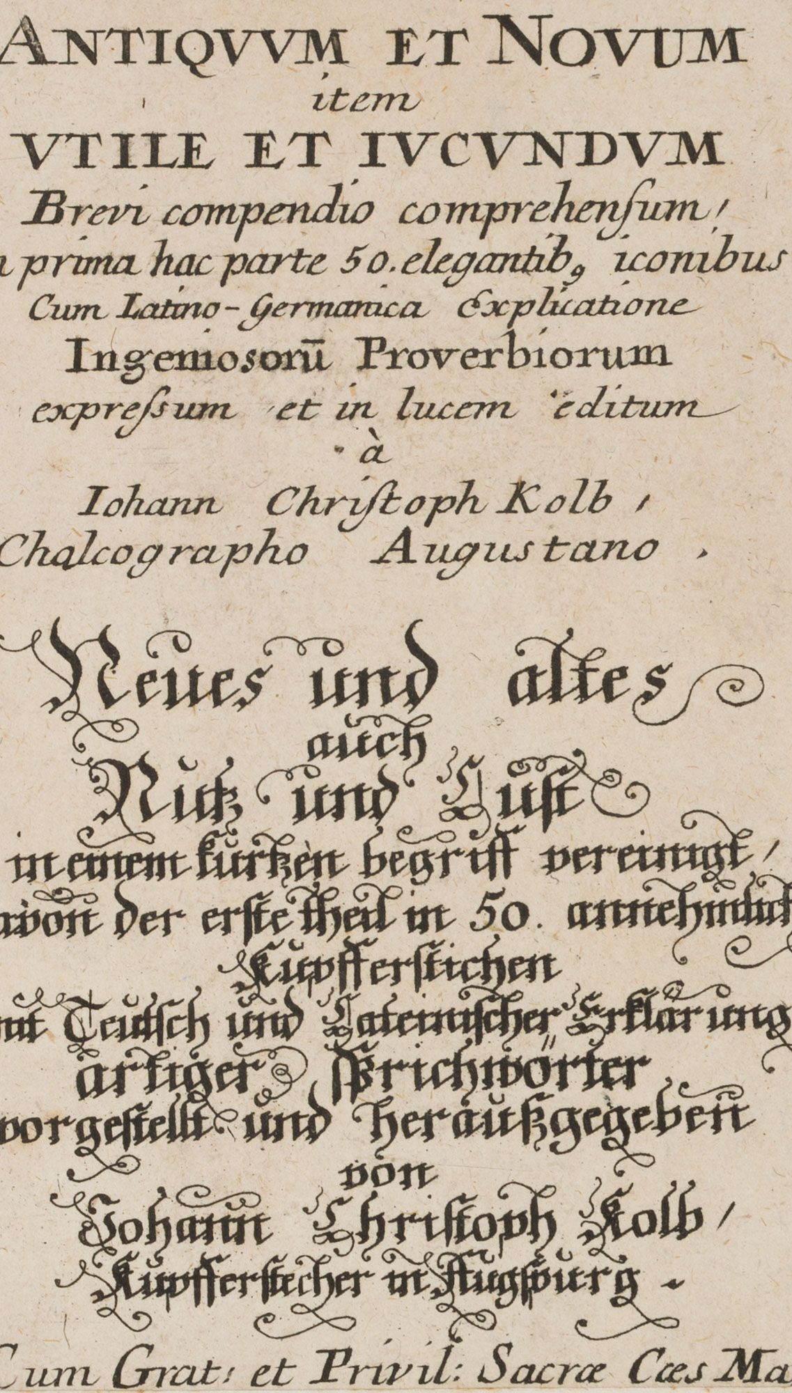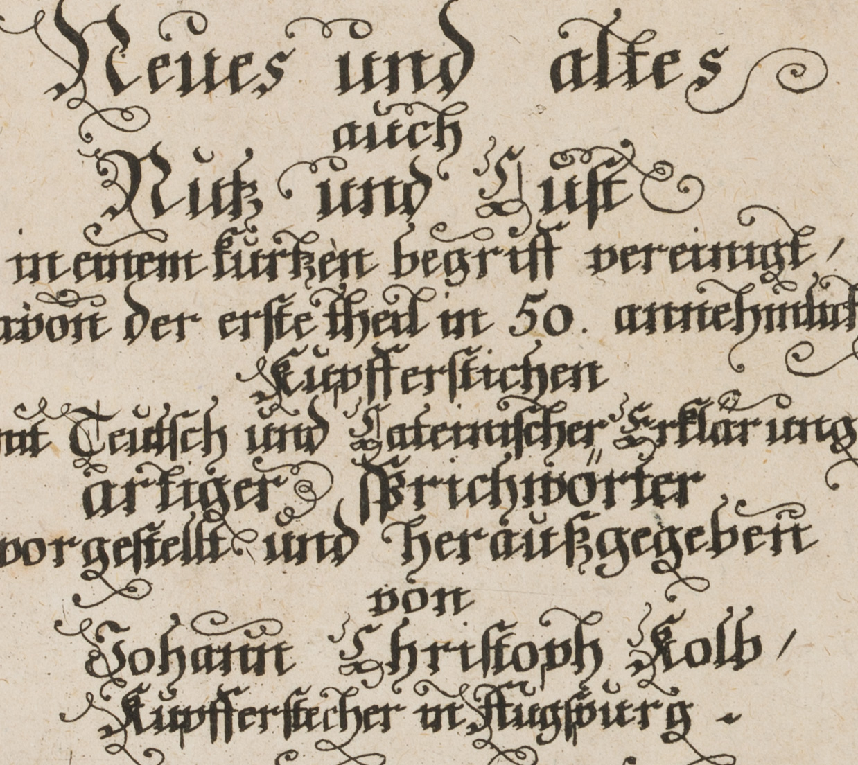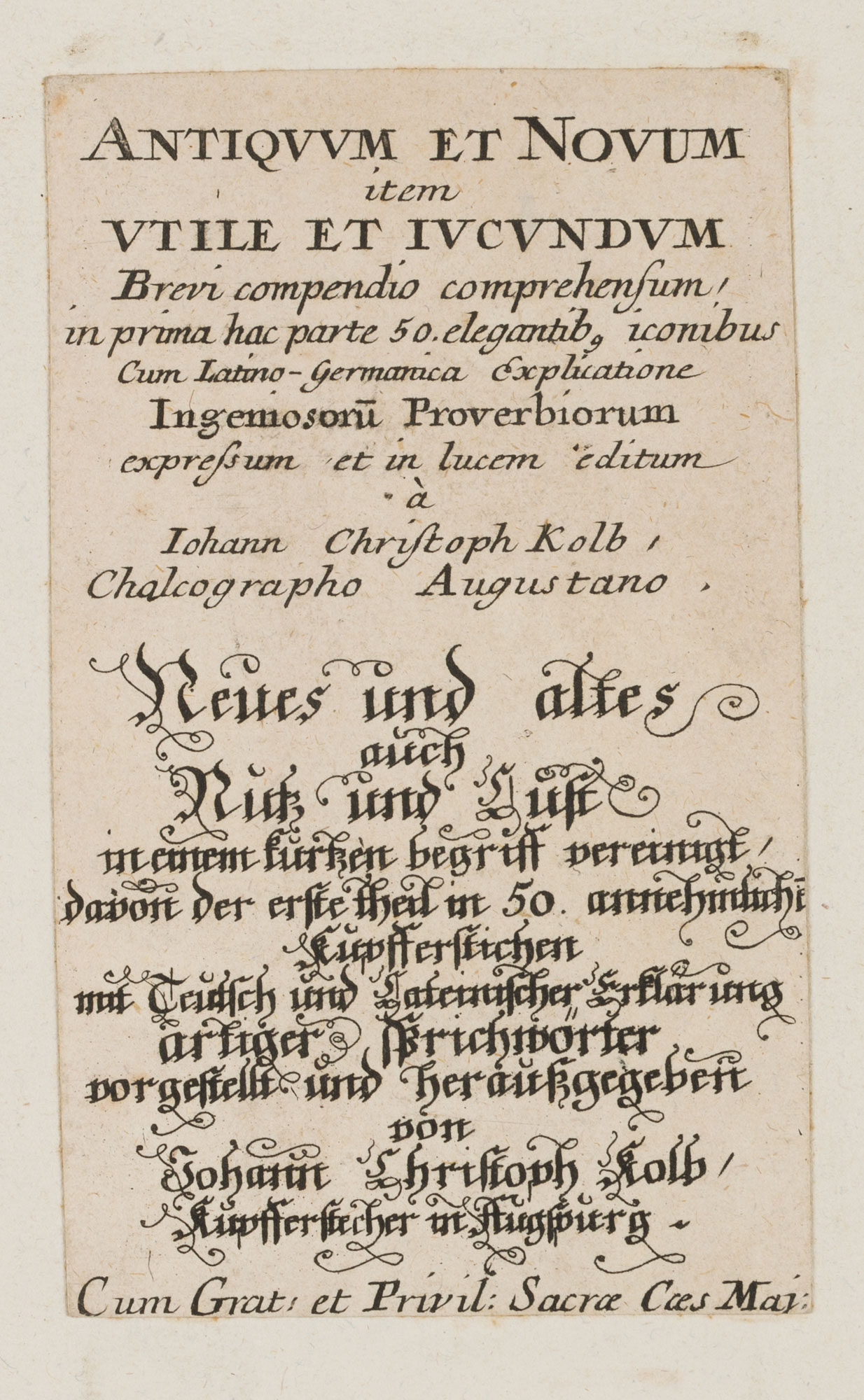 - Description: Title page in German and Latin, title in German: "Neues und Altes auch Nutz und Lust in einem kurzen Begriff vereint davon der erste Theil in 50 annehmlichen Kupferstichen mit deutsch und lateinischer Erklärung artiger Sprichwörter". Johann Christoph Kolb was an engraver and publisher of copper engravings.