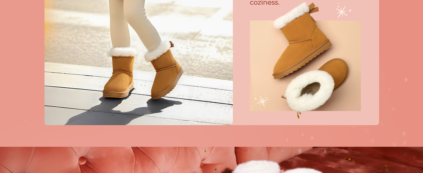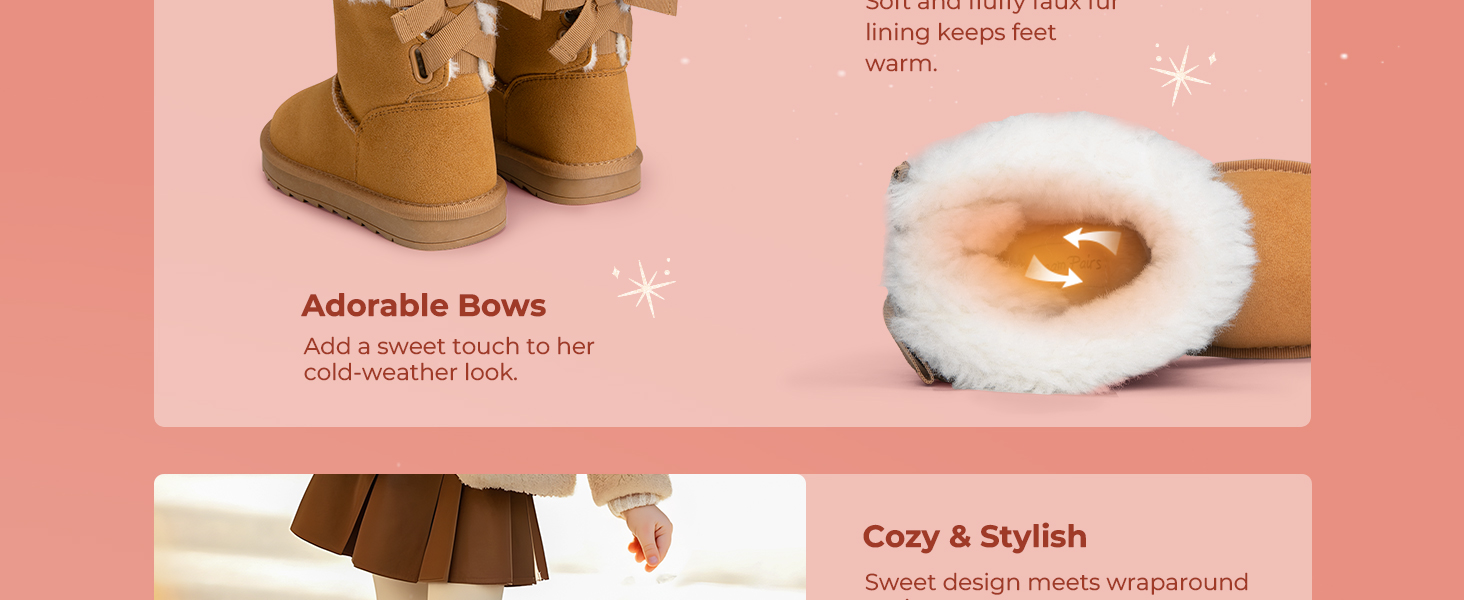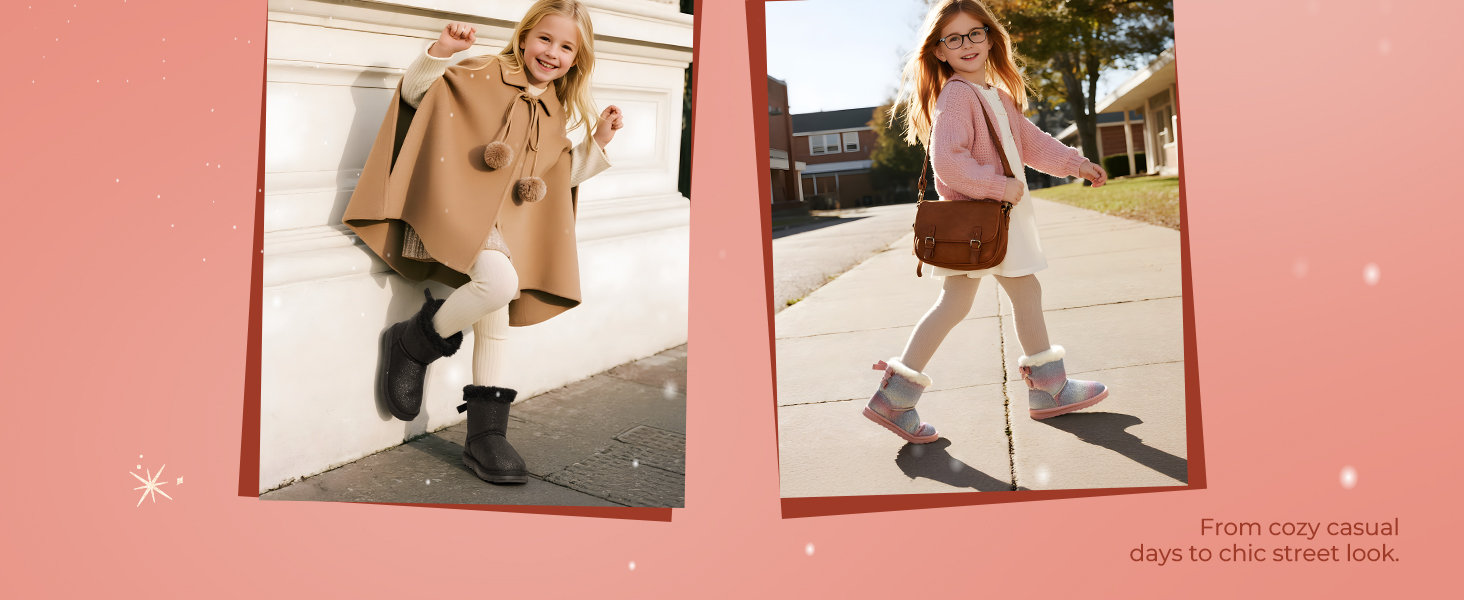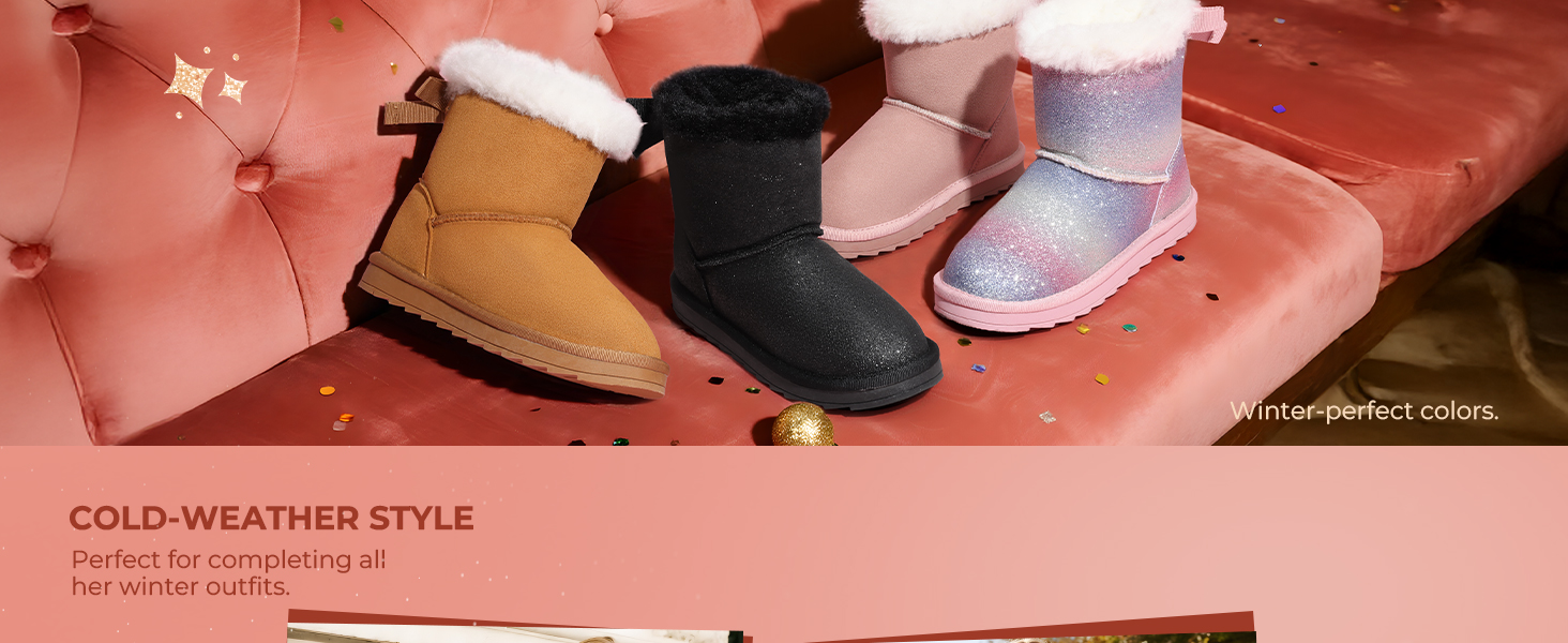 • Warm Lining: From the inner lining to the top, the soft and warm faux fur provides a cozy feel, keeping their feet warm and comfortable all day while shielding them from the cold.