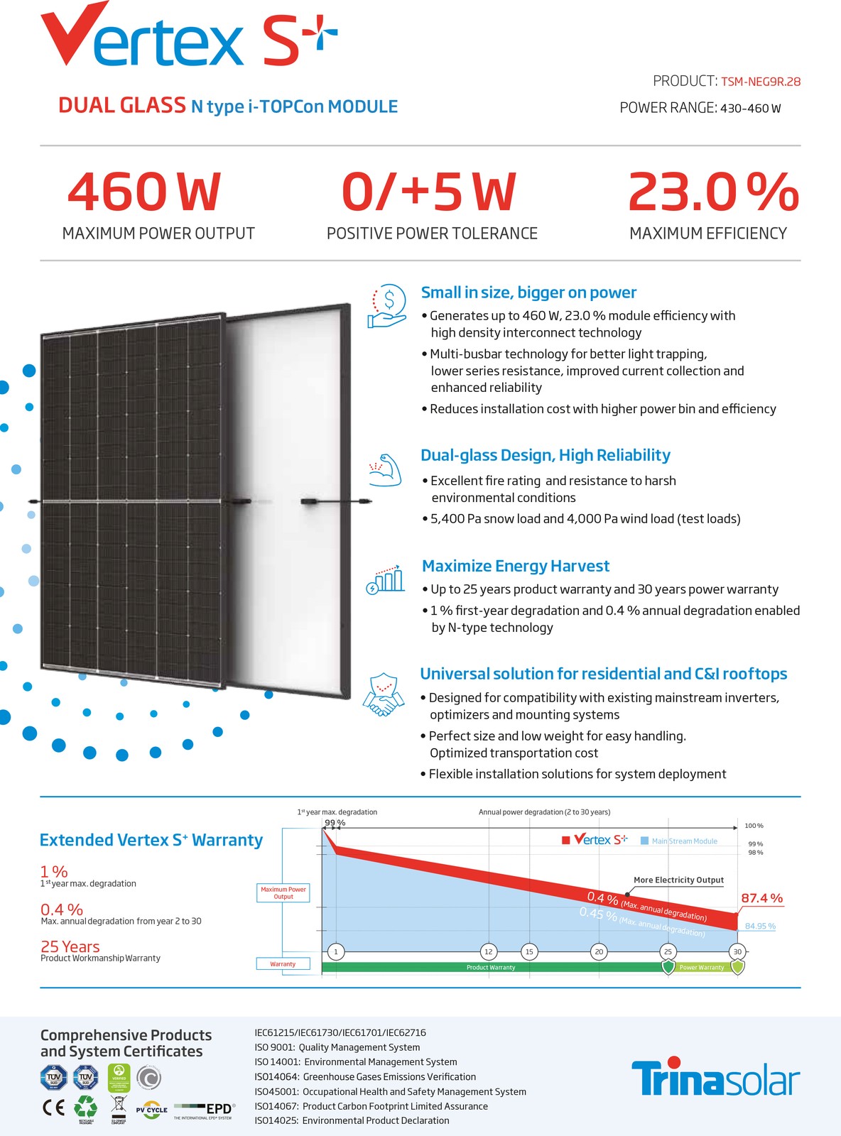 Das Vertex S+ von Trina Solar ist ein 450W starkes Doppelglas-Solarmodul, welches den bestmöglichen Ertrag mit vielen modernen Technologien für dich herausholt.