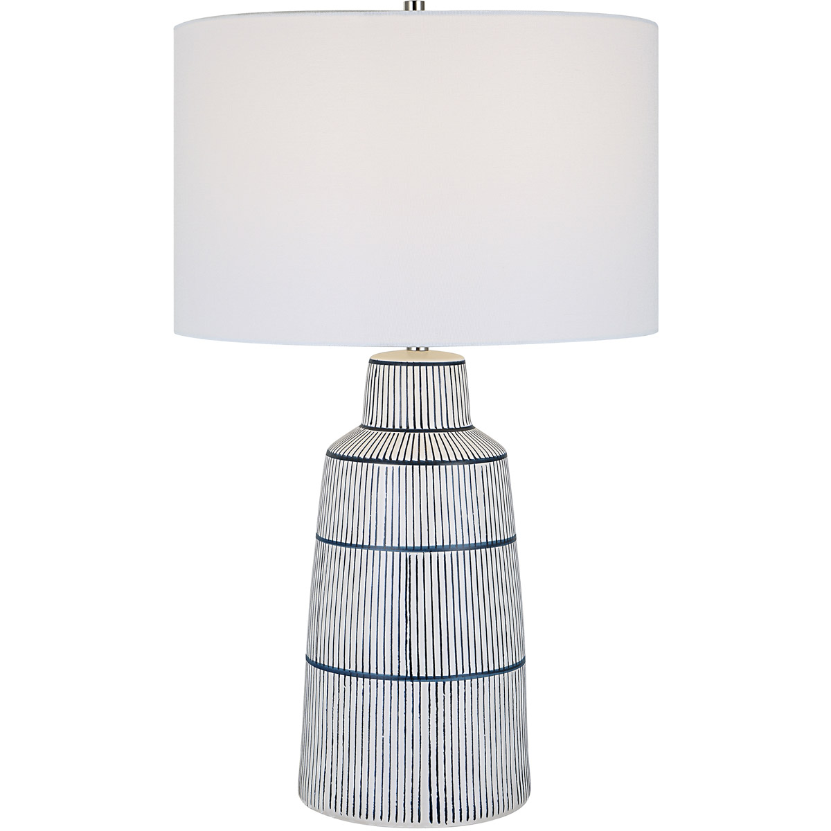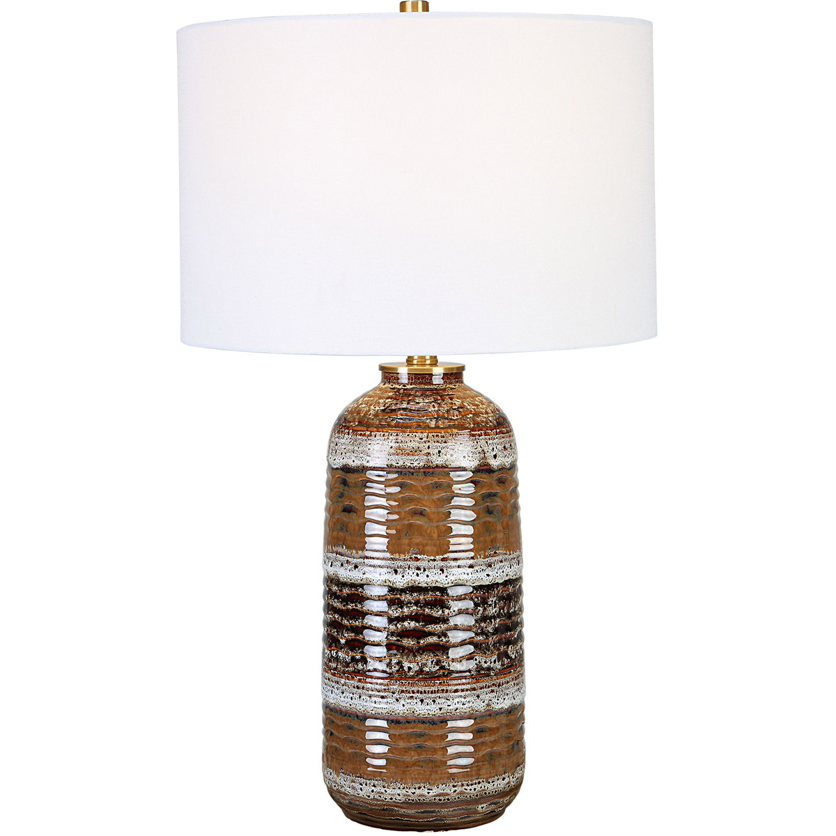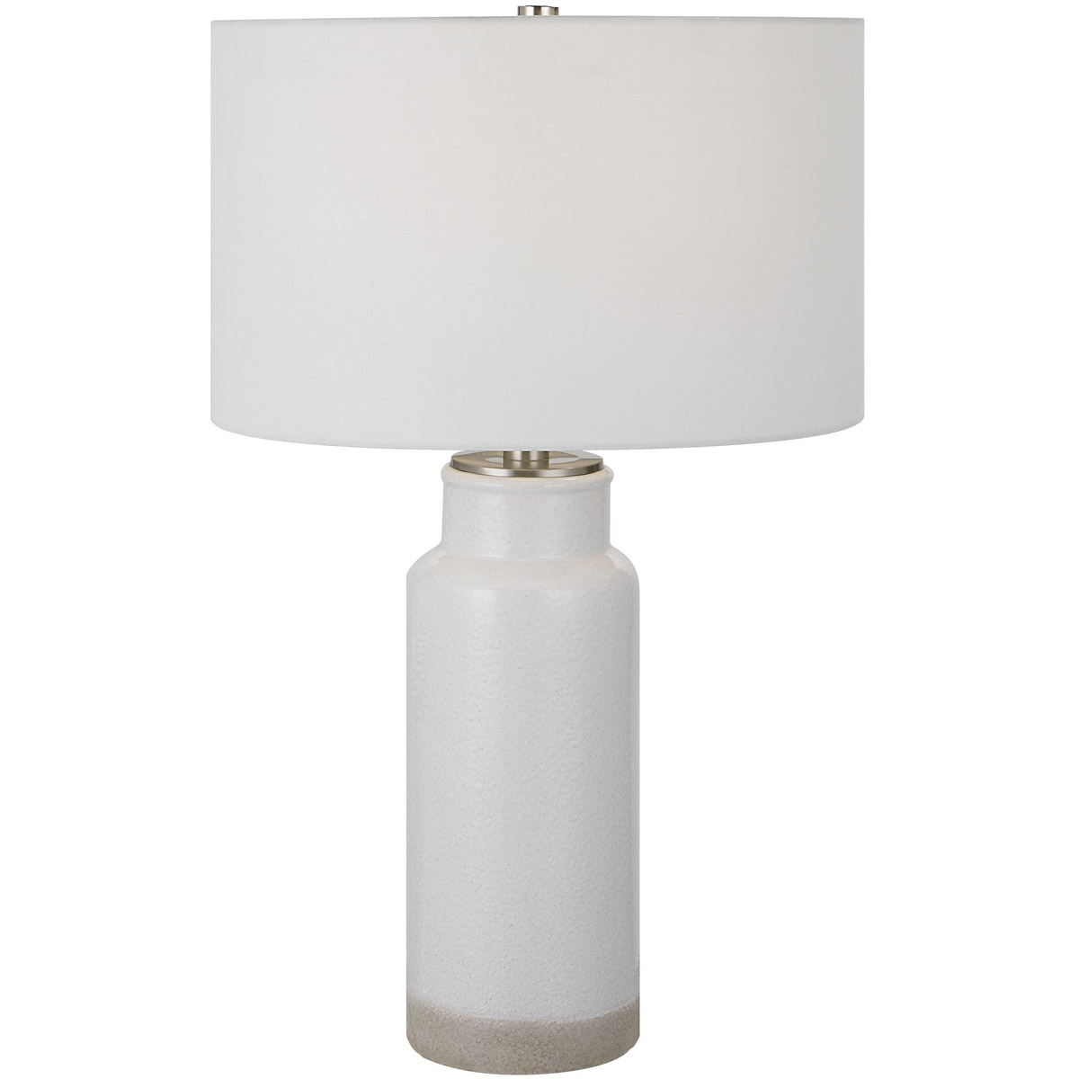 This Ceramic Table Lamp Showcases A Rustic Chiseled Texture With Frosted Pewter Gray Undertones And Organic Carved Accents In Light Sepia Tones. Iron Details Are Finished In Antique Brass. The Lamp Is Complimented By A White Fabric Drum Shade.