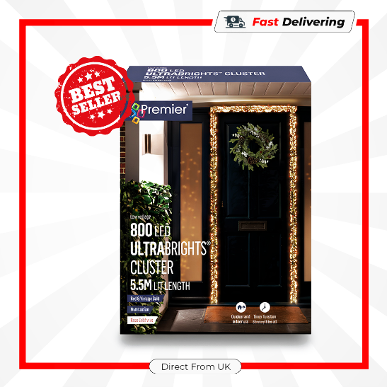 The Premier 800 LED Rose Gold Ultra Bright Cluster Lights in Red & Vintage Gold add a rich, festive glow to your décor. Perfect for Christmas trees, garlands, or outdoor displays, these lights provide vibrant colour, elegance, and a warm holiday atmosphere.