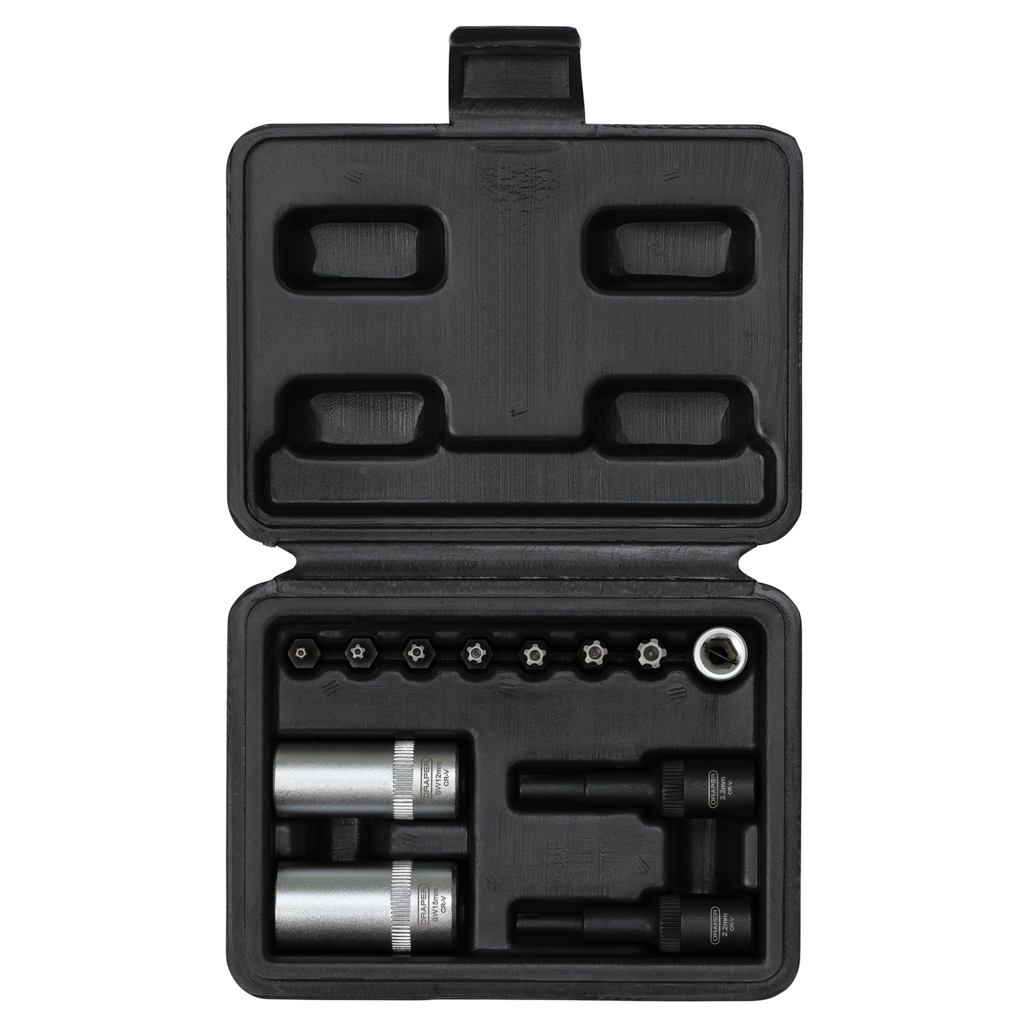 This air conditioning and ECU tool kit is designed for removing plastic valve caps and valve cores during servicing and repairs on air conditioning systems in Audi, Volkswagen and Vauxhall/Opel vehicles. The kit includes tamperproof bits for use on ECU, airflow, mass sensors and injection pumps. Made from chrome vanadium steel, the components have a black phosphate finish for corrosion protection, except the SW12mm and SW15mm sockets, which have a satin chrome finish. Supplied in a sturdy plastic storage case.