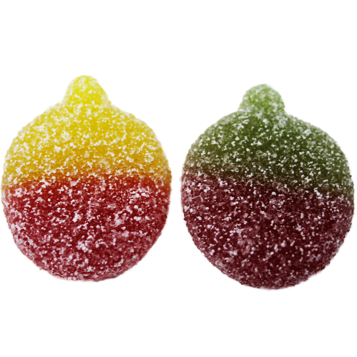 Ces pommes acides scintillantes sont toujours un choix populaire. Plein de goût de fruits et recouvert d'une couche de sucre, en deux couleurs de pomme verte au citron et de pomme rouge citron rouge.