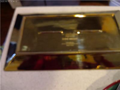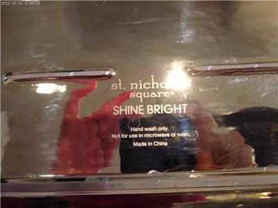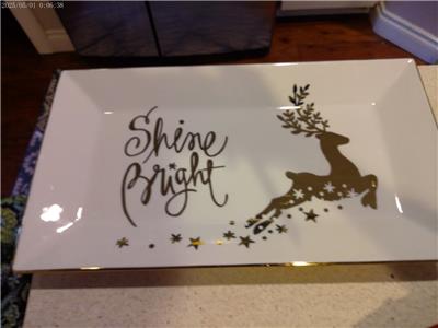 For sale is a beautiful white and gold rectangular platter in the "Shine Bright" pattern from Kohls/St. Nicholas Square pattern. It is not brand new, but is in perfect condition. It measures 16 1/8" long and 9" wide. It cannot be put in the dishwasher or the microwave, hand wash only. This is a really pretty platter!