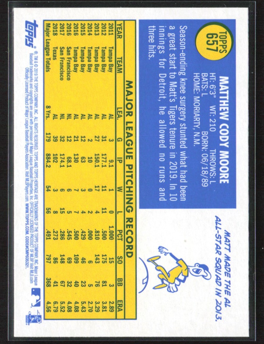 | Matt Moore 2019 Topps Heritage Reverse Flip Stock #657 Detroit Tigers |