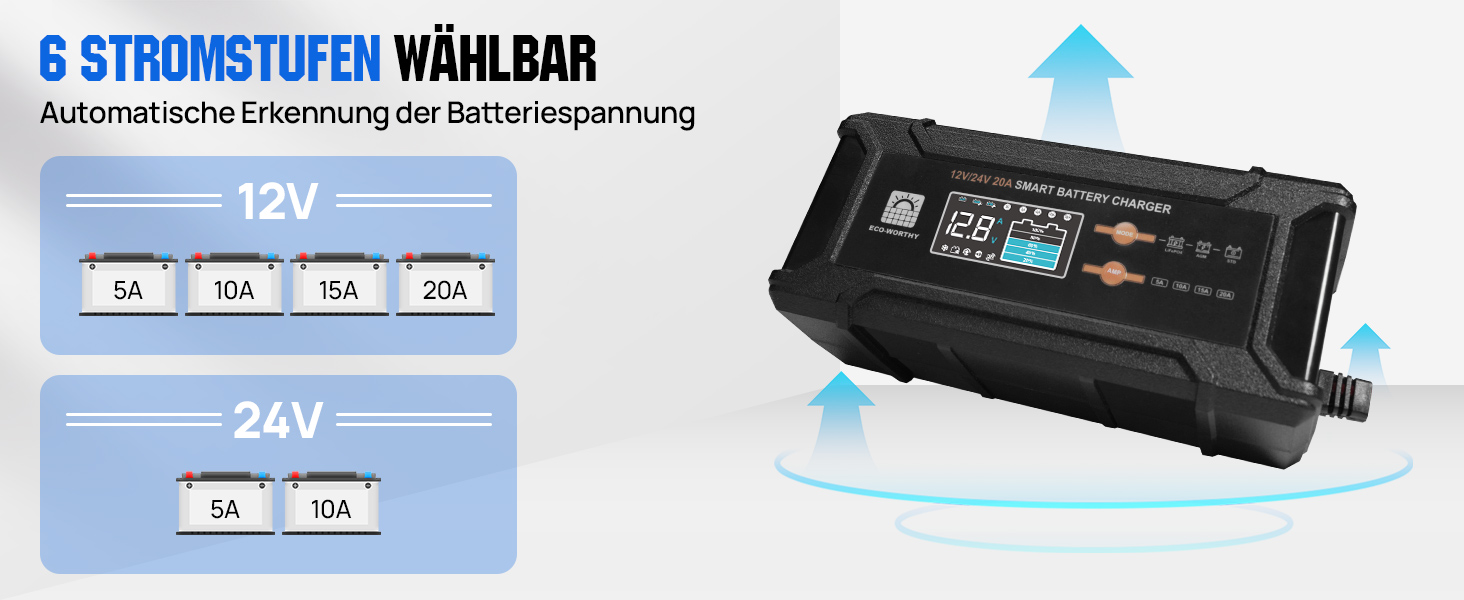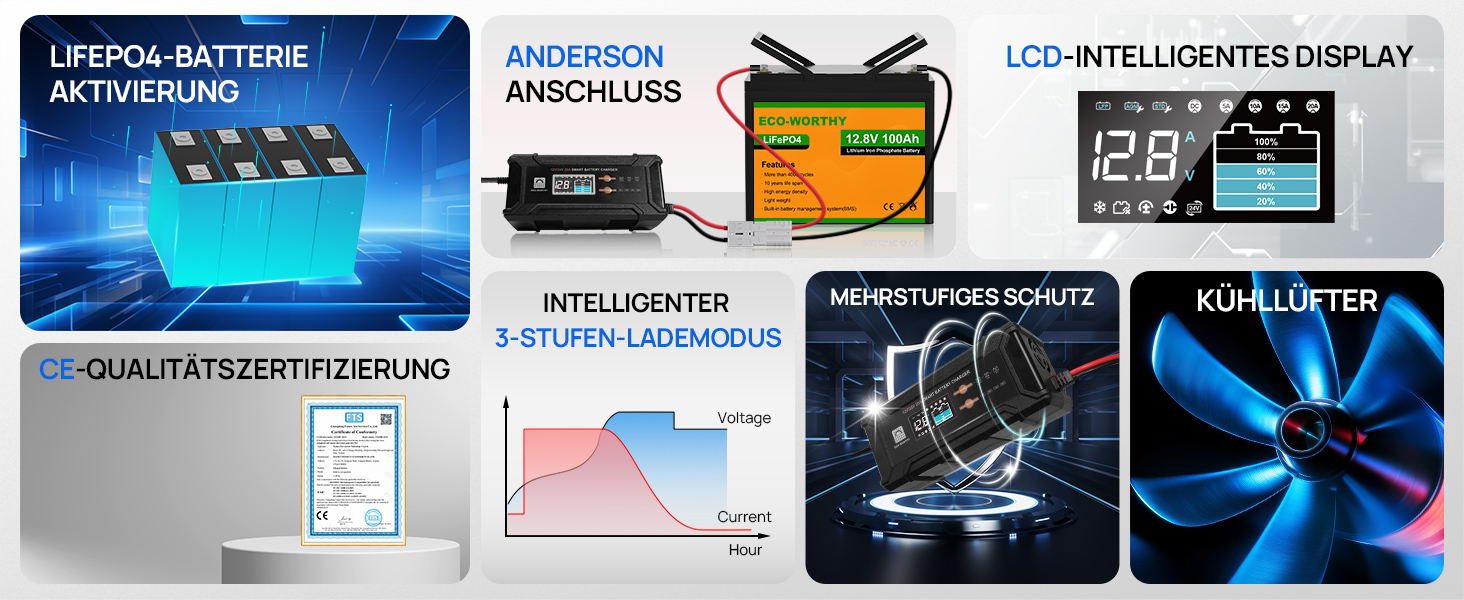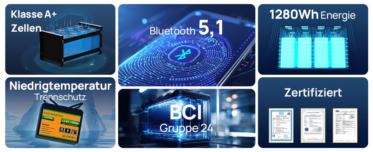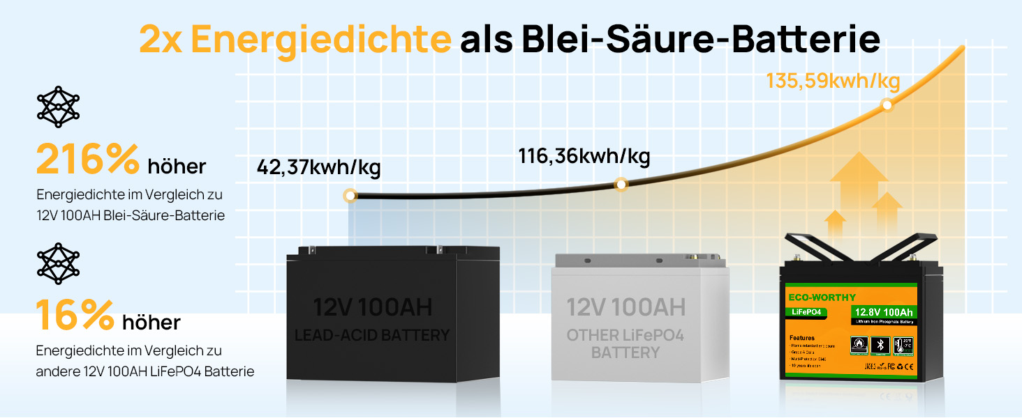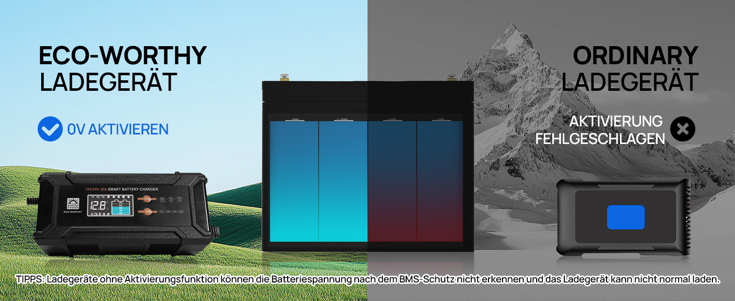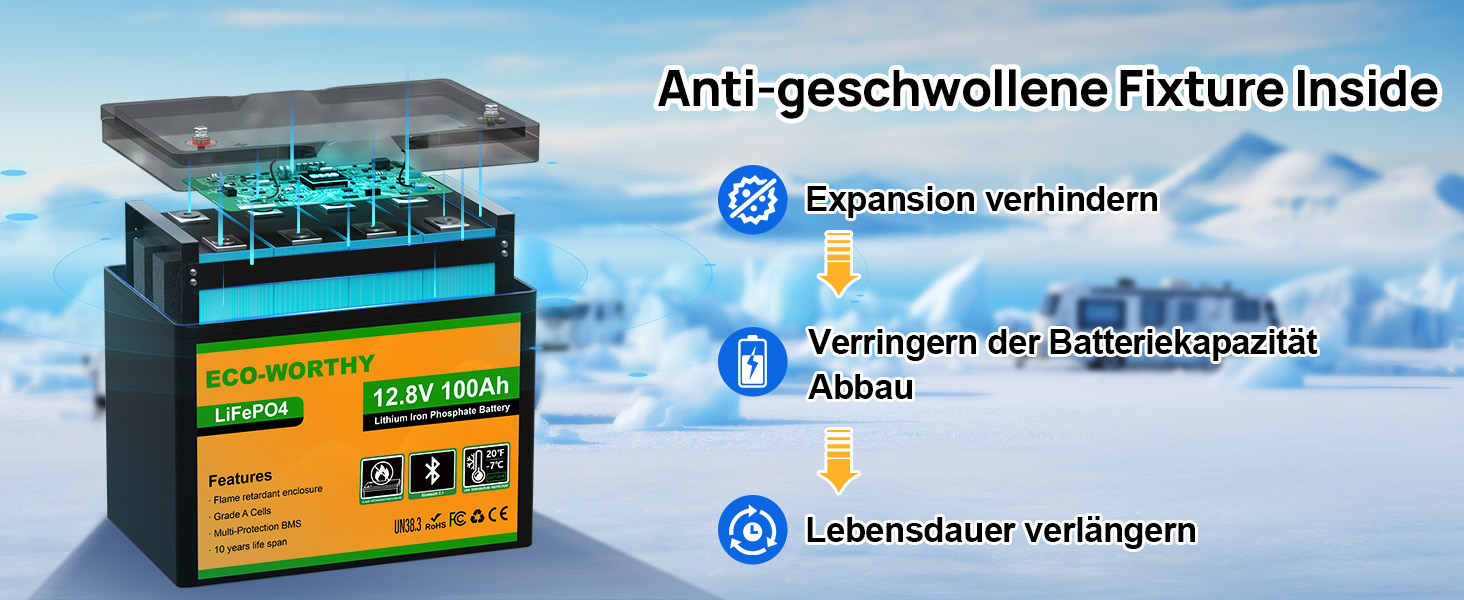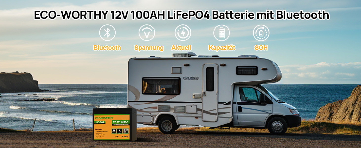 ECO-WORTHY-Batterie verfügt über ein integriertes BMS (Batterie management system), geringe Selbstentladung, kann Überladung, Tiefentladung, Überstrom, Überlastung, Kurzschluss verhindern.