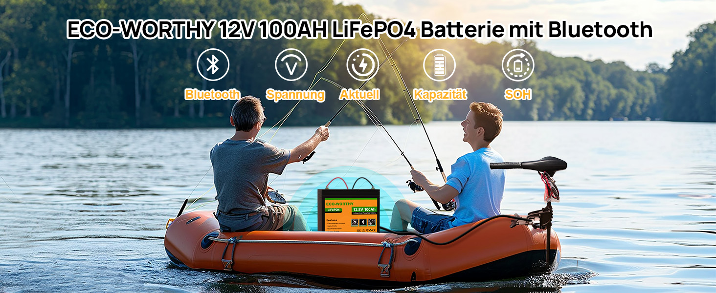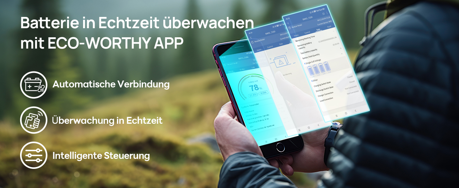 ECO-WORTHY 100AH Lithium-Eisen-Phosphat-Akku Unterstützt Bluetooth-Konnektivität für die Echtzeit-Überwachung des Akkustatus.