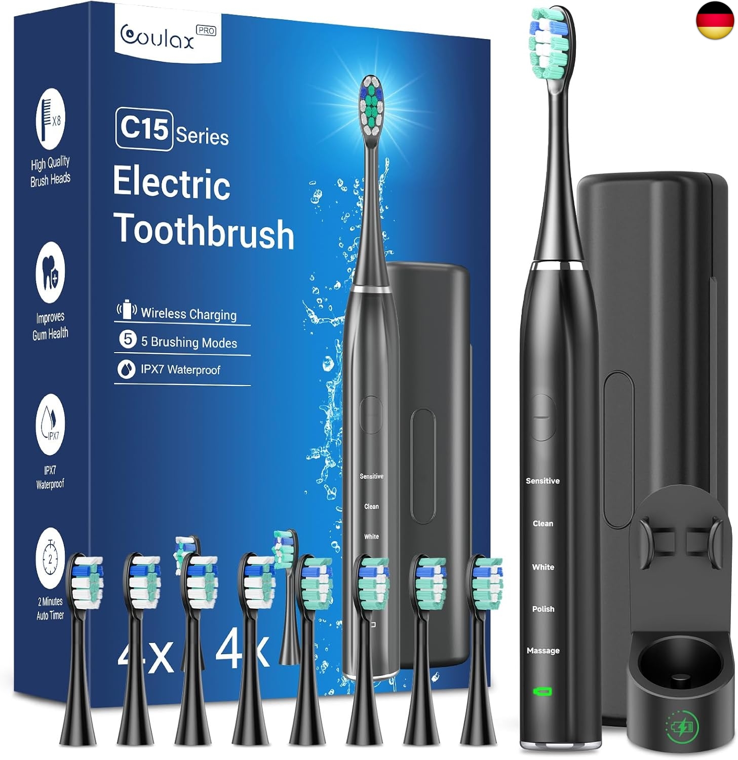 Elektrische Zahnbürste Schallzahnbürste für Erwachsene - Whitening Ultraschall Zahnbürste Elektrisch mit Reiseetui und Ladestation, Electric Toothbrush Mit 8 Bürstenköpfe, 5 Putzmodi, 40000VPM