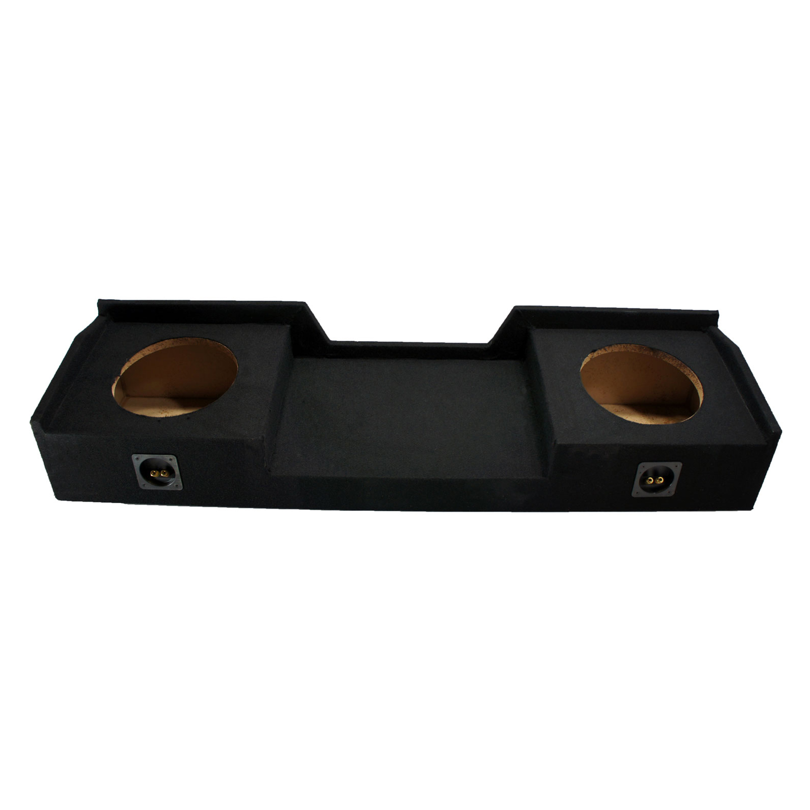 The enclosure is constructed from high-quality MDF and wrapped in black carpet for a durable, OEM-style finish. With 0.95 cubic feet of air space per sub and a 5-3/4" mounting depth, the down-firing design maximizes low-frequency output while protecting the subwoofers and preserving usable interior space.