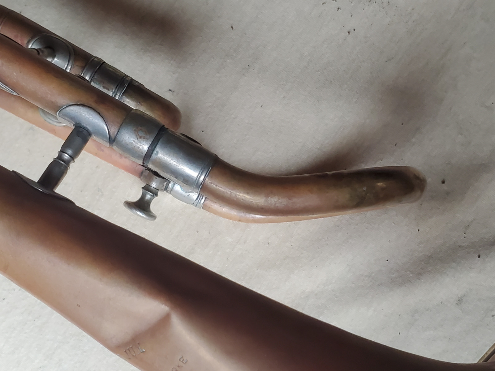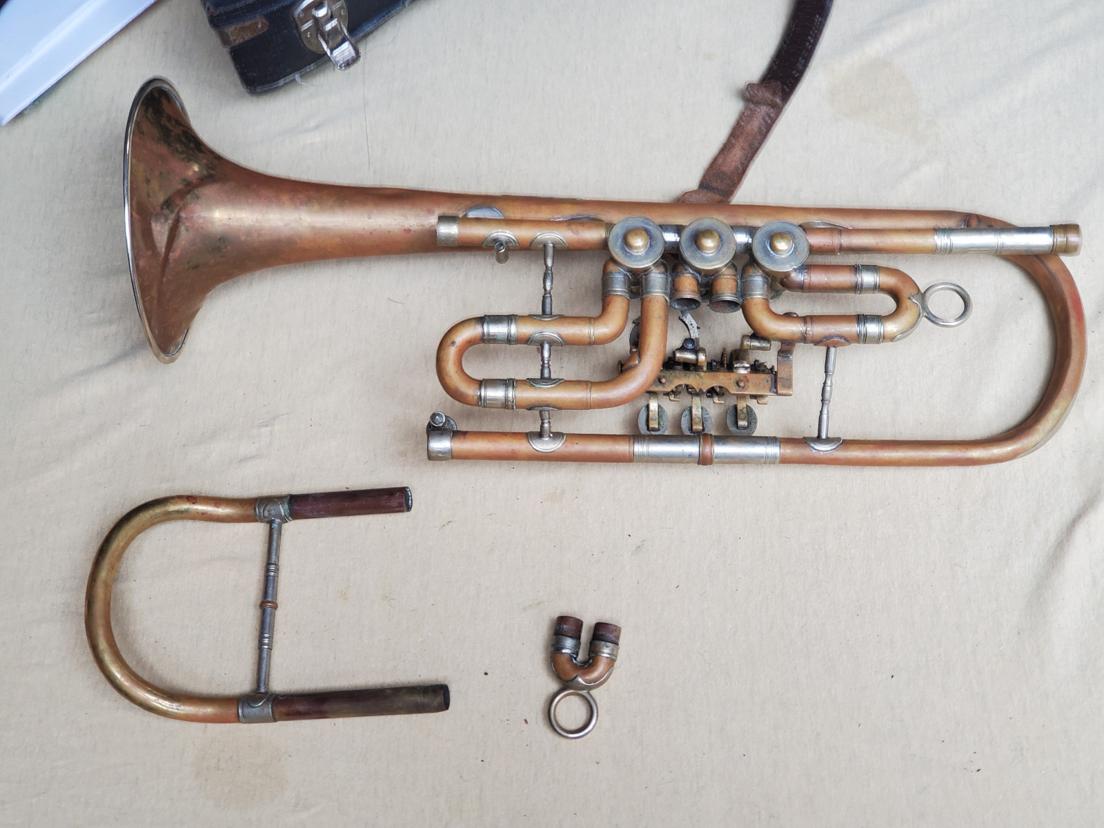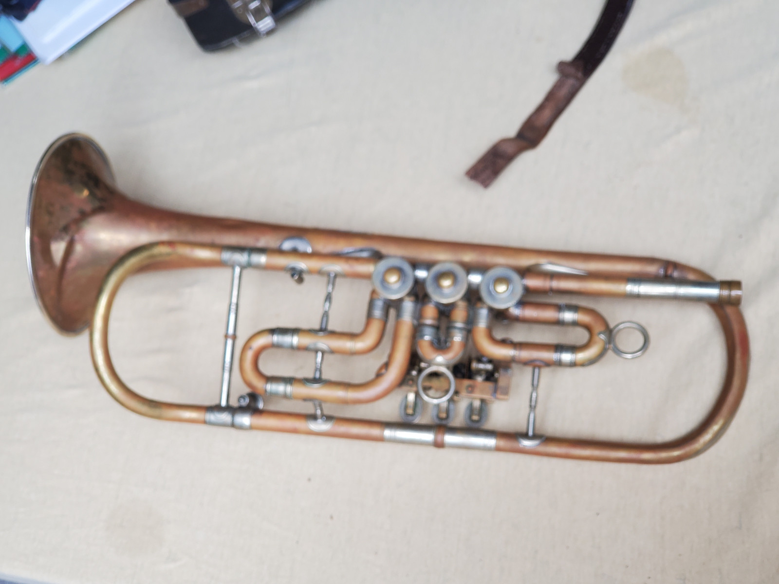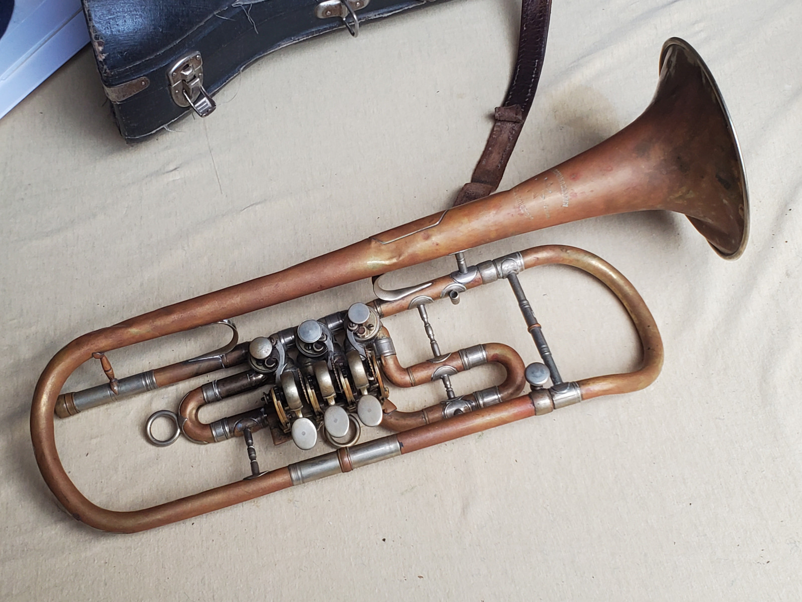 Old & interesting German Bb trumpet with rotary valves and addjustable preassure of the triggers. The bell reads "C G Schuster Jun. Schutzmarke Markneukirchen". Size of the horn is 43cm/17 inch. The tubing from the bell to the beginning of the mouthpice receiver is137cm / 54 inches long. Bellsize: 13,5cm, aprox. 5 1/4 inch. It plays in Bb. The valves are moveable, but one of the springs needs service. 2 slides are moveable, too. There are dents and bents in the bell and in the tubing. (see photos) It also showes old repair patches. Please make sure that you see all the photos. The instrument needs repair, service and cleaning. The case is worn.