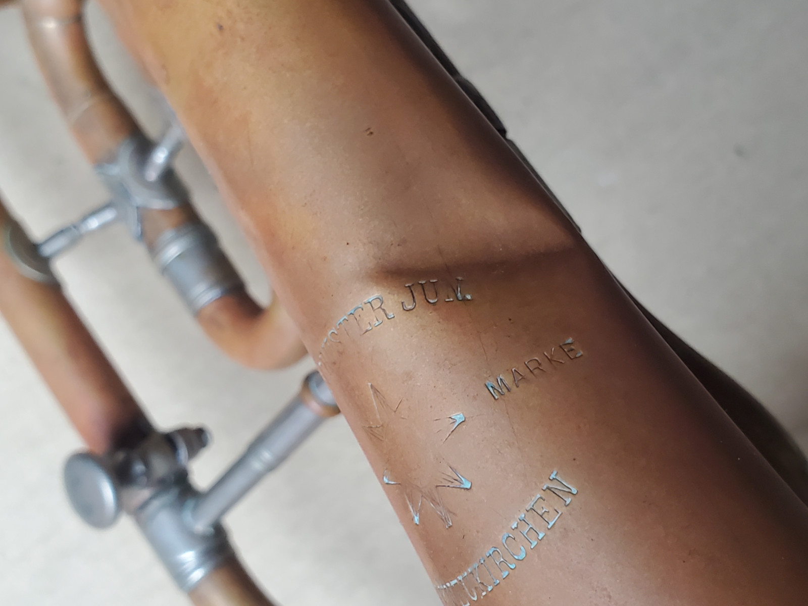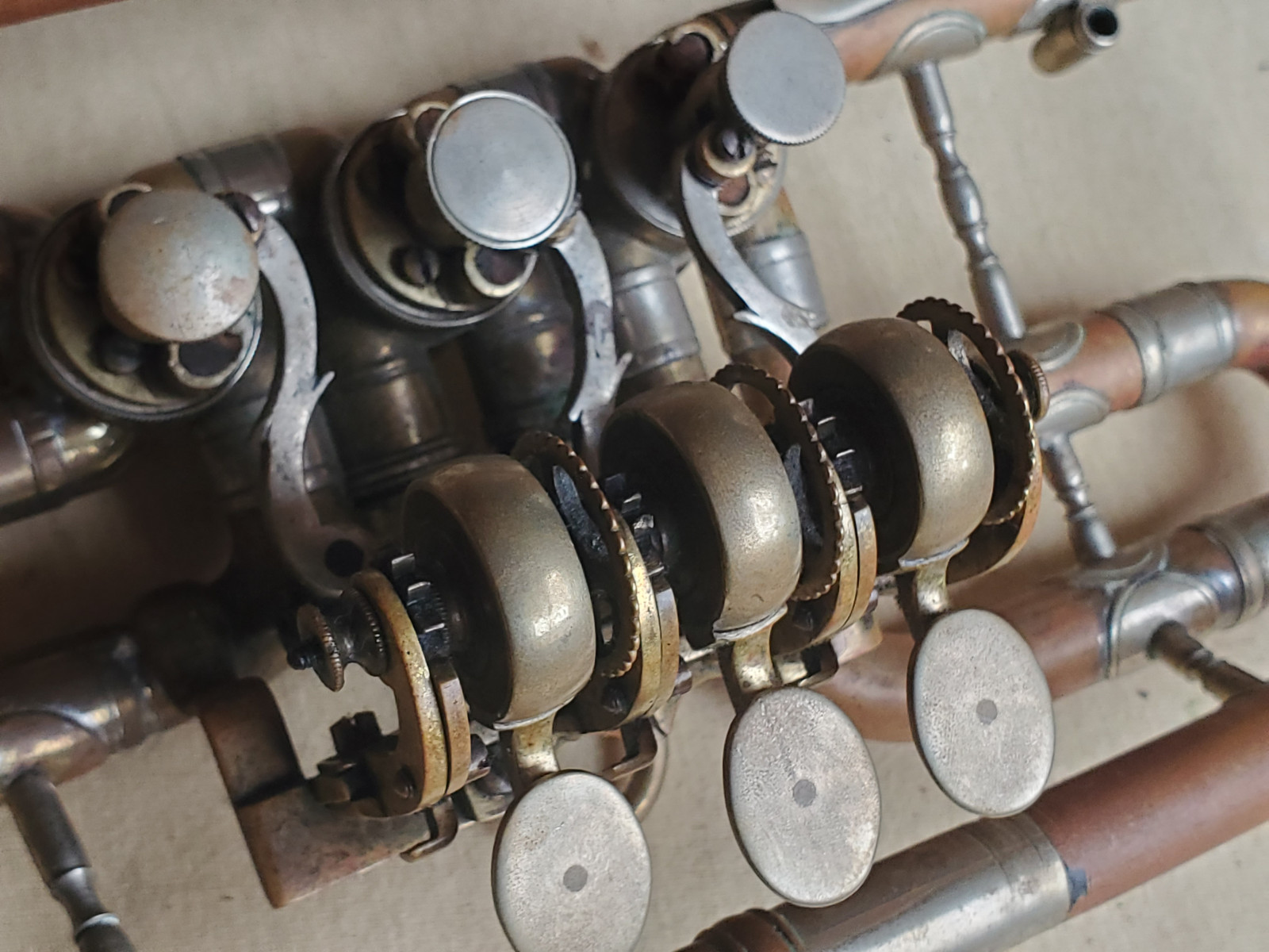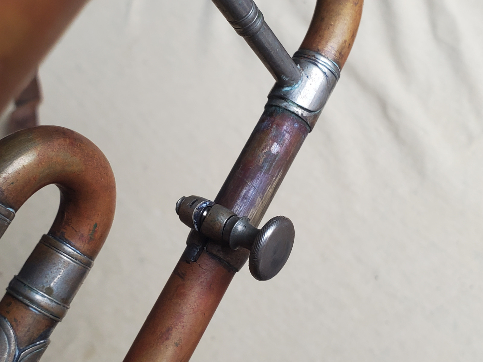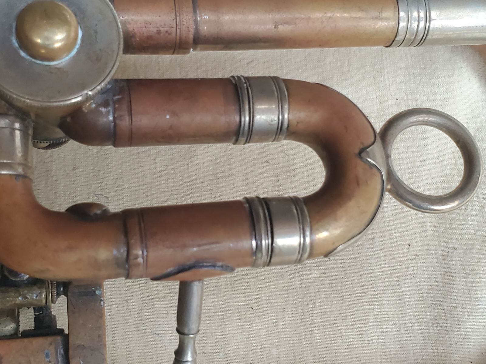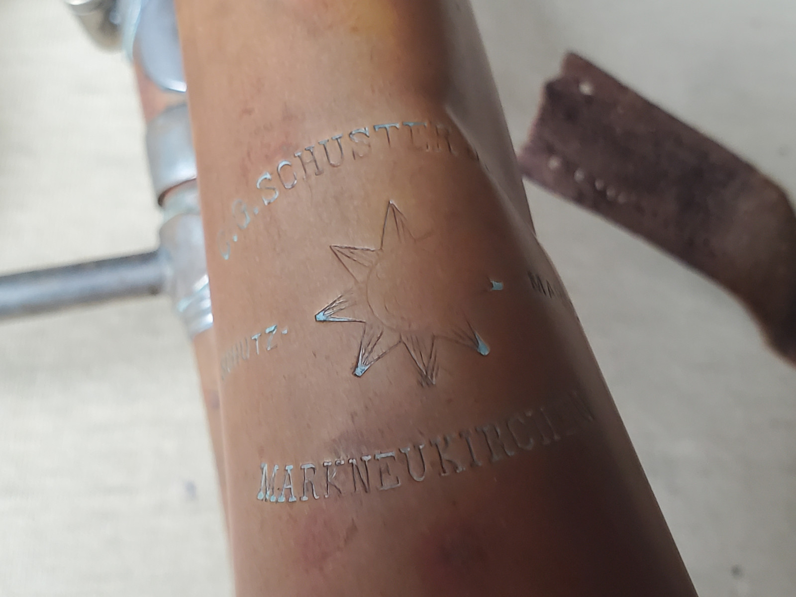 Old & interesting German Bb trumpet with rotary valves and addjustable preassure of the triggers. The bell reads "C G Schuster Jun. Schutzmarke Markneukirchen". Size of the horn is 43cm/17 inch. The tubing from the bell to the beginning of the mouthpice receiver is137cm / 54 inches long. Bellsize: 13,5cm, aprox. 5 1/4 inch. It plays in Bb. The valves are moveable, but one of the springs needs service. 2 slides are moveable, too. There are dents and bents in the bell and in the tubing. (see photos) It also showes old repair patches. Please make sure that you see all the photos. The instrument needs repair, service and cleaning. The case is worn.