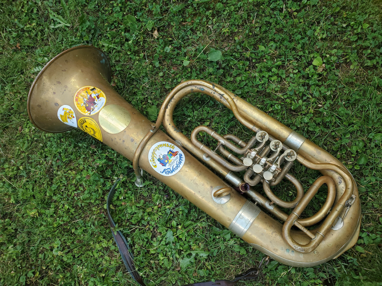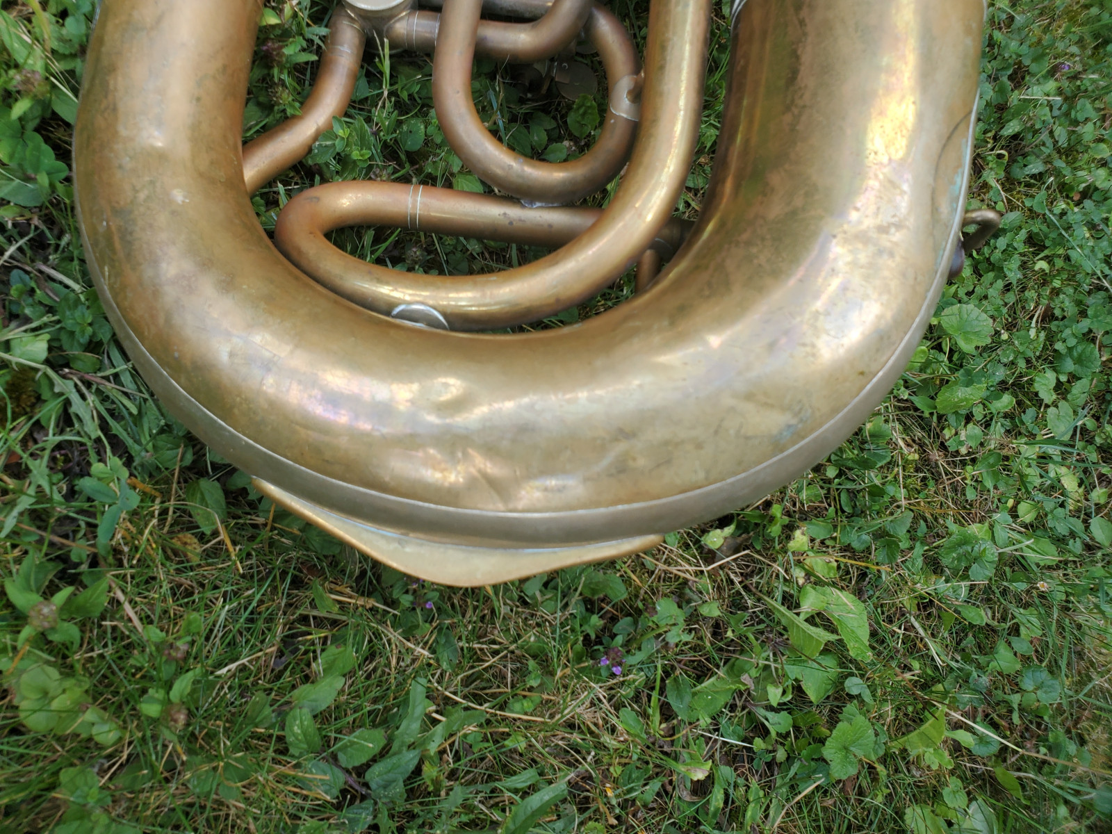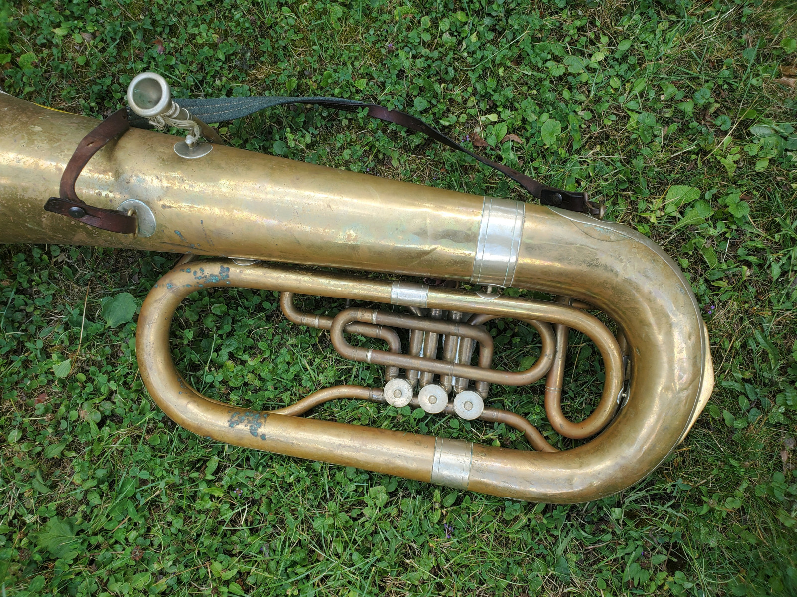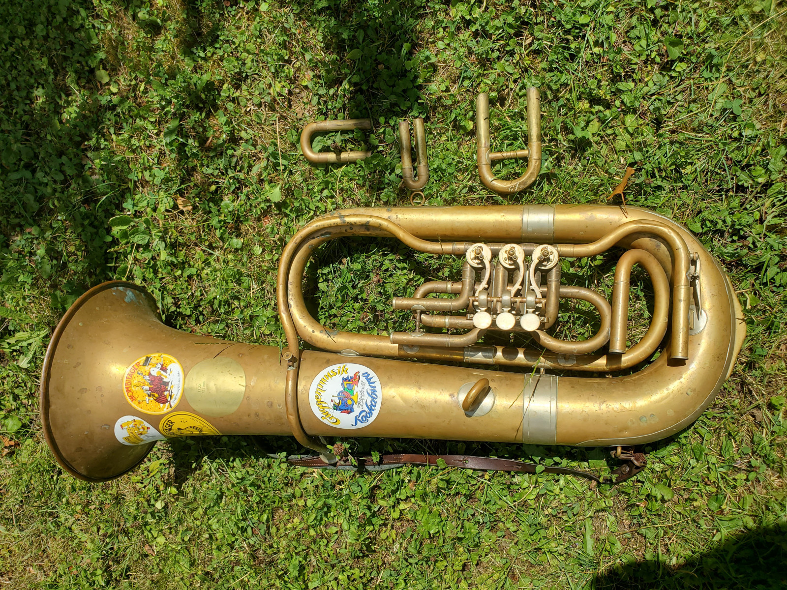 Very old German tuba in Eb(?) with rotary valves. The bell reads "1933 No.1080" No makersname to be found.The mouthpiece reads "Hirsbrunner Aarau" (Switzerland)The instrument needs service and cleaning. There are minor dents and bents, in the bell and tubing. one of the braces need a little soldery repair. It also needs a little soldery repair, where the valves are fixed to the tubing. Please make sure, you see all the photos!. The valves are moving quite easy and fast. Three slides are moveable. Length of the tubing is approx. 438cm. (172,5 Inch) according to the length of the tubing, I belive that it is a Tuba in Eb, but as I do not play, Im not completely sure . Size of the horn is approx. 38inch/96,5cm. The bell meassures 13,5 inch/34cm . Insured shipping to USA or Canada amounts to $ 100. (big and heavy!!) The instrument needs service and cleaning. Please also view my other auctions with instruments. Shipping several items saves shippingfees.