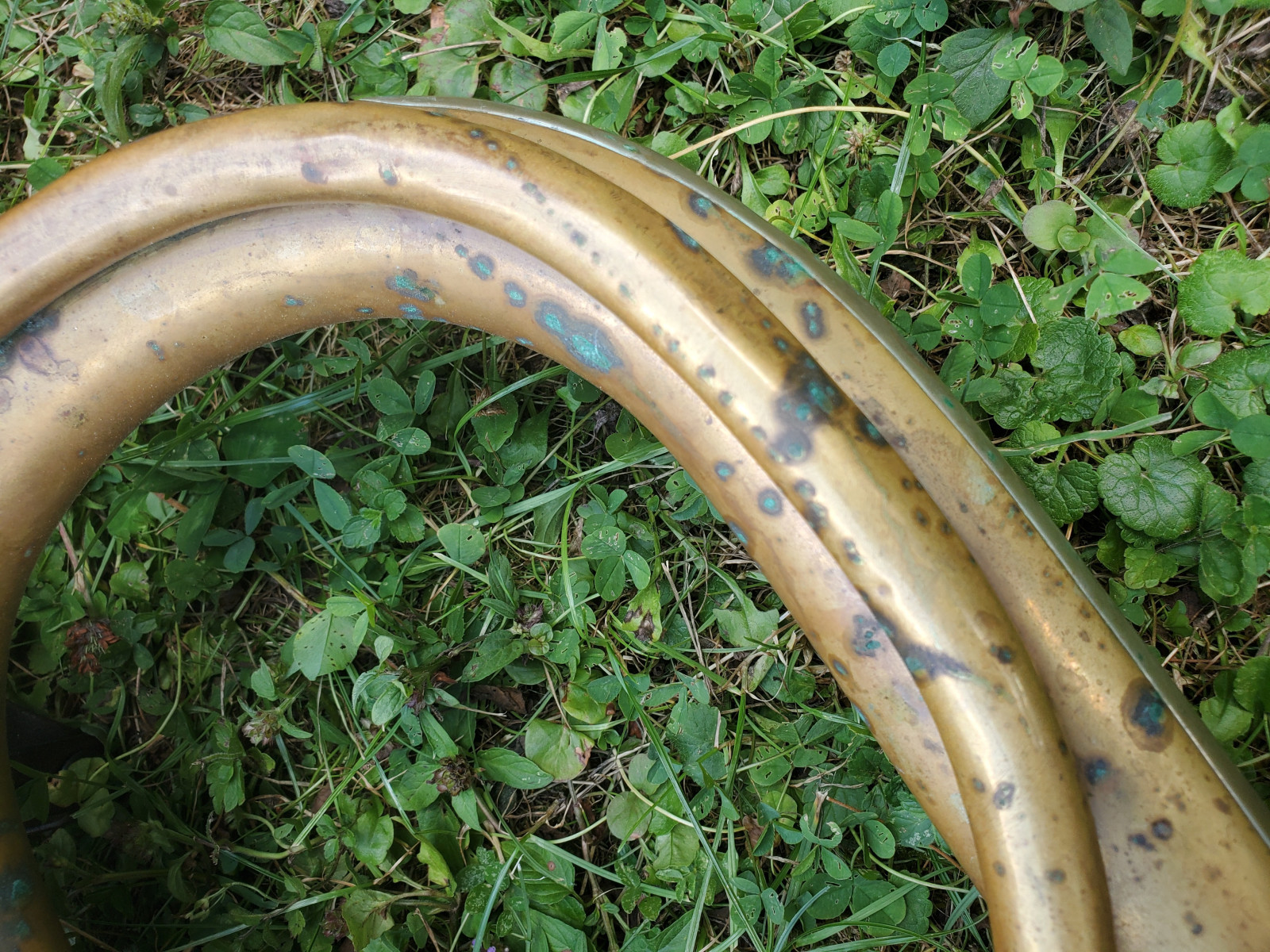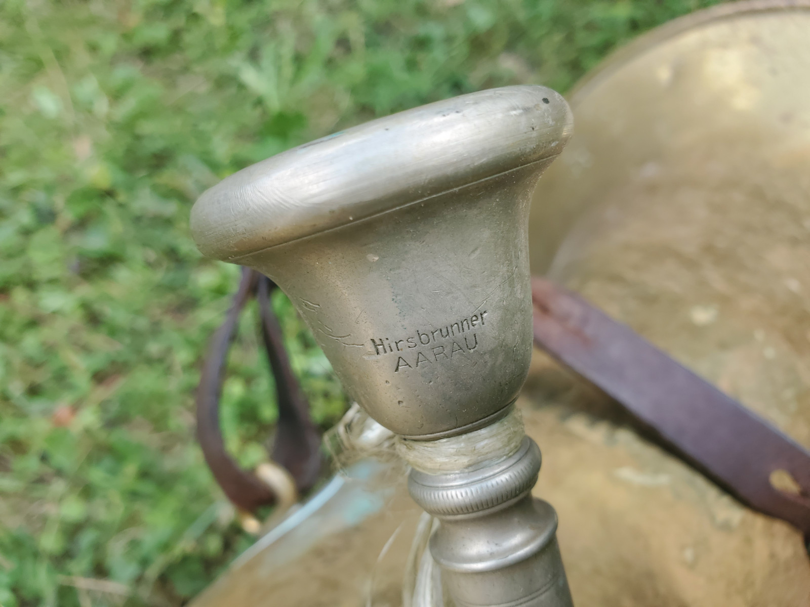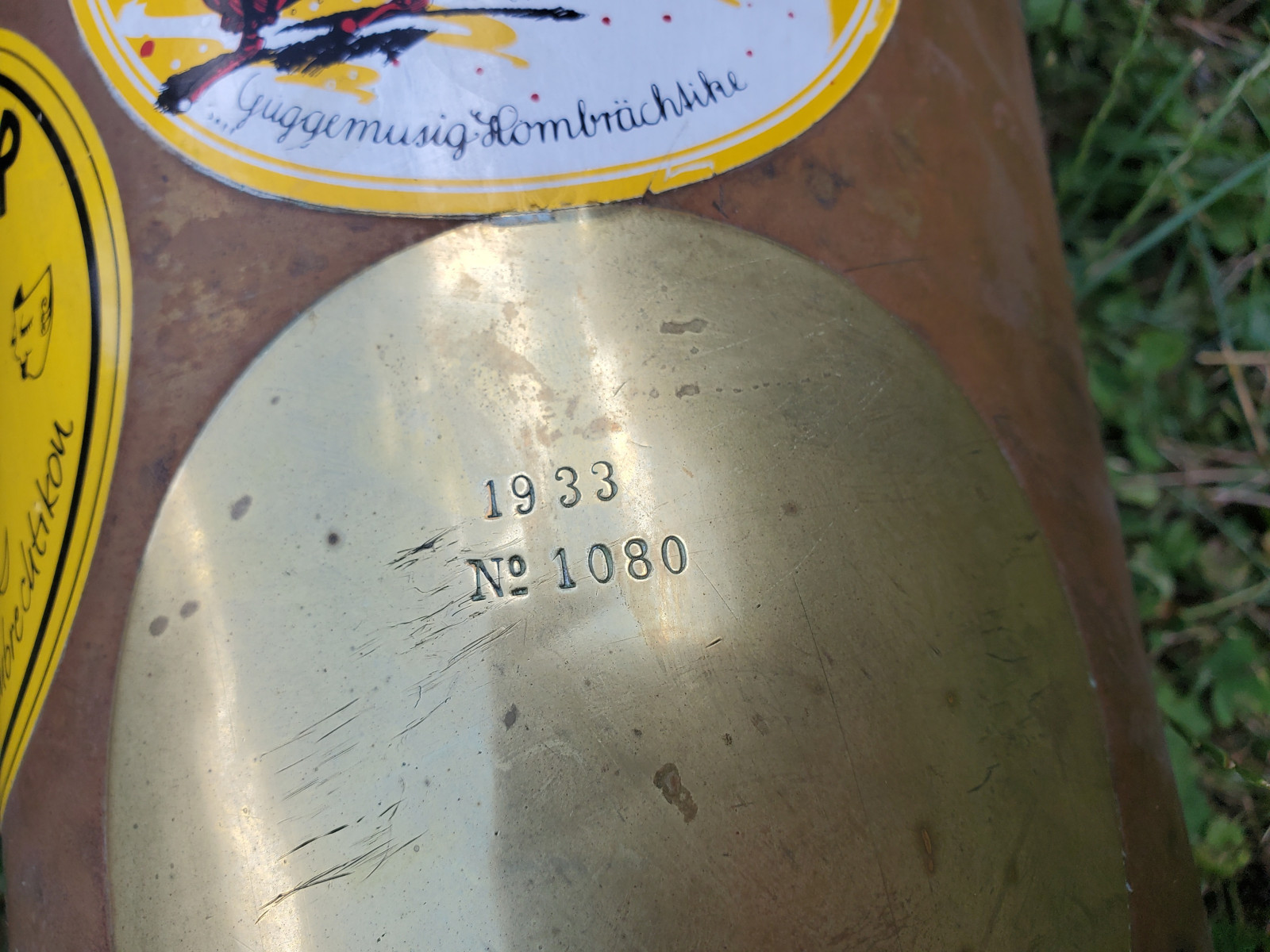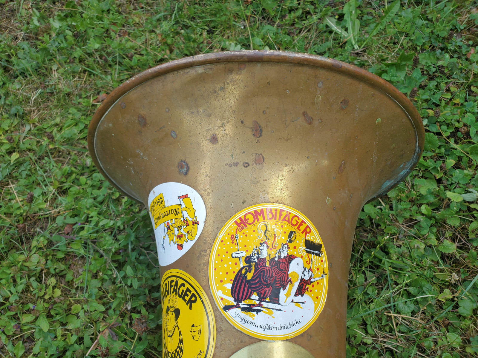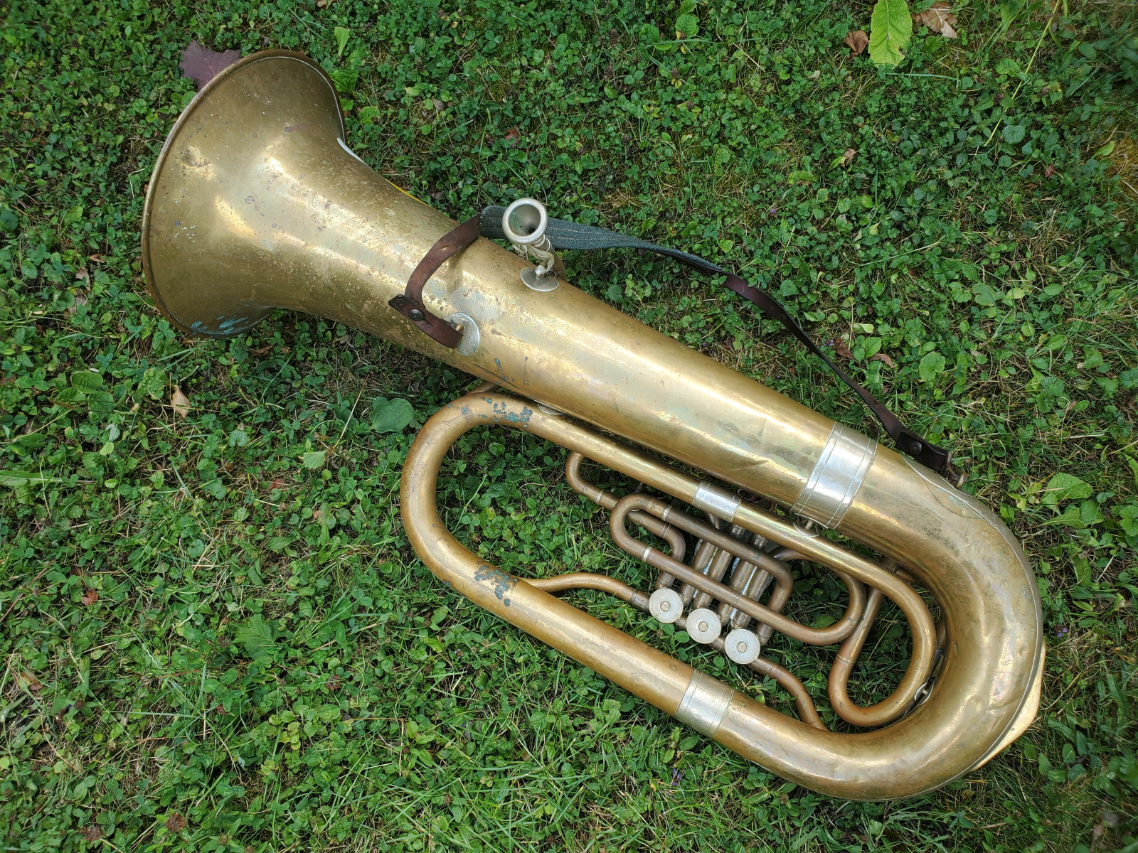 Very old German tuba in Eb(?) with rotary valves. The bell reads "1933 No.1080" No makersname to be found.The mouthpiece reads "Hirsbrunner Aarau" (Switzerland)The instrument needs service and cleaning. There are minor dents and bents, in the bell and tubing. one of the braces need a little soldery repair. It also needs a little soldery repair, where the valves are fixed to the tubing. Please make sure, you see all the photos!. The valves are moving quite easy and fast. Three slides are moveable. Length of the tubing is approx. 438cm. (172,5 Inch) according to the length of the tubing, I belive that it is a Tuba in Eb, but as I do not play, Im not completely sure . Size of the horn is approx. 38inch/96,5cm. The bell meassures 13,5 inch/34cm . Insured shipping to USA or Canada amounts to $ 100. (big and heavy!!) The instrument needs service and cleaning. Please also view my other auctions with instruments. Shipping several items saves shippingfees.
