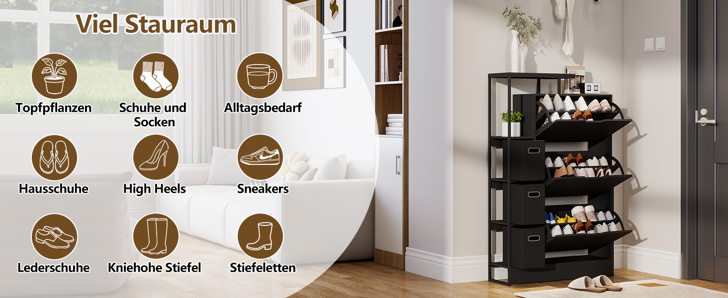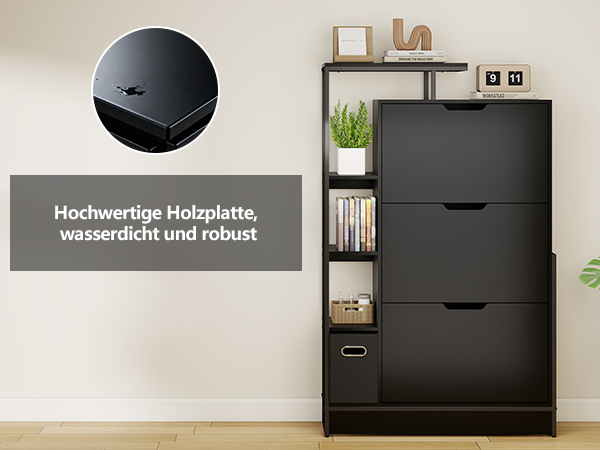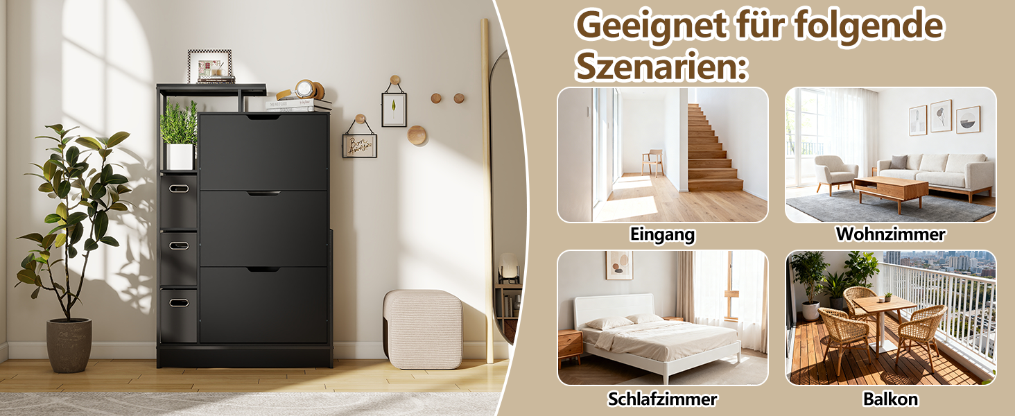 • Stilvoll und modern: Das schwarze Design verleiht dem Schuhschrank ein modernes Aussehen. Er passt perfekt in Flure, Eingangsbereiche und Wohnzimmer.