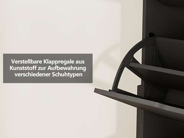 • Klapptüren: Dieser Schuhschrank verfügt über drei Klapptüren, die sich durch einfaches Herunterziehen der Griffe leicht öffnen lassen. Das Flip-design ist benutzerfreundlich und platzsparend.