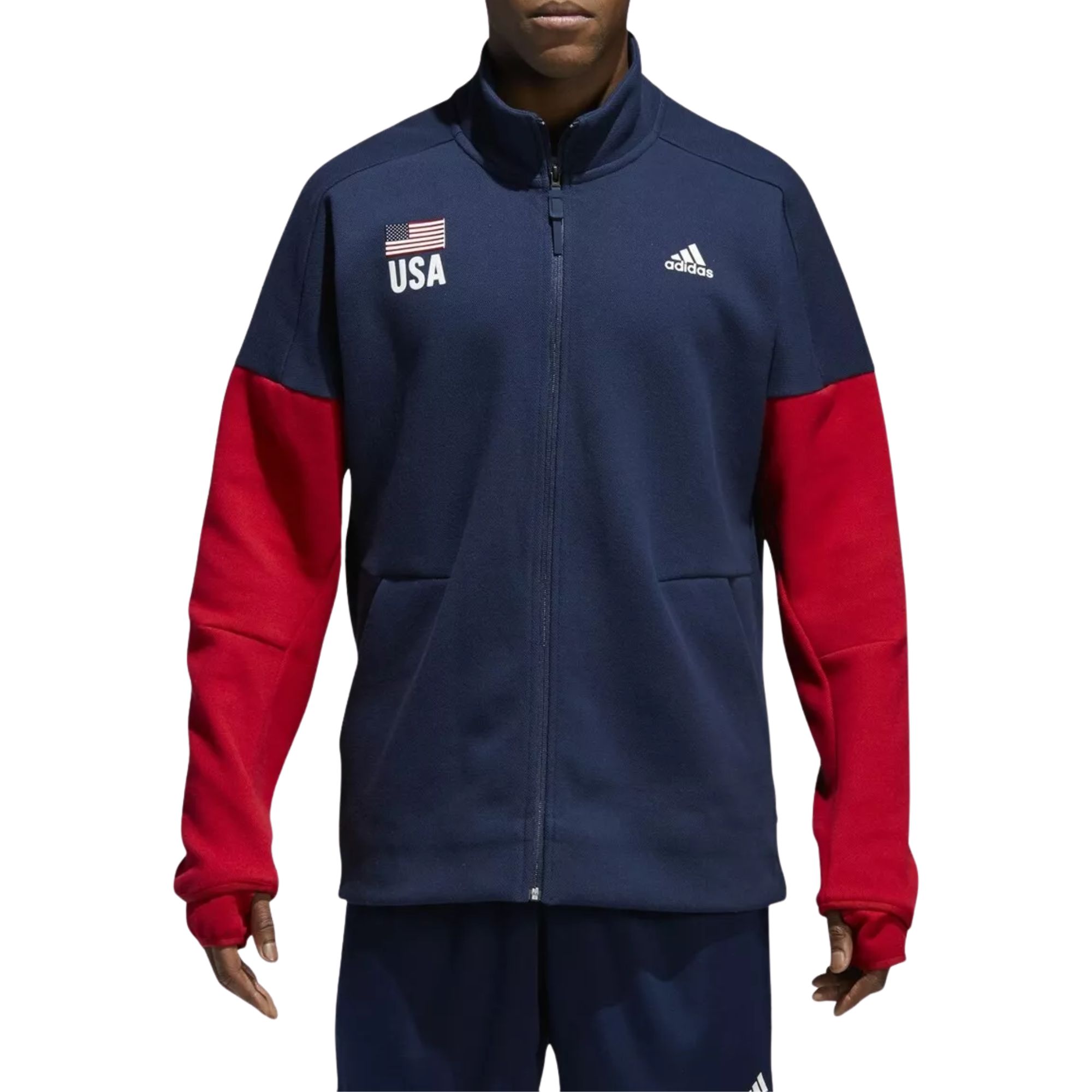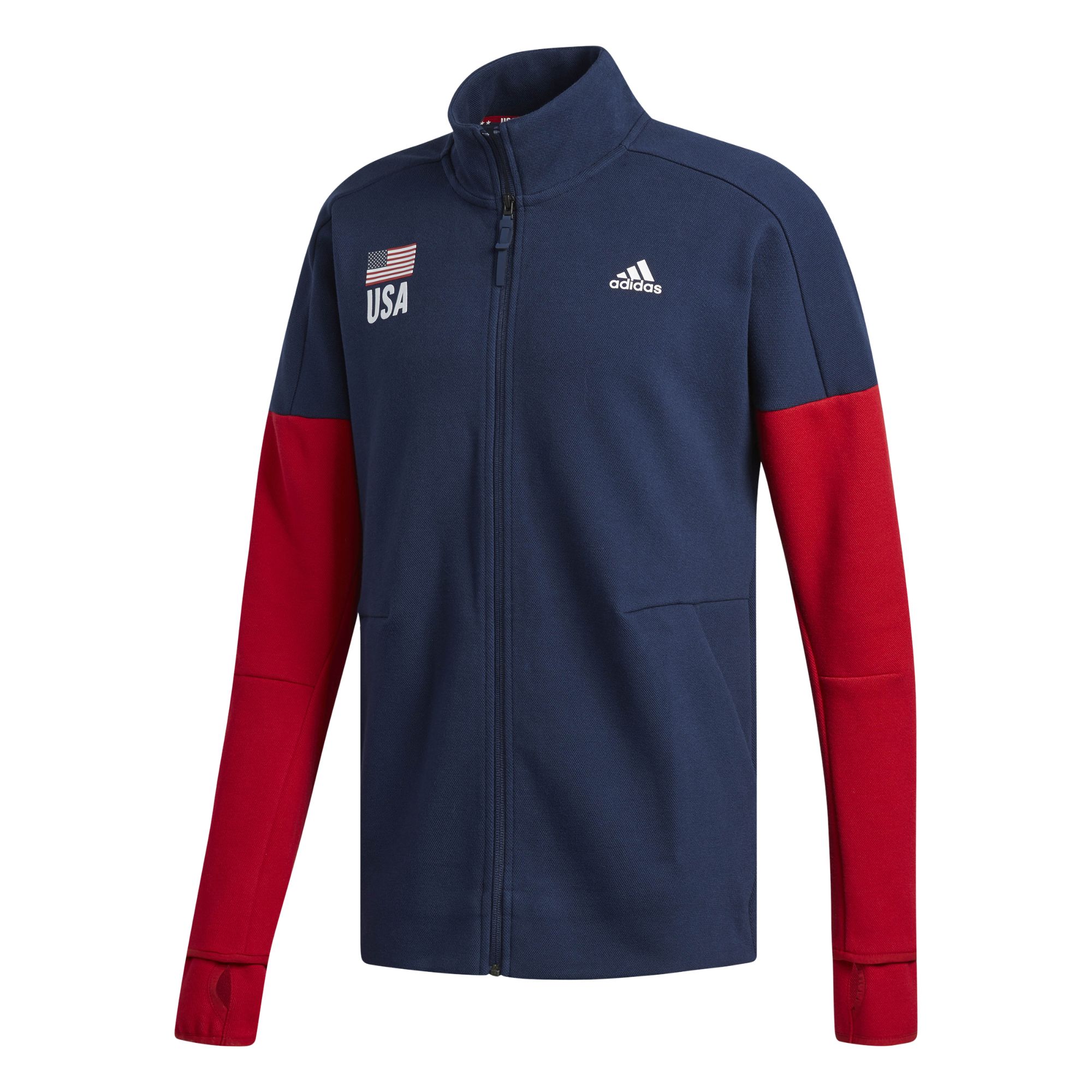 Recupera le energie fra un set e l'altro indossando questa giacca con full zip pensata per la pallavolo. Realizzata in filato e dotata di asole per i pollici pensate per tenere le mani calde prima della partita, sfoggia un motivo colorblock sulle maniche e il logo USA Volleyball sul petto.