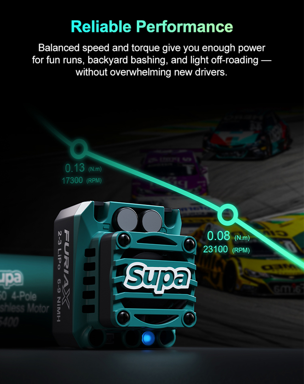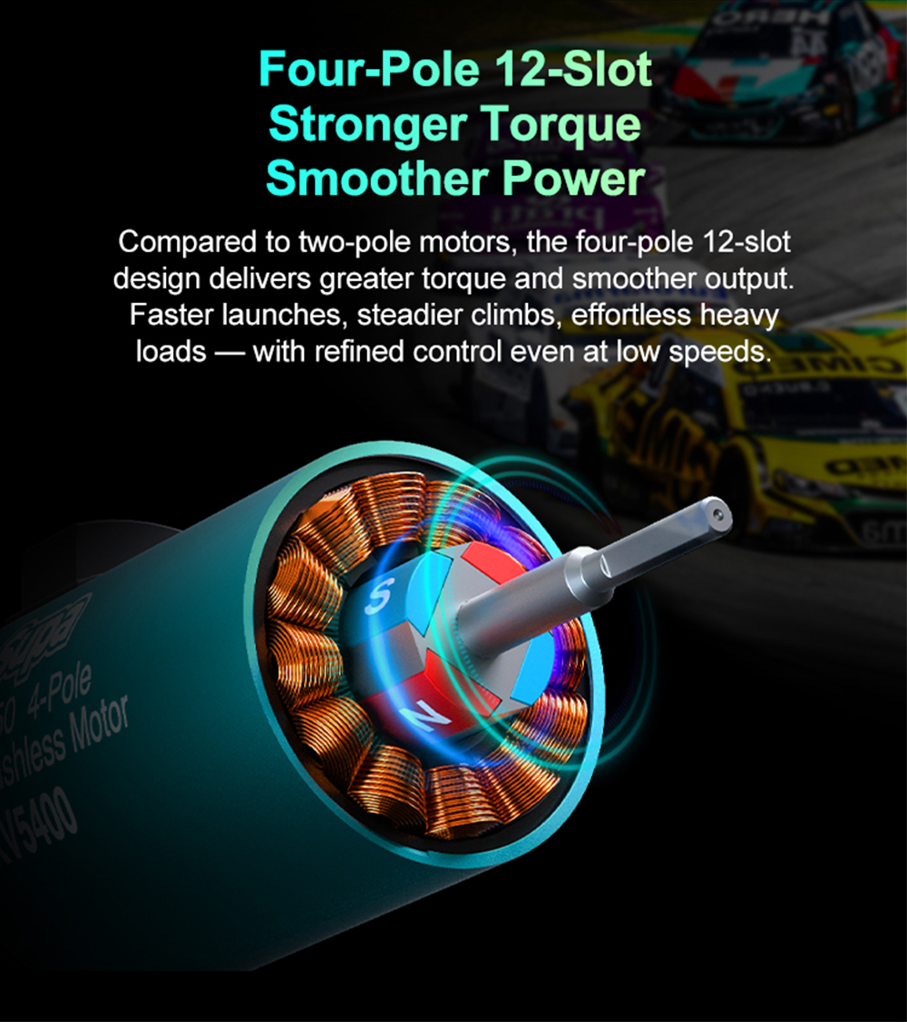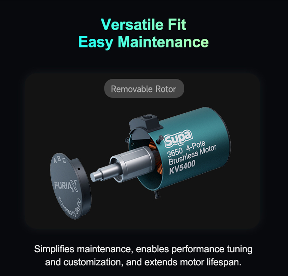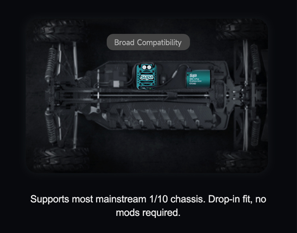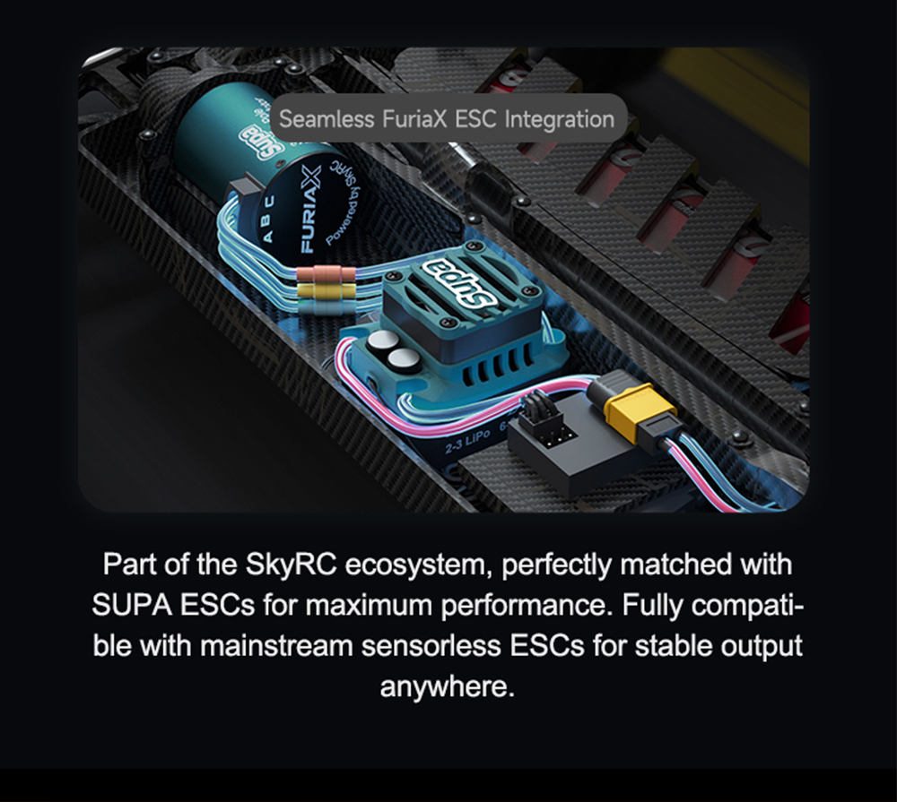 5. perfectly matched withSUPA ESCs for maximum performance. Fully compati-ble with mainstream sensorless ESCs for stable output anywhere.