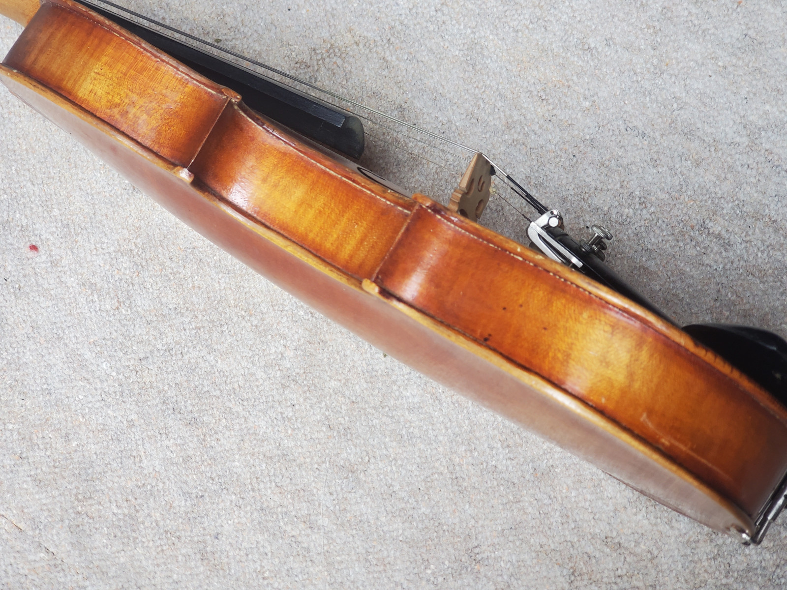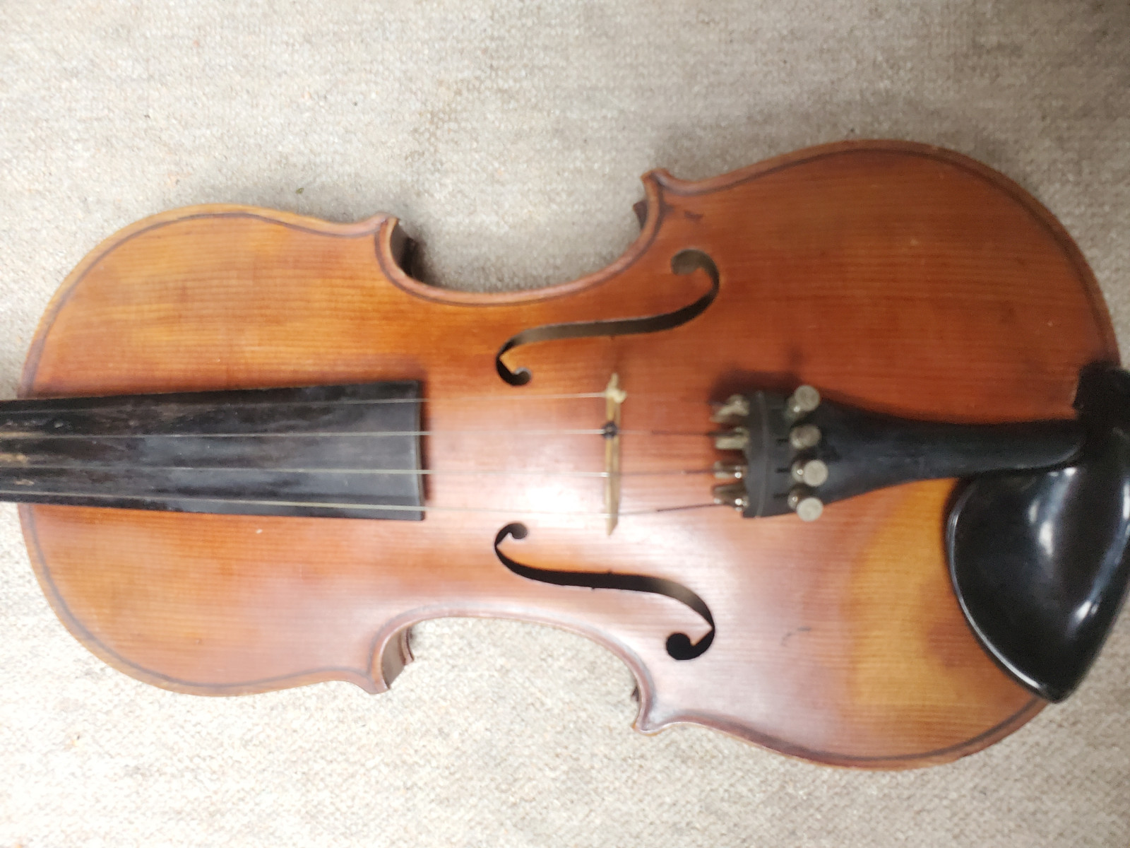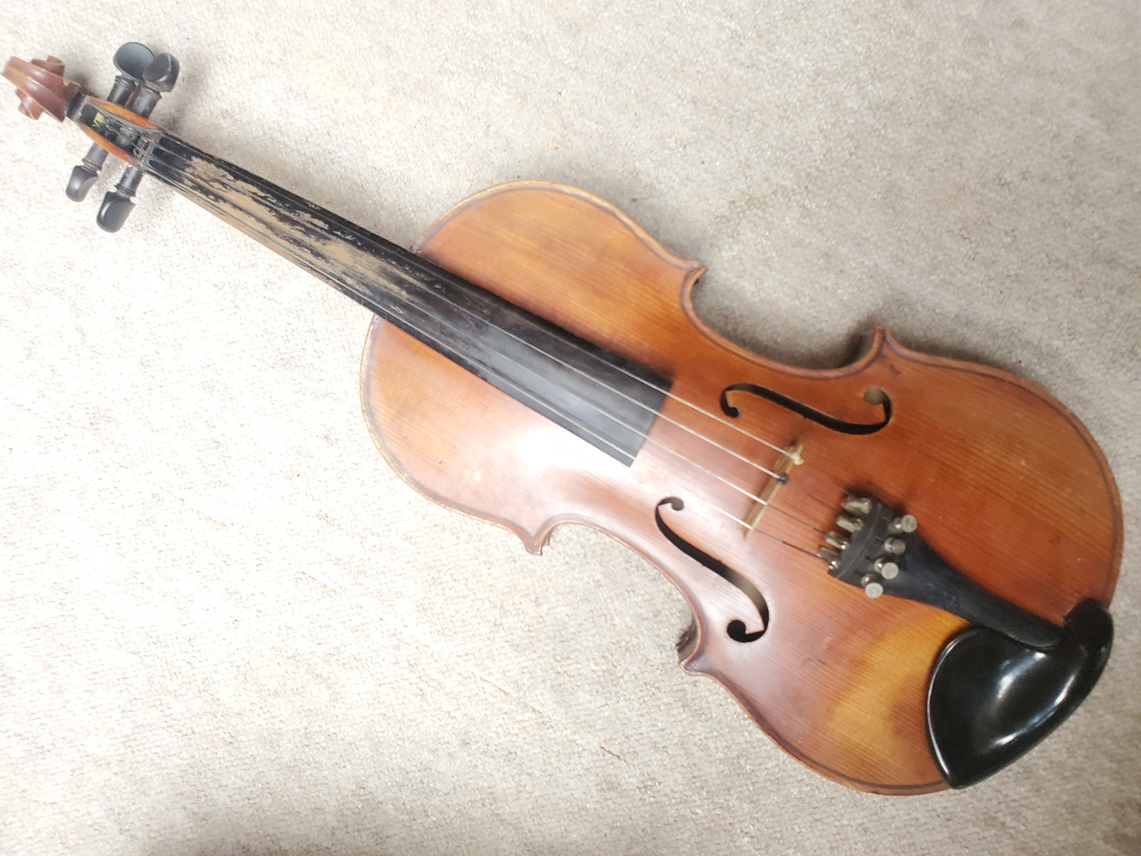 Nicel old 4/4 violin. No label inside. No cracks. The length of the violin is 58,8cm/ 23 1/8 inch. The body is 35,7cm (14 1/16 inch). Instrument needs cleaning and service. If you have any questions, please ask. Insured shipping to USA or Canada amounts to 59 USD. I will ship worldwide! Please also view my other auctions with instruments. Shipping several violins saves shippingfees. Please see my other auctions with string-, woodwind- and brass instruments .