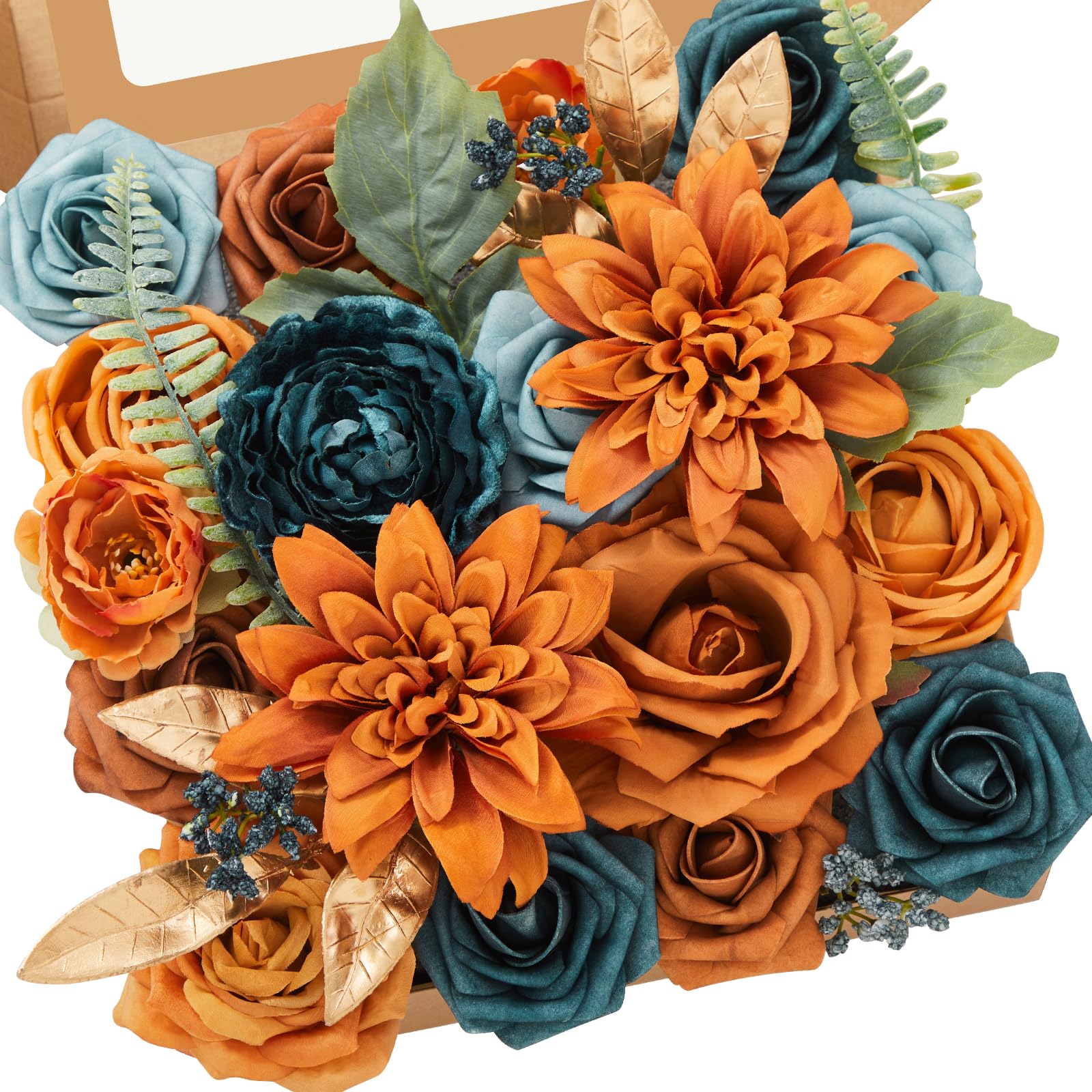 - 𝘼𝙧𝙩𝙞𝙛𝙞𝙘𝙞𝙖𝙡 𝙁𝙡𝙤𝙬𝙚𝙧𝙨 𝘿𝙚𝙩𝙖𝙞𝙡𝙨: dahlias *2, princess roses *2, snow mountain rose *1, diamond rose *1, peony *1, mini flower packs *2, PE flowers *9, gold leaves *2, matching leaves *2, blue grass *3, white grass *2, leaves *3, some small PE flowers and accessories.