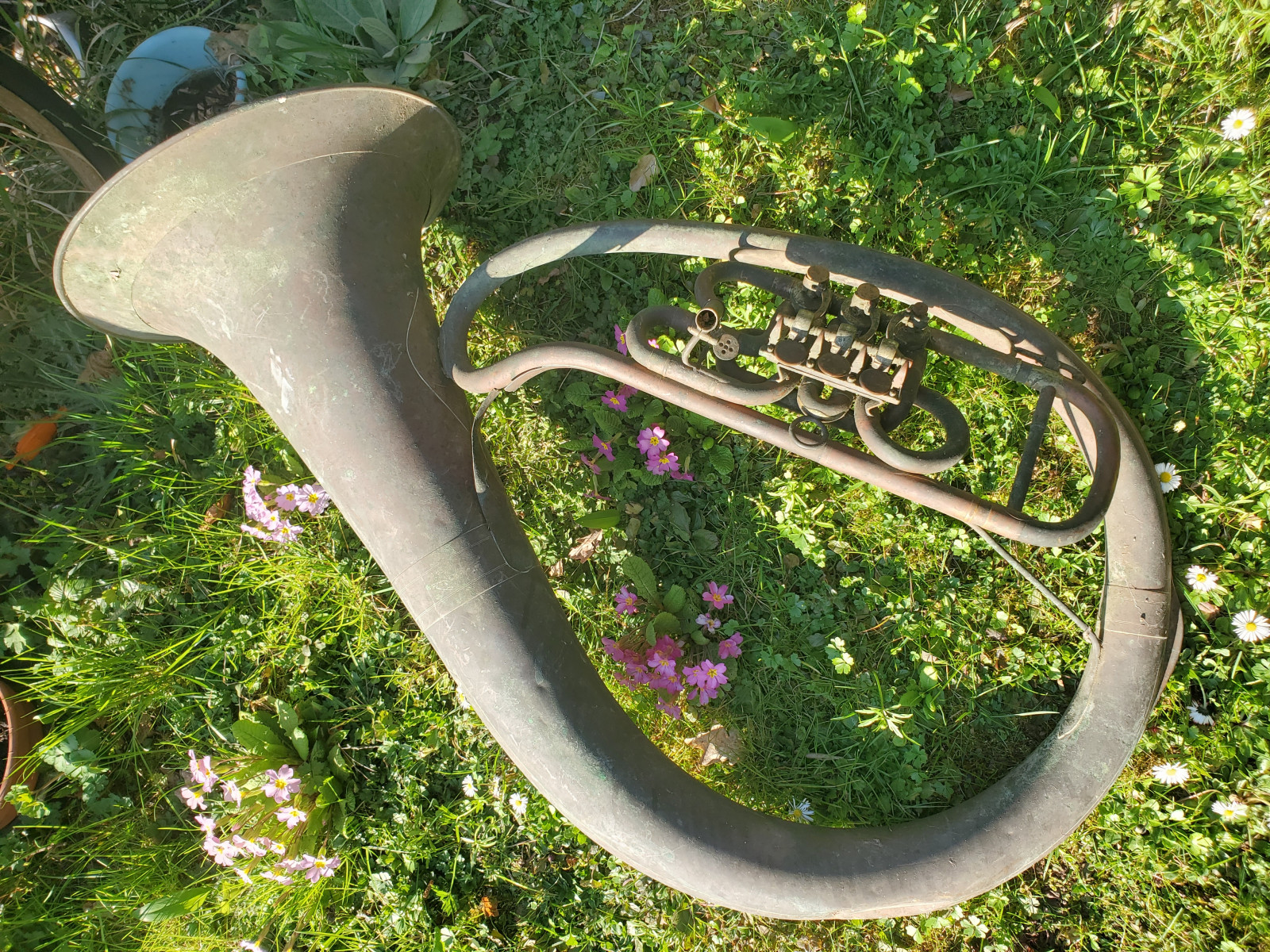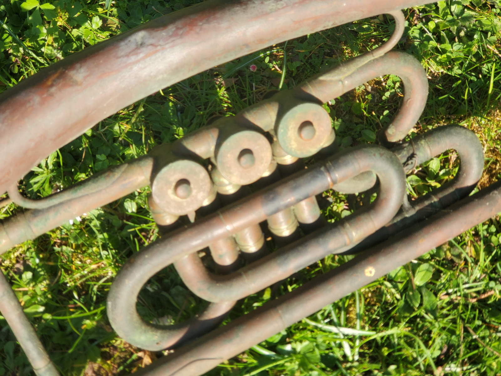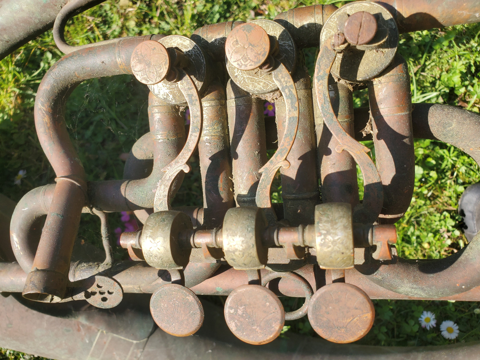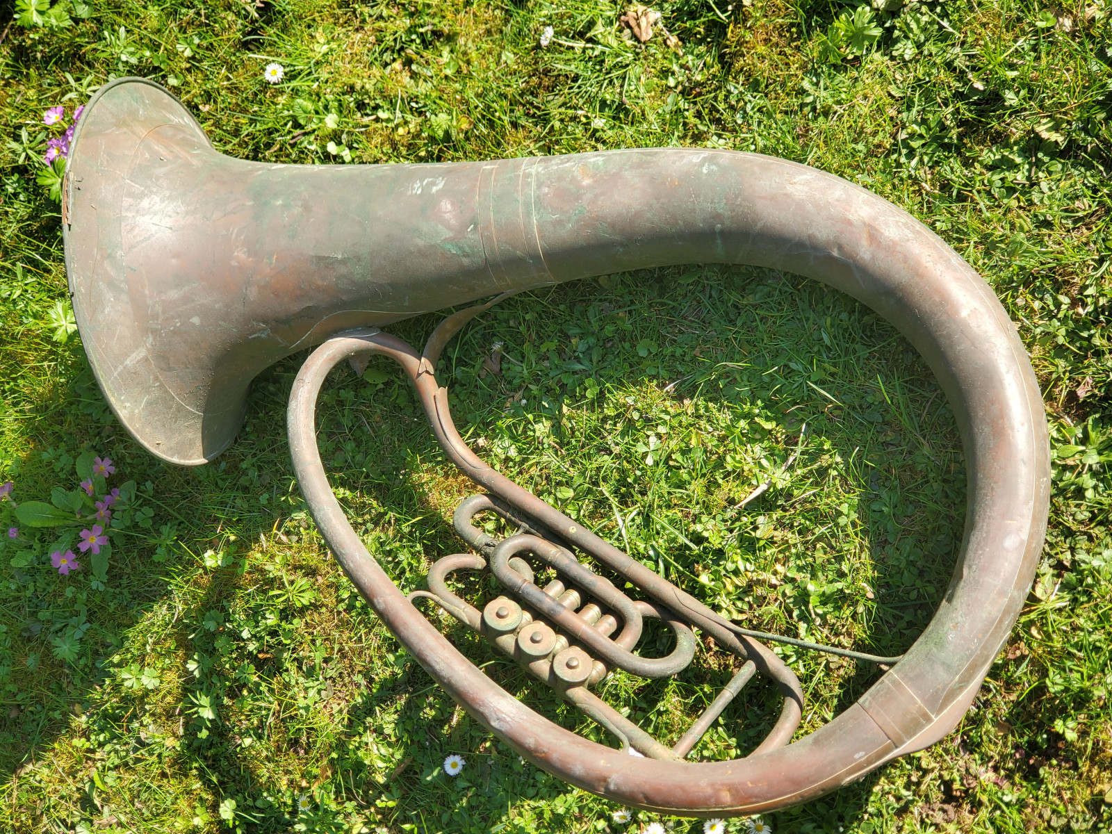 Very old damaged helicon tuba with a garland and rotary valves. There is a makersname at the garland, but it is not readable because of the dirt. The instrument is very dirty!. I dont know the key of the instrument. The brass is partly brickly, the instrument showes dents, cracks and damages at the bell and tubing. The Instrument needs serious repair, service and cleaning. Maybe only for decoration or spareparts. The leadpipe is missing. The