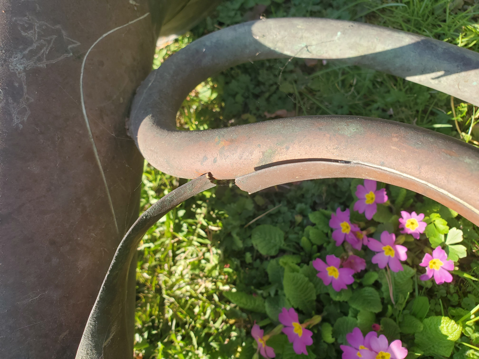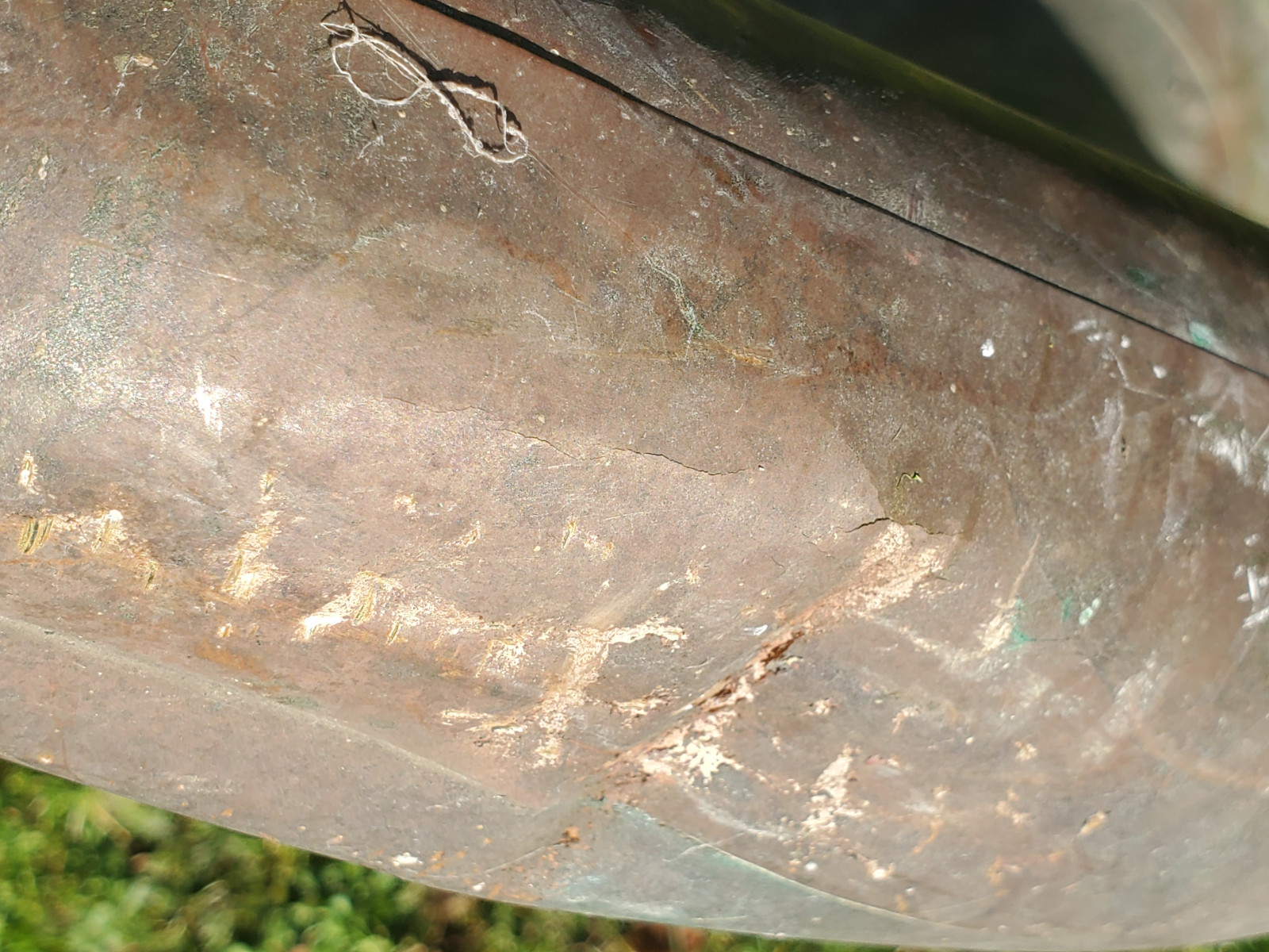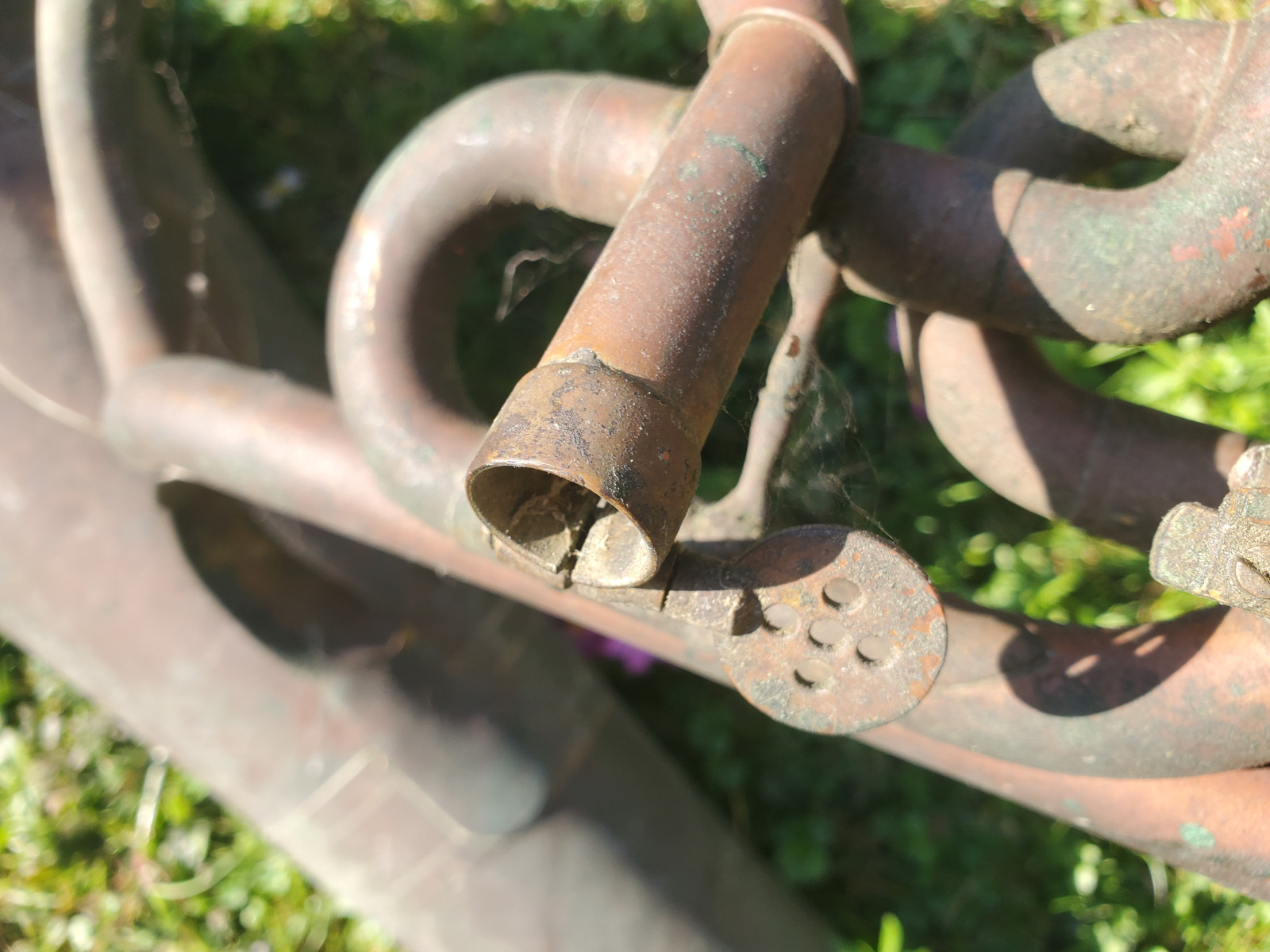 Very old damaged helicon tuba with a garland and rotary valves. There is a makersname at the garland, but it is not readable because of the dirt. The instrument is very dirty!. I dont know the key of the instrument. The brass is partly brickly, the instrument showes dents, cracks and damages at the bell and tubing. The Instrument needs serious repair, service and cleaning. Maybe only for decoration or spareparts. The leadpipe is missing. The