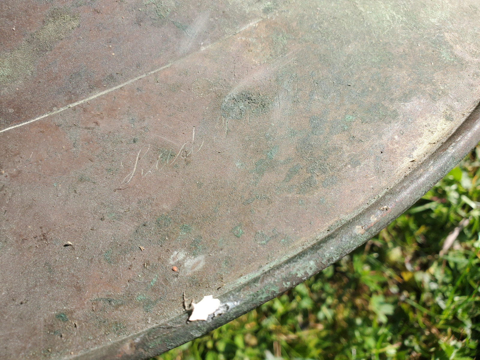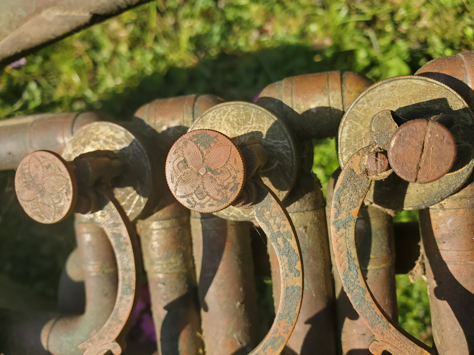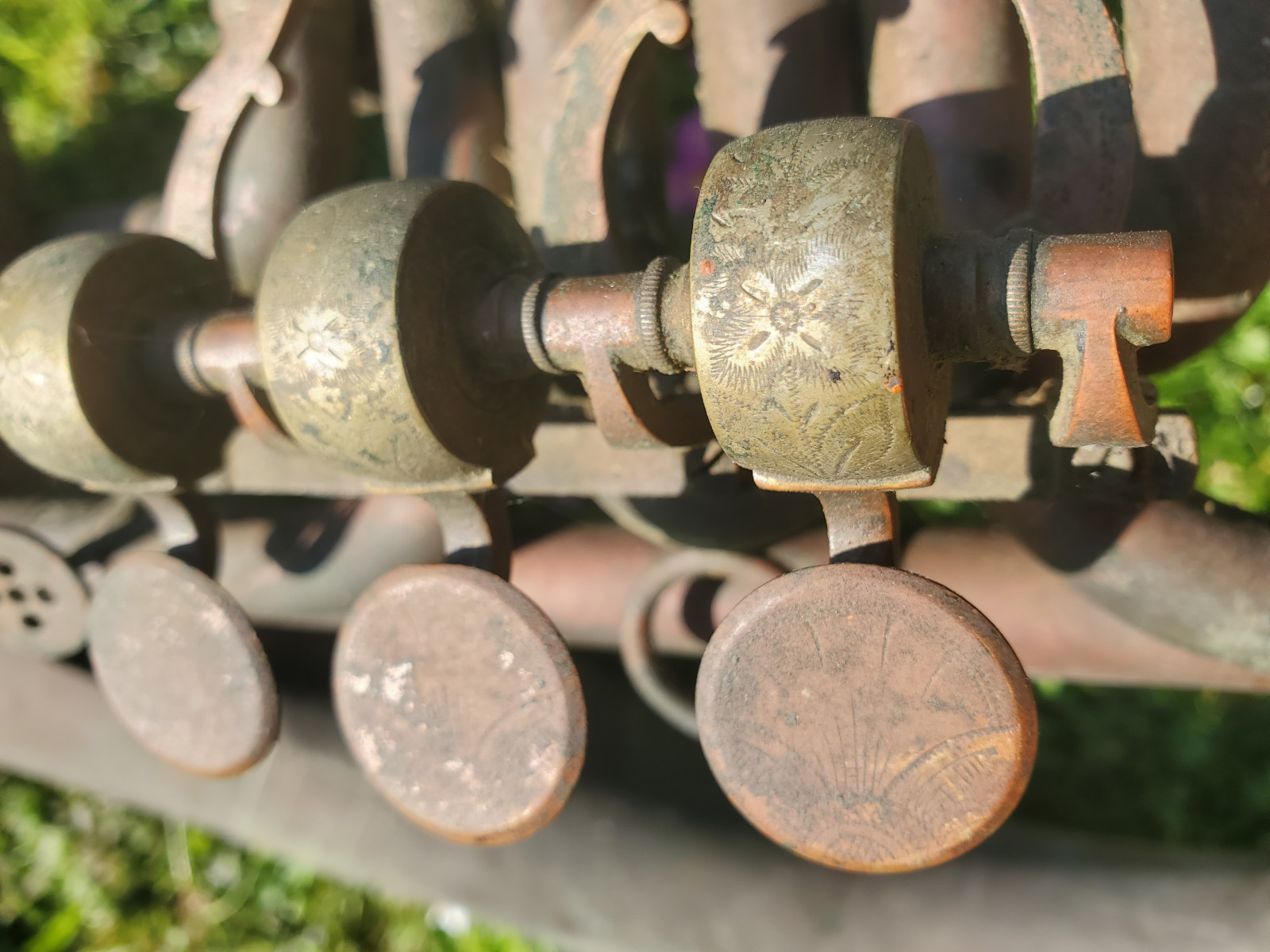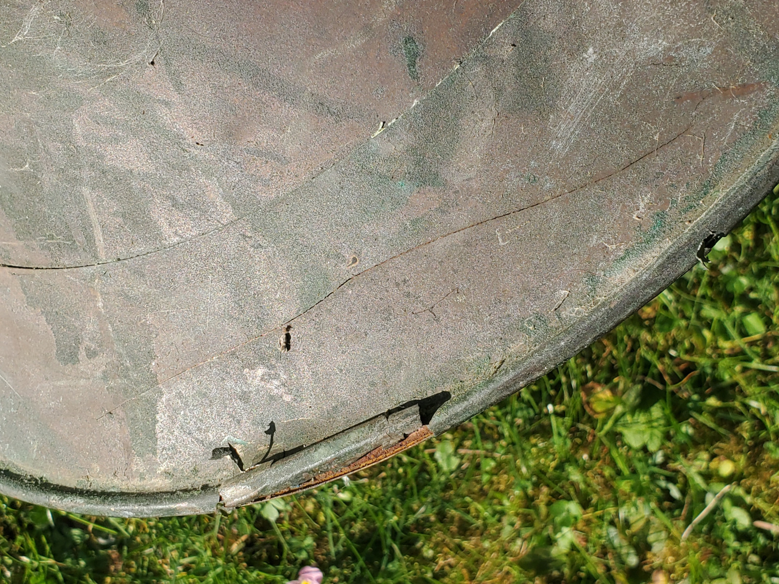 Very old damaged helicon tuba with a garland and rotary valves. There is a makersname at the garland, but it is not readable because of the dirt. The instrument is very dirty!. I dont know the key of the instrument. The brass is partly brickly, the instrument showes dents, cracks and damages at the bell and tubing. The Instrument needs serious repair, service and cleaning. Maybe only for decoration or spareparts. The leadpipe is missing. The