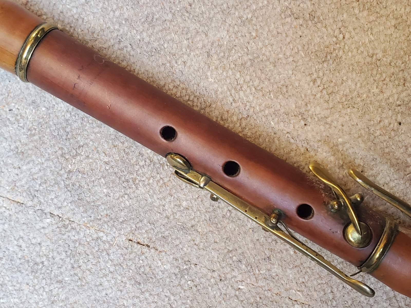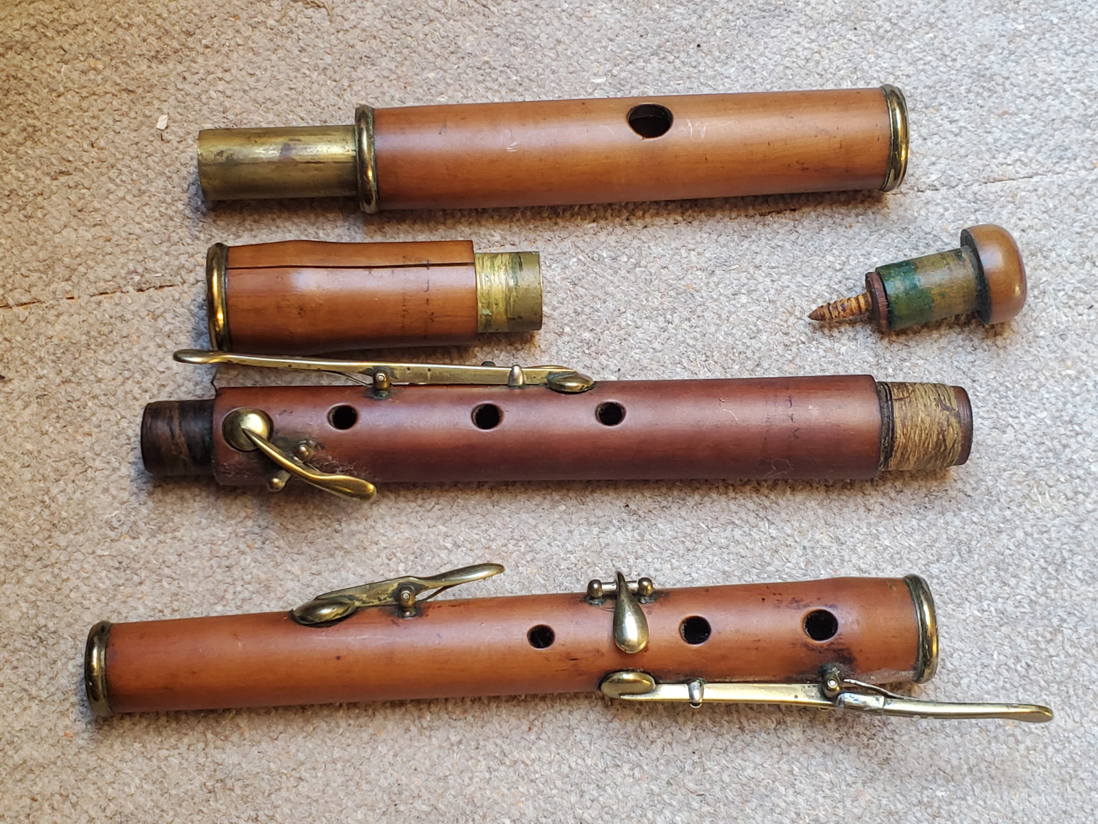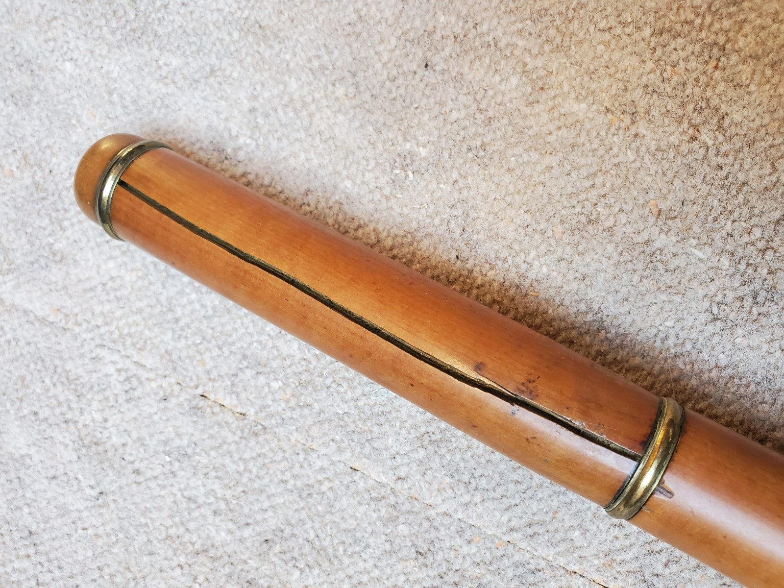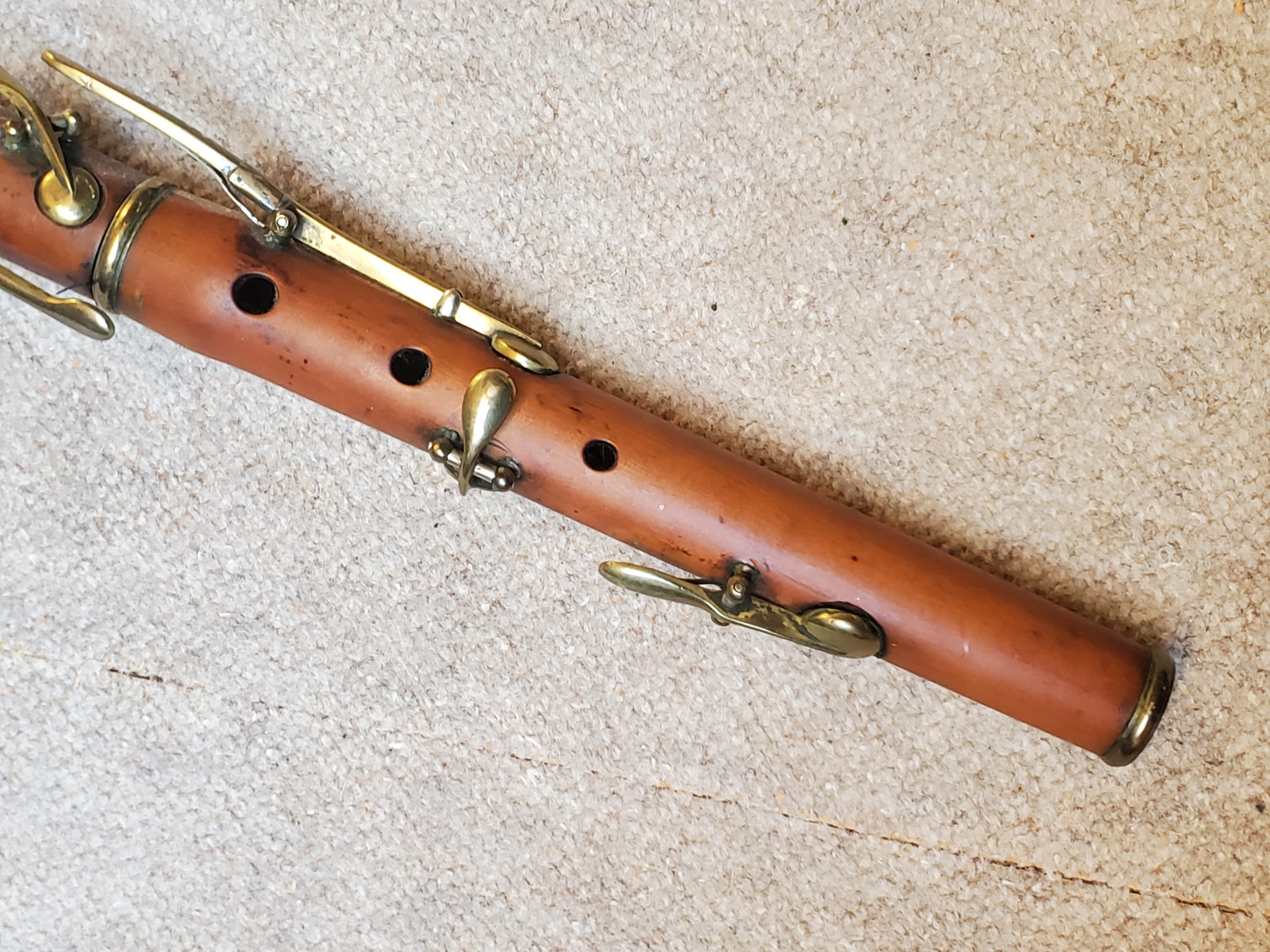 An interesting and antique flute made of brown wood. (Boxwood) It reads "Basta..." I dont know the key of the instrument. Unfortunatelly there are cracks at the head, barrel and 2nd mainpiece. There is an old repair at one of the brass keys. (see photos) Instrument needs to be repaired, cleaned, serviced and adjusted The instrument measures about 23 7/8Inch /60,5cm. The sounding length is 52,5cm (20 5/8 inches)Interesting antique instrument. Please make sure that you see all the photos. Worldwide shipping amounts to $35.