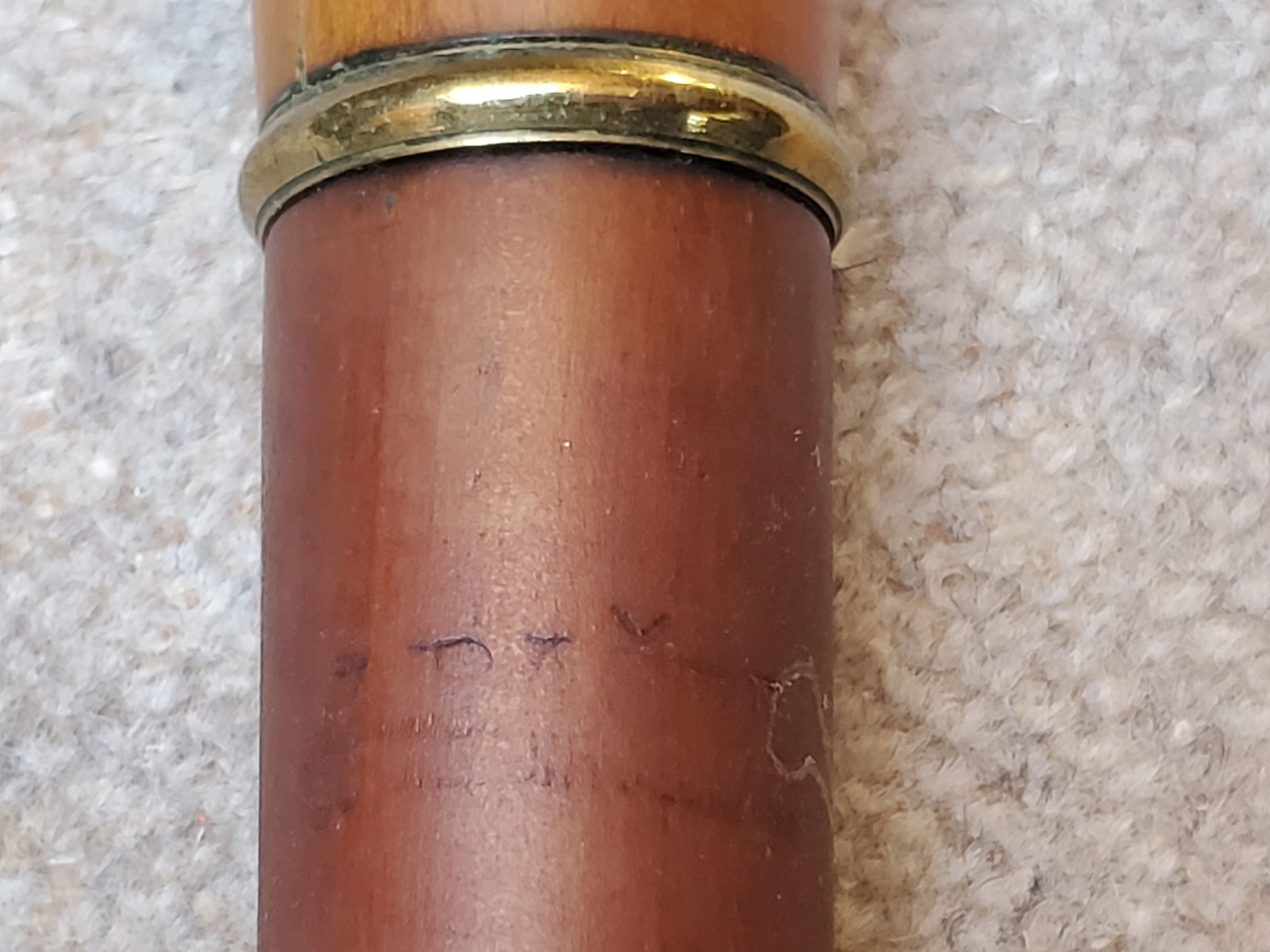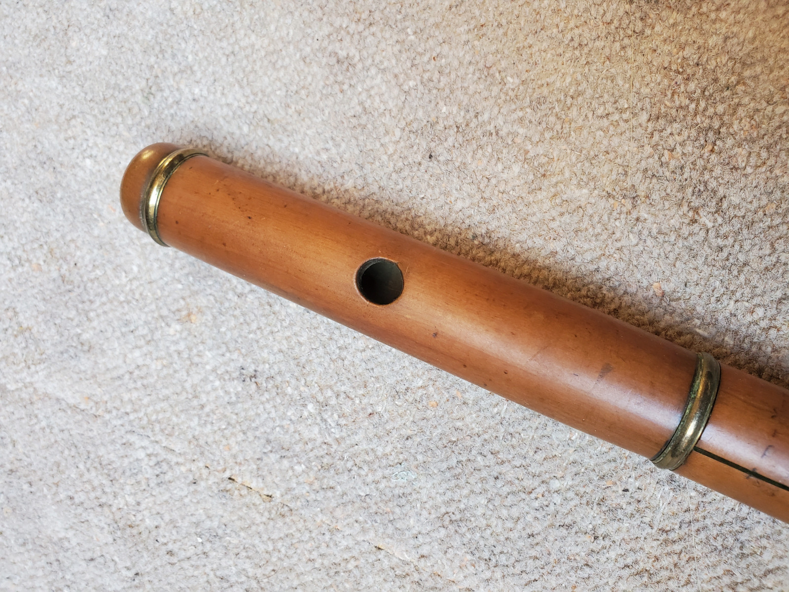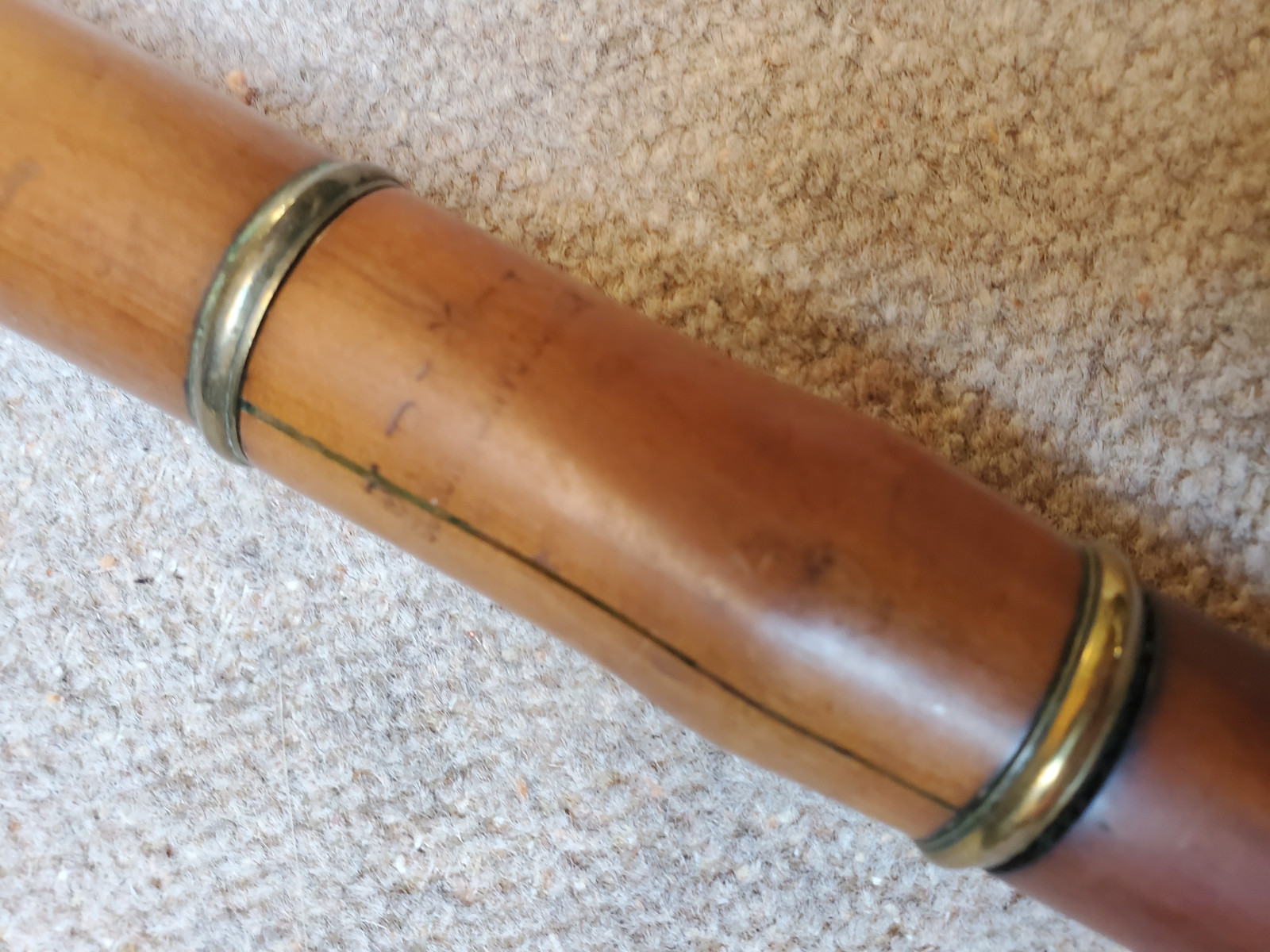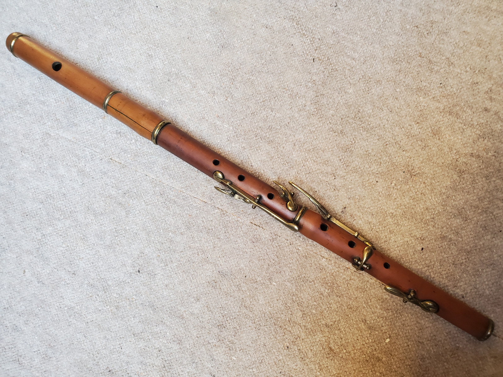 An interesting and antique flute made of brown wood. (Boxwood) It reads "Basta..." I dont know the key of the instrument. Unfortunatelly there are cracks at the head, barrel and 2nd mainpiece. There is an old repair at one of the brass keys. (see photos) Instrument needs to be repaired, cleaned, serviced and adjusted The instrument measures about 23 7/8Inch /60,5cm. The sounding length is 52,5cm (20 5/8 inches)Interesting antique instrument. Please make sure that you see all the photos. Worldwide shipping amounts to $35.