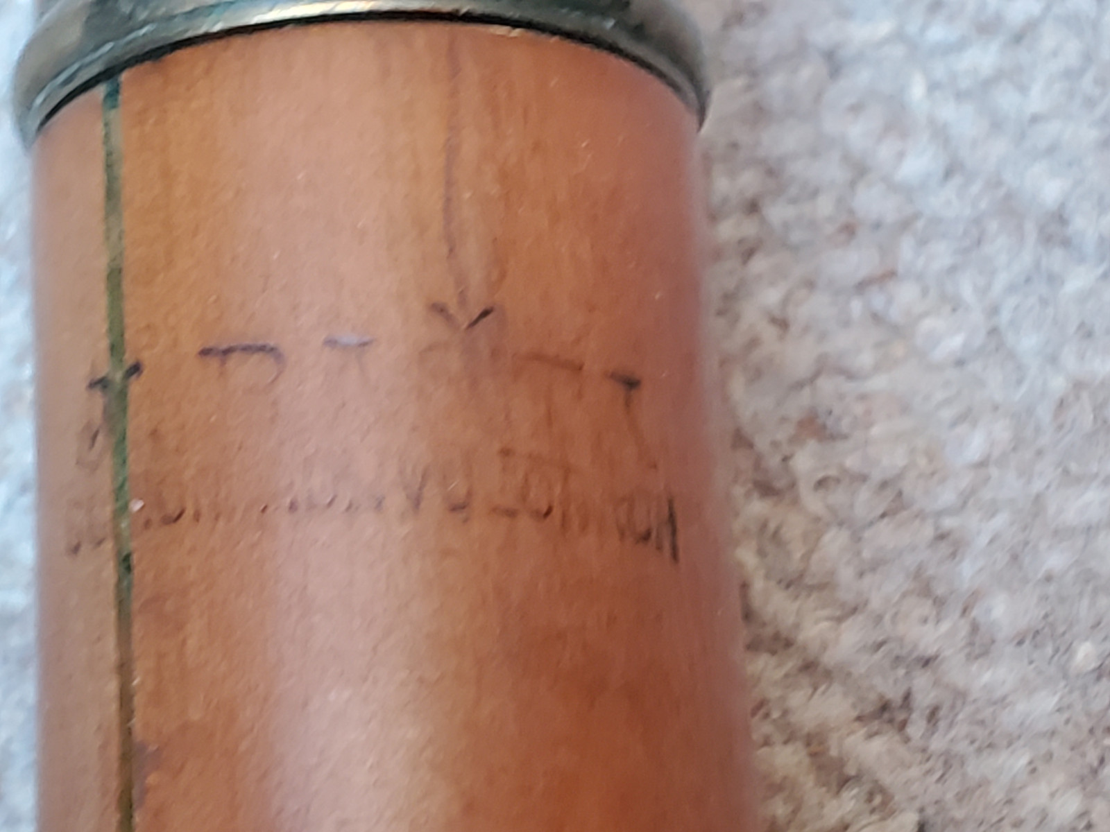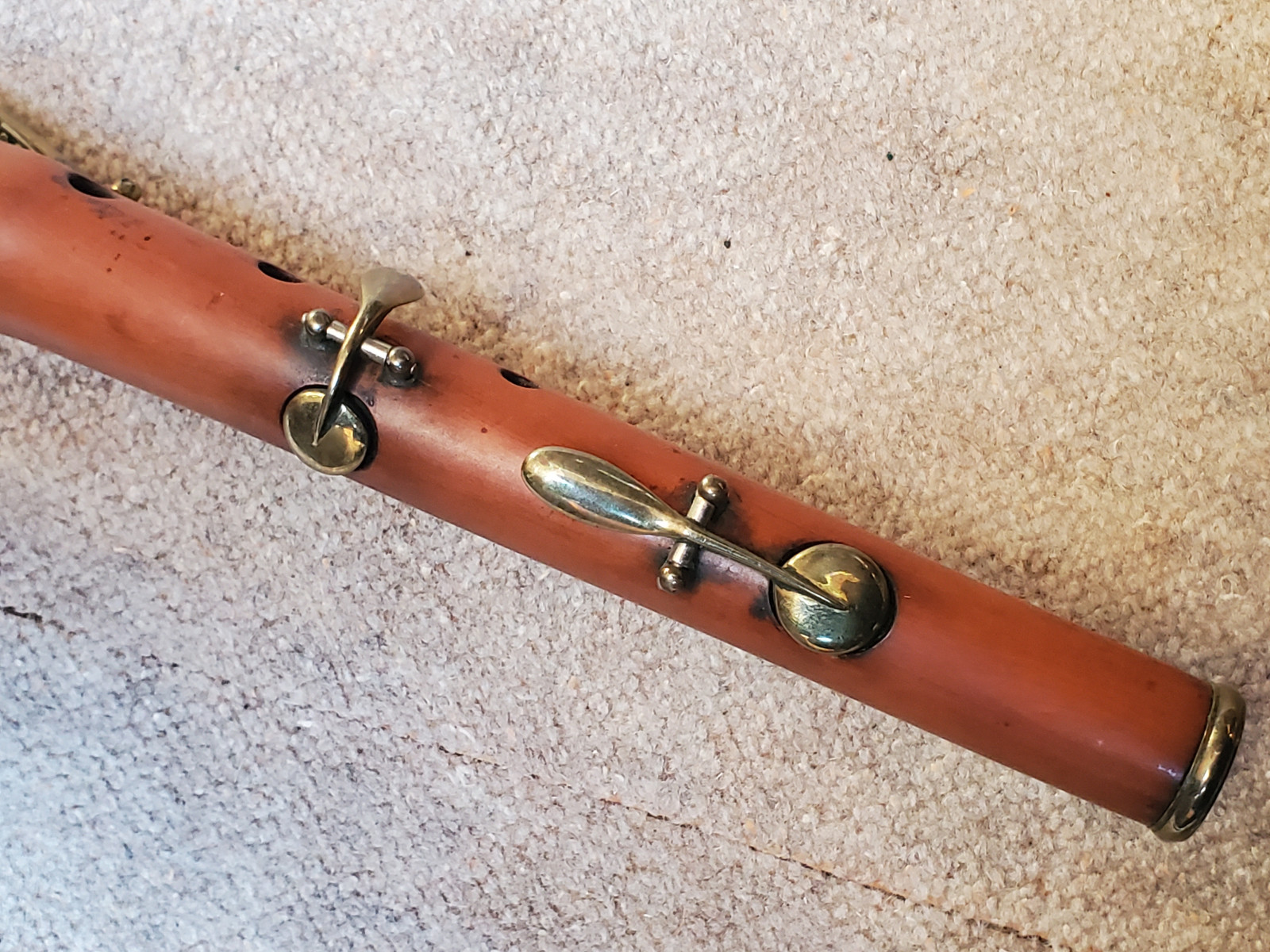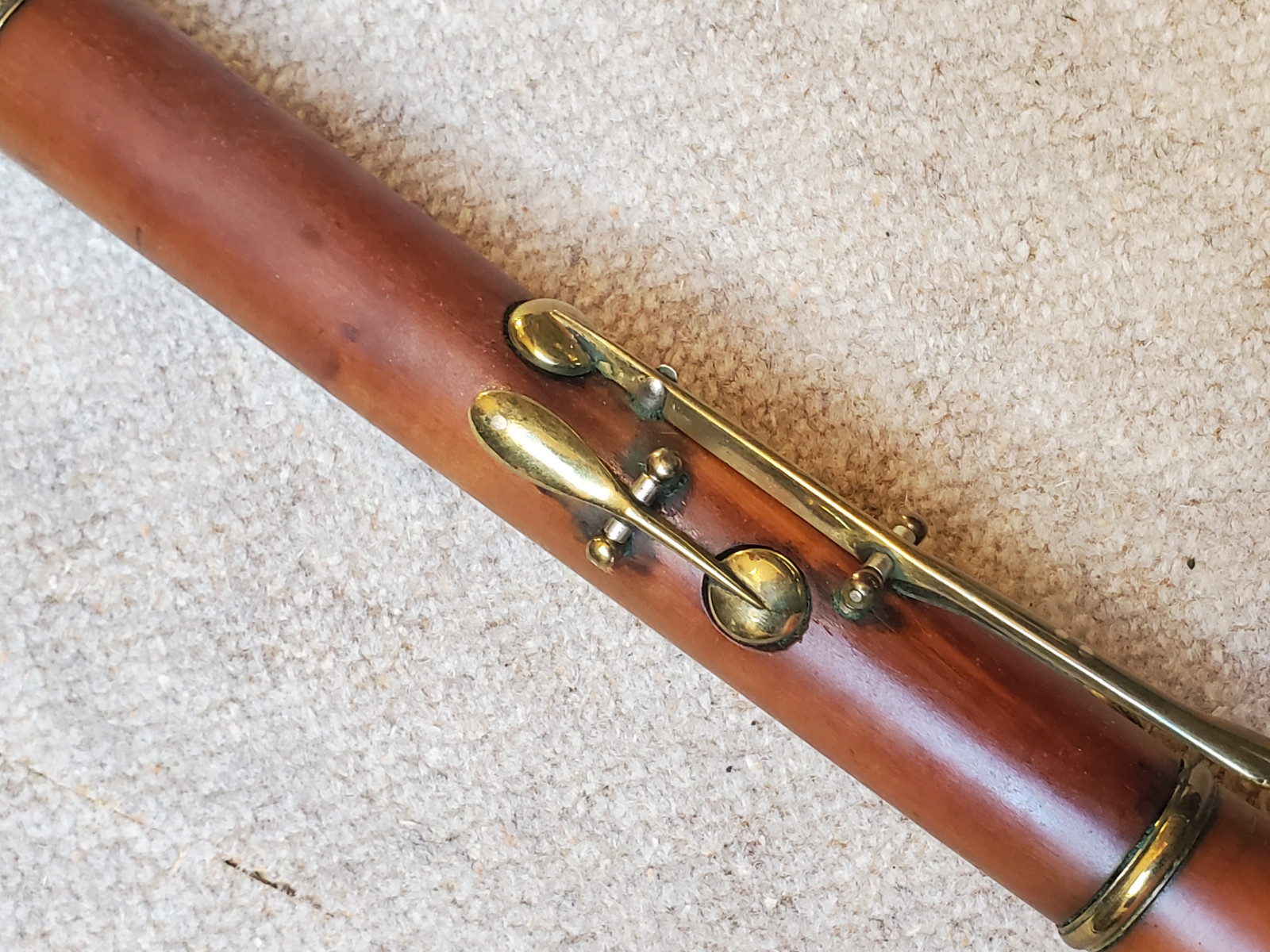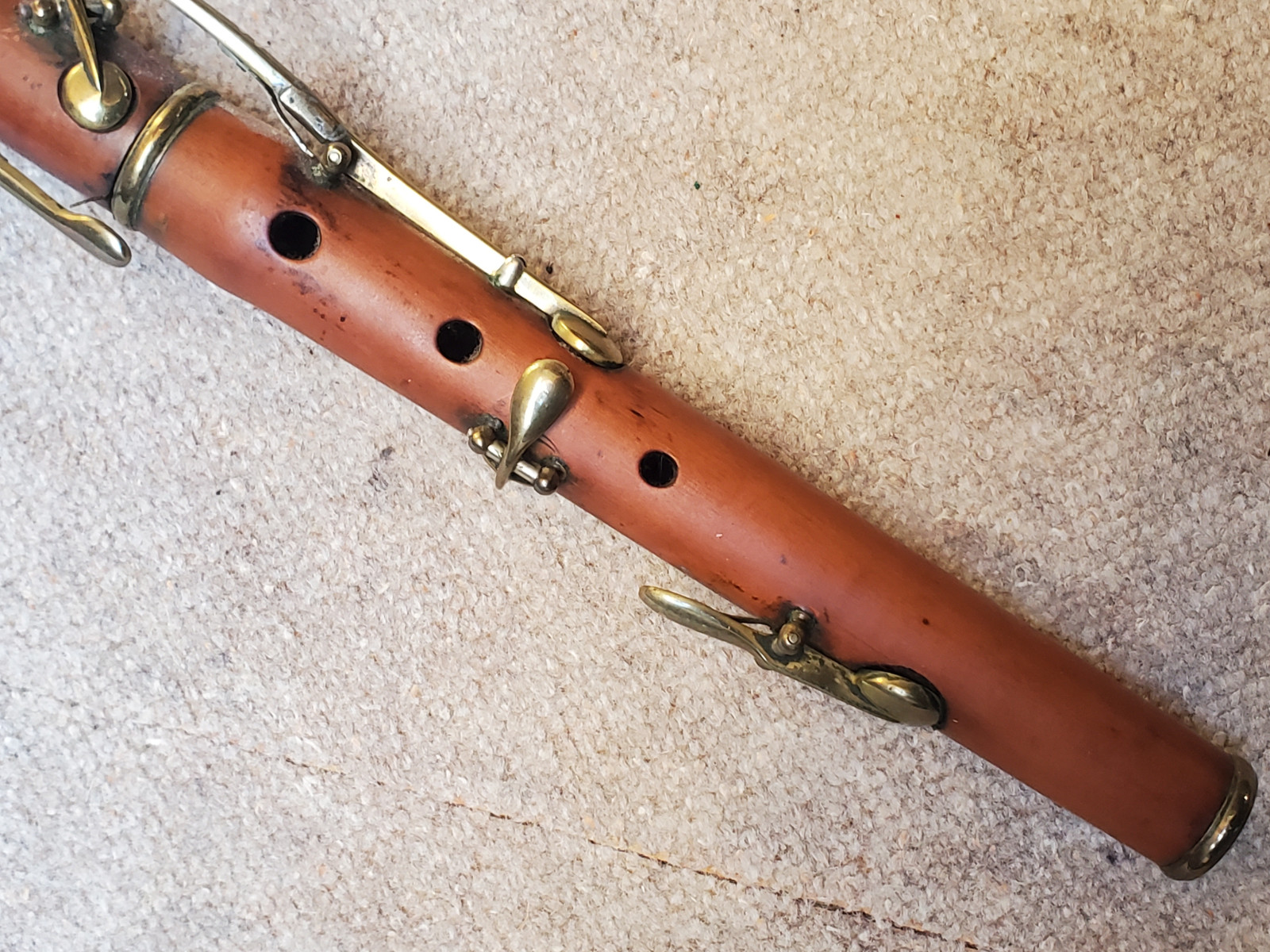 An interesting and antique flute made of brown wood. (Boxwood) It reads "Basta..." I dont know the key of the instrument. Unfortunatelly there are cracks at the head, barrel and 2nd mainpiece. There is an old repair at one of the brass keys. (see photos) Instrument needs to be repaired, cleaned, serviced and adjusted The instrument measures about 23 7/8Inch /60,5cm. The sounding length is 52,5cm (20 5/8 inches)Interesting antique instrument. Please make sure that you see all the photos. Worldwide shipping amounts to $35.