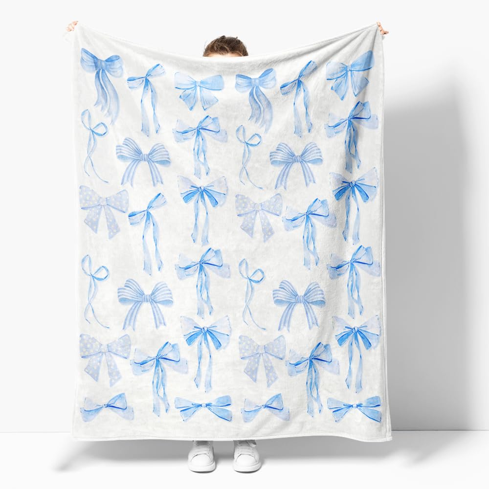 Blue Bows Blankets Preppy Coquette Room Decor Electric Blanket Girls Bedroom Decor Trendy Bow Throw Blanket Coquette Girly Blanket Gifts for Women Teens Soft Flannel Lightweight 50"x60"