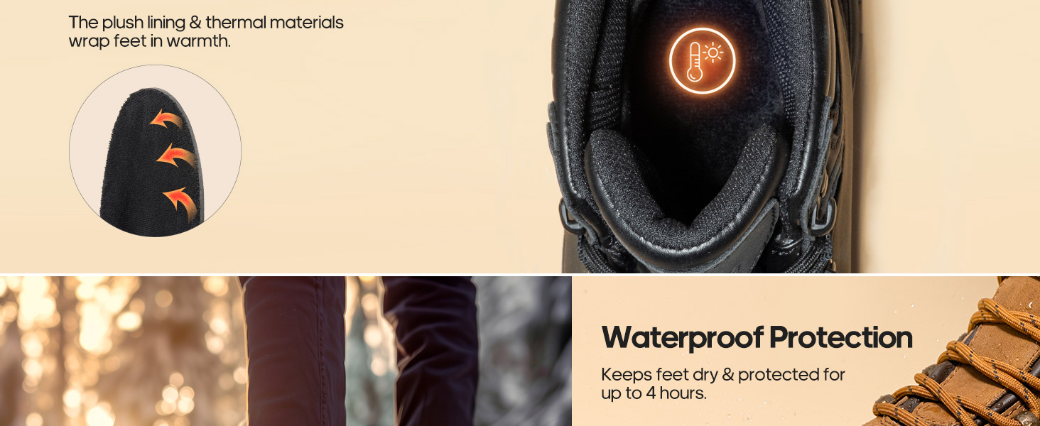 • Warm Lining: The short plush lining in these men's cold-weather boots combined with 3M thermal materials on the insole provides exceptional warmth and insulation, keeping feet cozy in cold conditions.