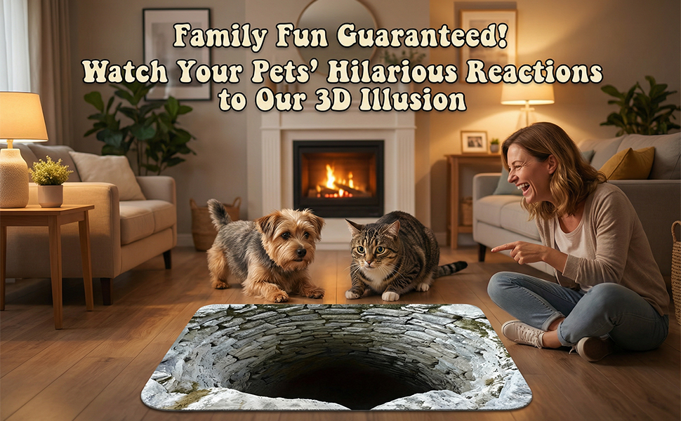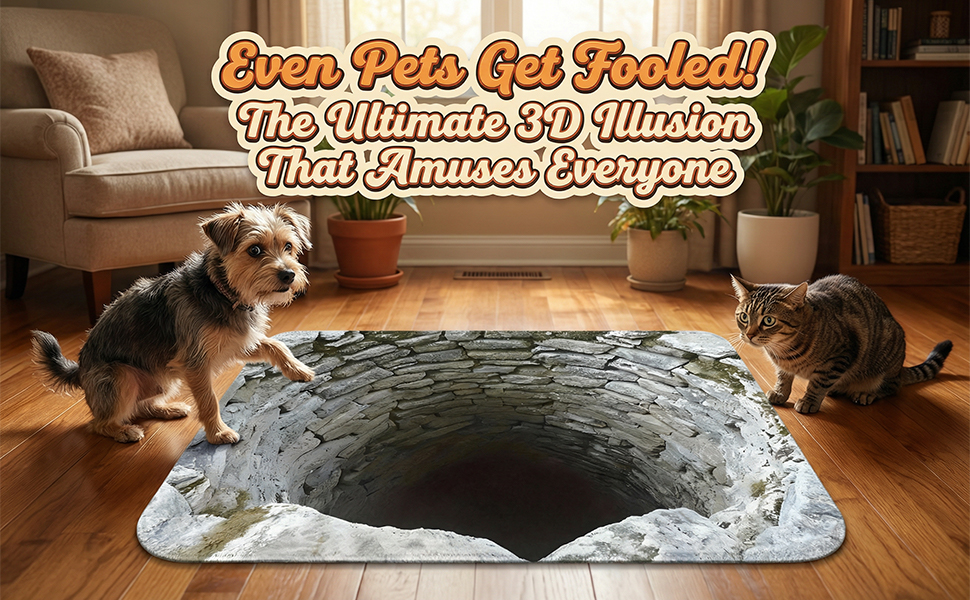 【Fun Pet Prank & Playtest】: Turn your floor into a playful challenge! This 3D optical illusion rug tricks dogs and cats into thinking they’re approaching a real hole—sparking hilarious curiosity or cautious paw-taps. It’s more than a rug; it’s instant entertainment for the whole family