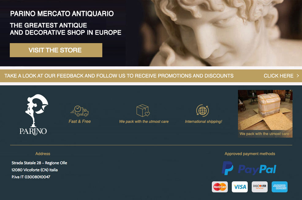 Envoi free en toute Europe. Chaque Articles East Emballé Avec La Meilleure Attention et ProfessionNalisme, Scellé à L'Intérieur de Caisses en Bois Construtes sur mesure et accompan by a certification of authentiche et guarantees ainsi que doci documentation photography. Parino Antiques market veu if distinguished en offrant free le meilurur service of emballage et envoi du maré. Une fois reçu le Payement, on effectuera the Envoi Avec Remise Front Rue.